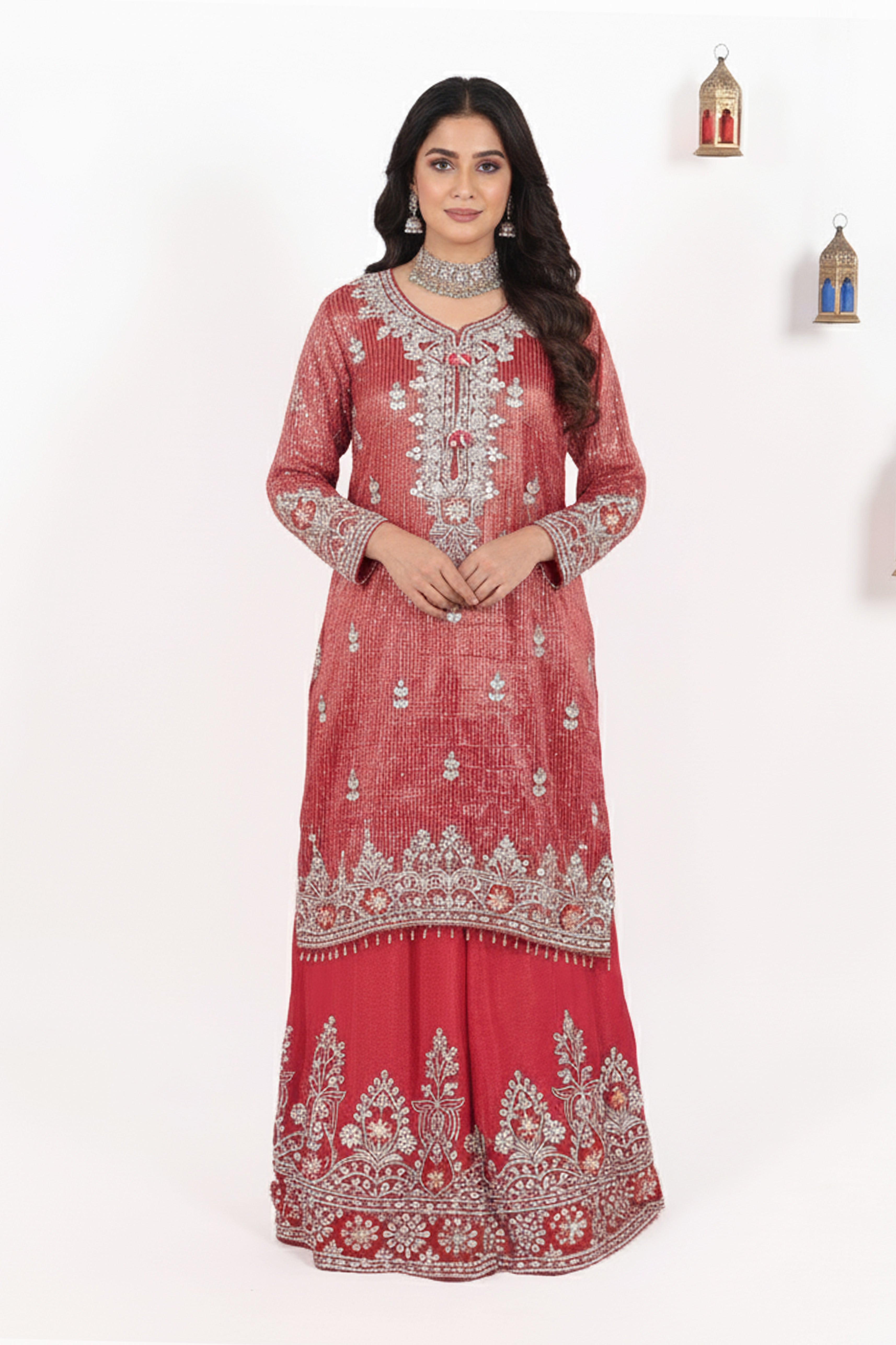 Refresh availabilityTurn heads with our Unstitched Red Brocade Sharara, a masterpiece of luxury and tradition. Crafted in premium brocade with intricate zari work, this suit set is elevated by heavy embroidery along the neckline, sleeves, and borders. The matching dupatta, adorned with delicate embroidered patterns, adds a regal finishing touch. Perfect for weddings, festive occasions, and grand celebrations, this ensemble is all about elegance with a royal flair.