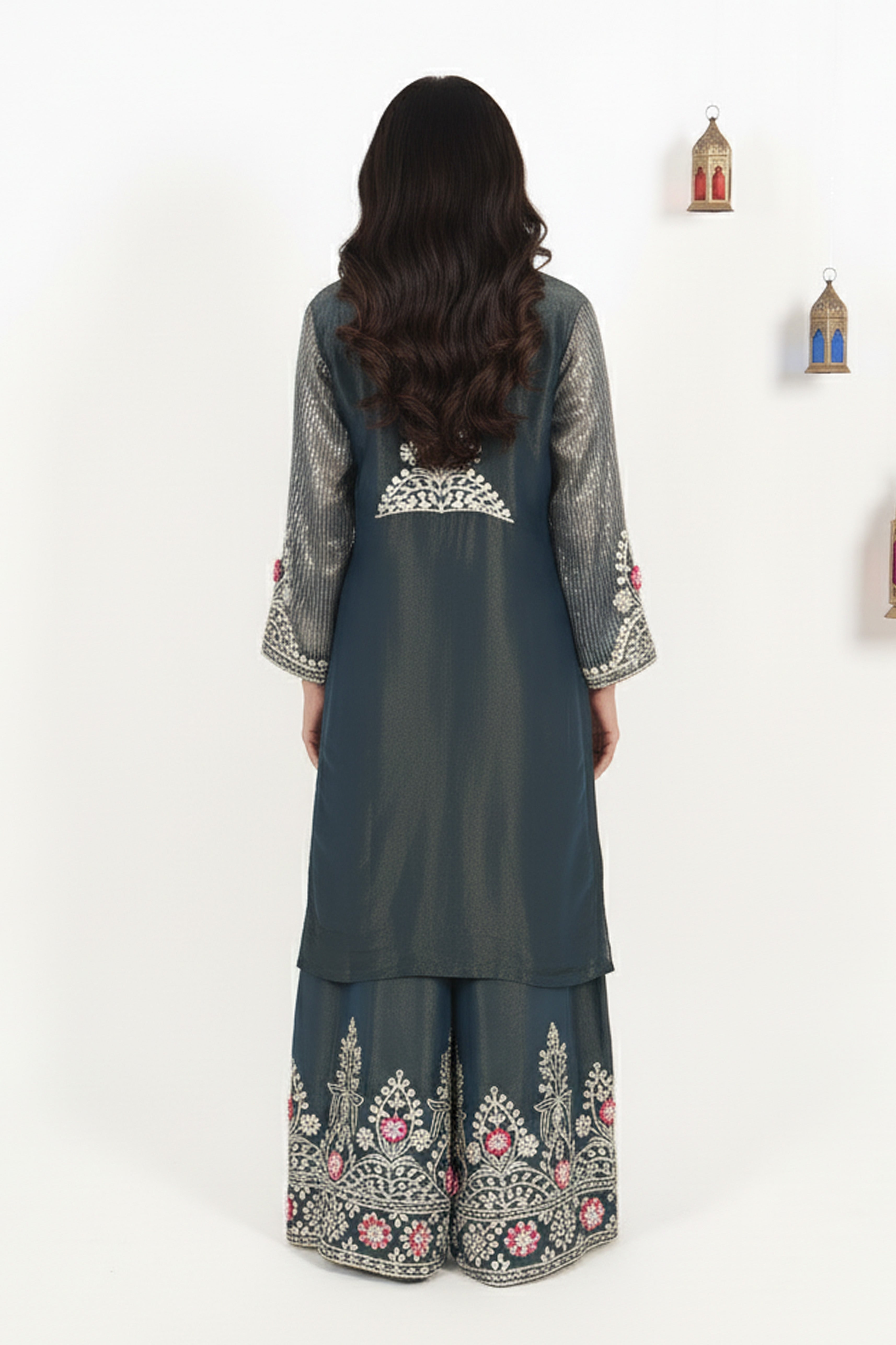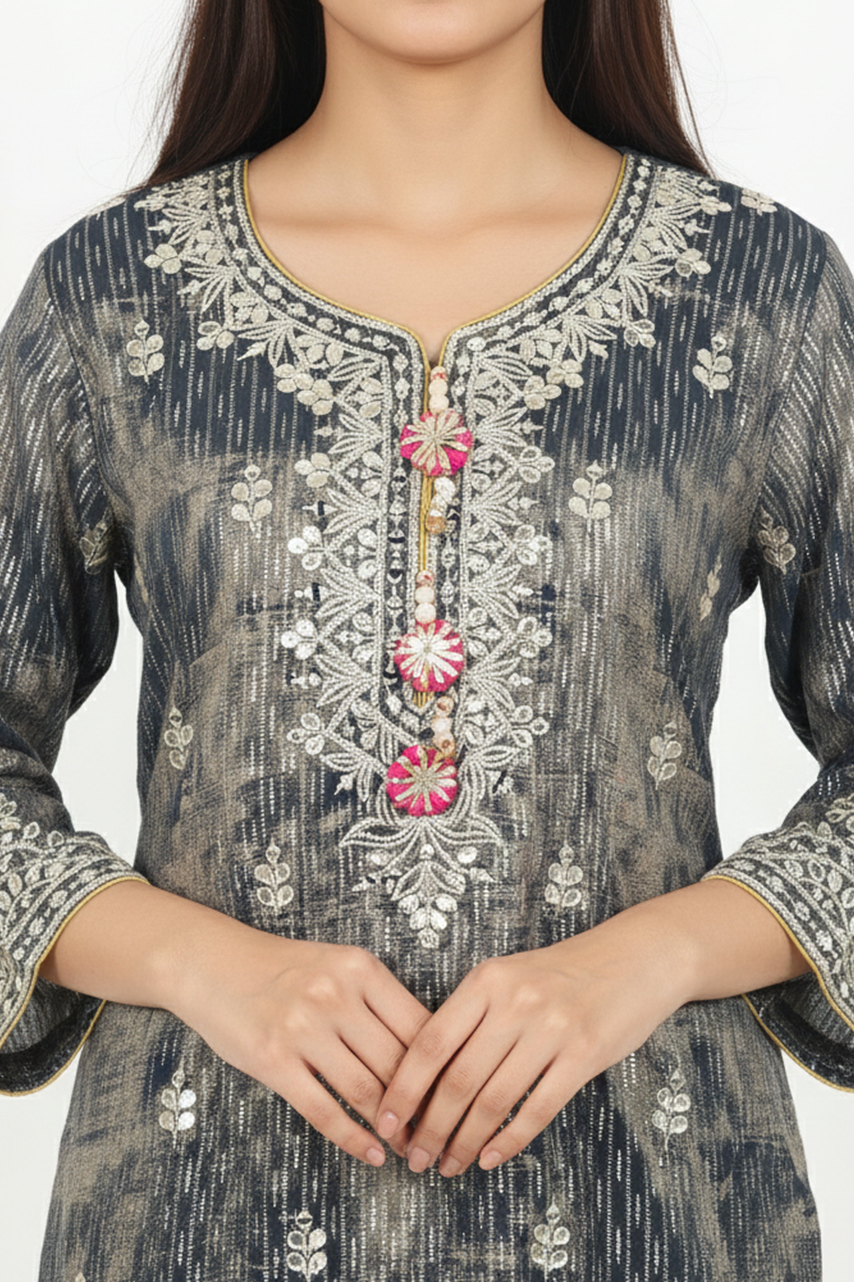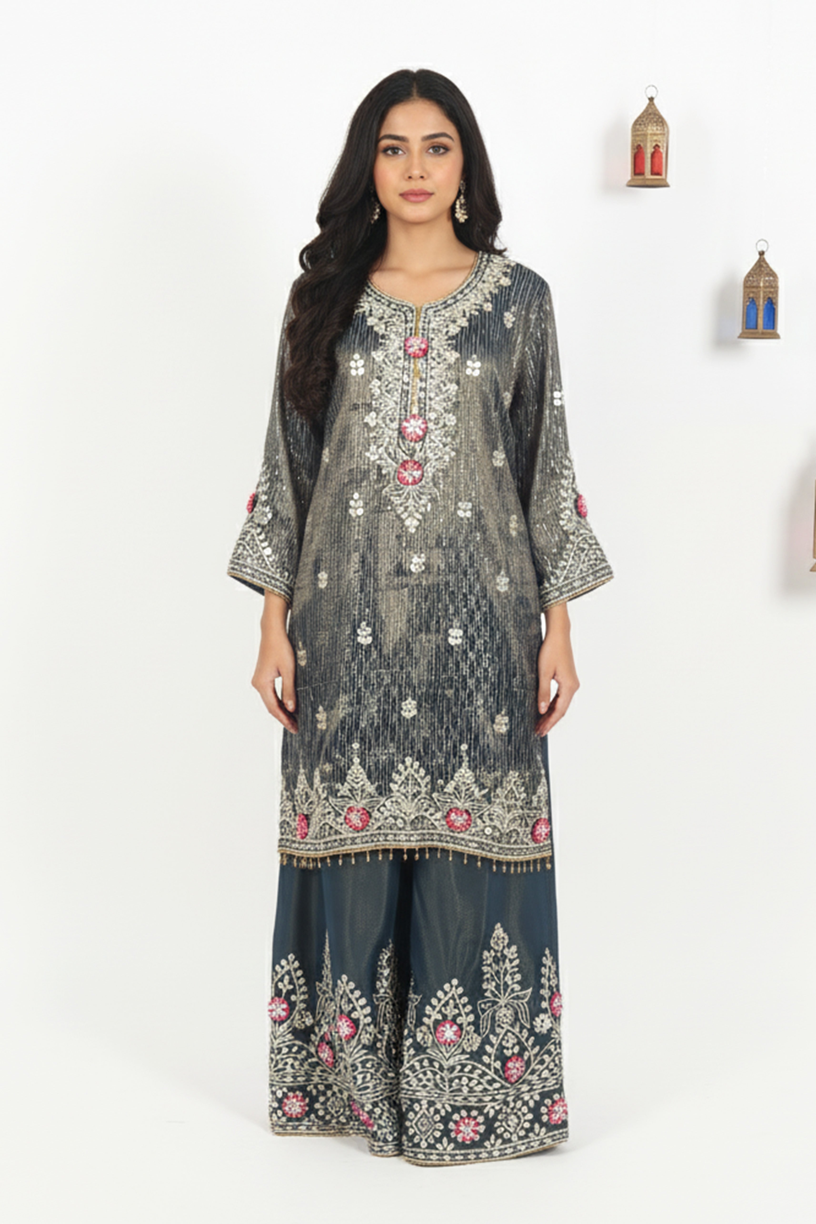 Refresh availabilityMake a regal statement with this stunning Brocade Sharara Set, crafted with heavy embroidery that exudes sophistication and charm. The navy-toned kurta is beautifully accentuated with intricate silver and pink threadwork, paired with a richly embroidered brocade sharara for a truly luxurious appeal.
