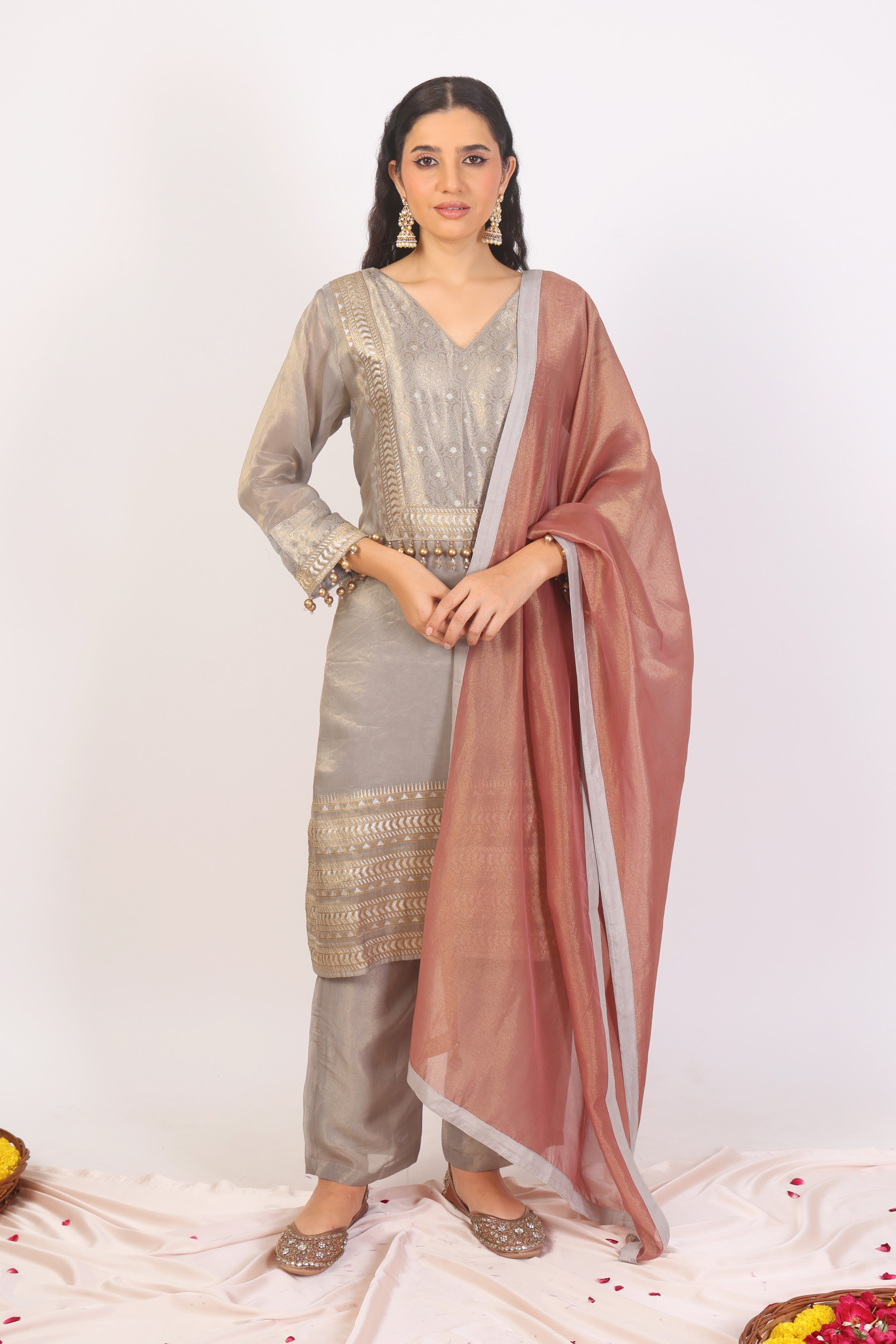 Refresh availabilityElevate your wardrobe with this Tissue Suit Set paired with a vibrant Mustard Yellow Dupatta. Crafted for comfort and style, the suit features a delicate tissue fabric that offers a lightweight, smooth texture perfect for both casual and festive occasions. The mustard yellow dupatta adds a warm, lively contrast, enhancing the overall elegance and making it a versatile choice for various events. This set combines traditional charm with modern appeal, ensuring you stay effortlessly graceful and confident.