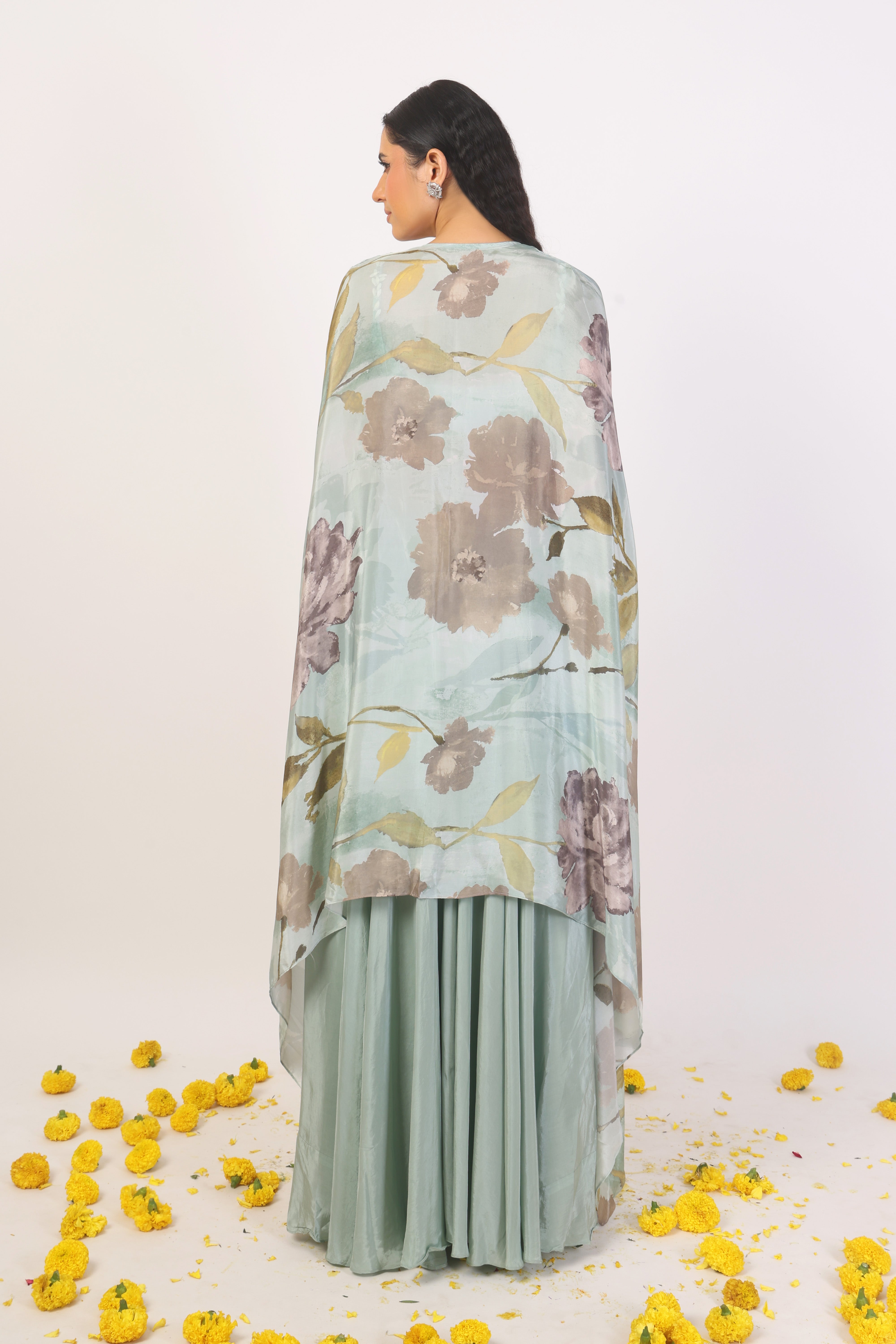 Refresh availabilityTurn heads at any celebration with this chic and contemporary ensemble. The outfit features a beautifully designed crop top paired with a flowy gharara, giving a perfect blend of traditional charm and modern flair. The highlight is the elegant cape overlay, adding a touch of drama and sophistication to the look. Lightweight, graceful, and effortlessly stylish, this set is ideal for festive occasions, weddings, or cocktail nights where you want to shine with minimal effort and maximum impact.