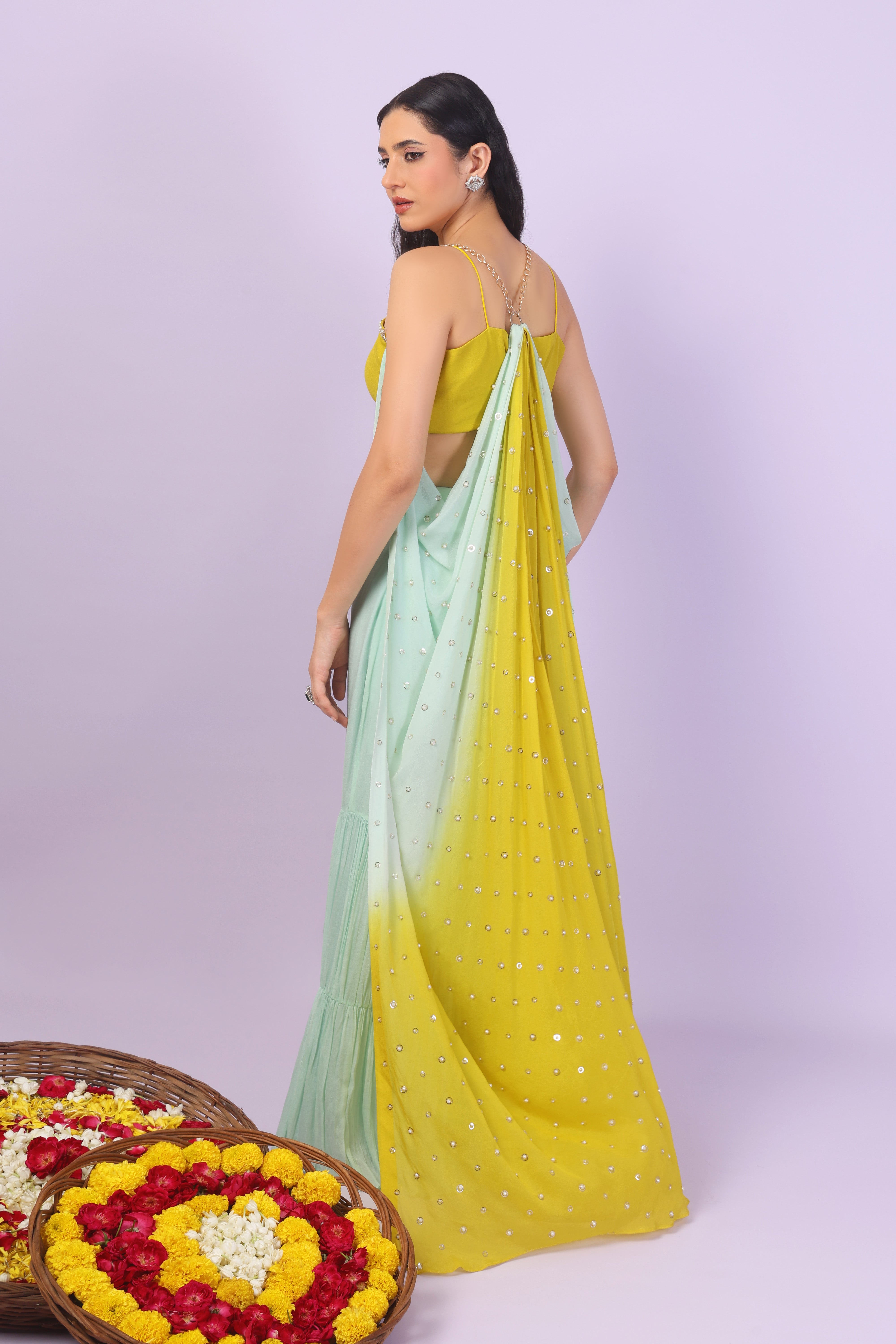 Refresh availabilityElevate your ethnic wardrobe with this Crop Top Sharara featuring a coordinating cape. The structured crop top pairs elegantly with the wide-legged sharara pants, offering both comfort and style. The flowing cape adds a contemporary dimension, perfect for festive occasions or weddings. Expertly crafted to blend traditional and modern silhouettes, this ensemble ensures a poised and sophisticated look.