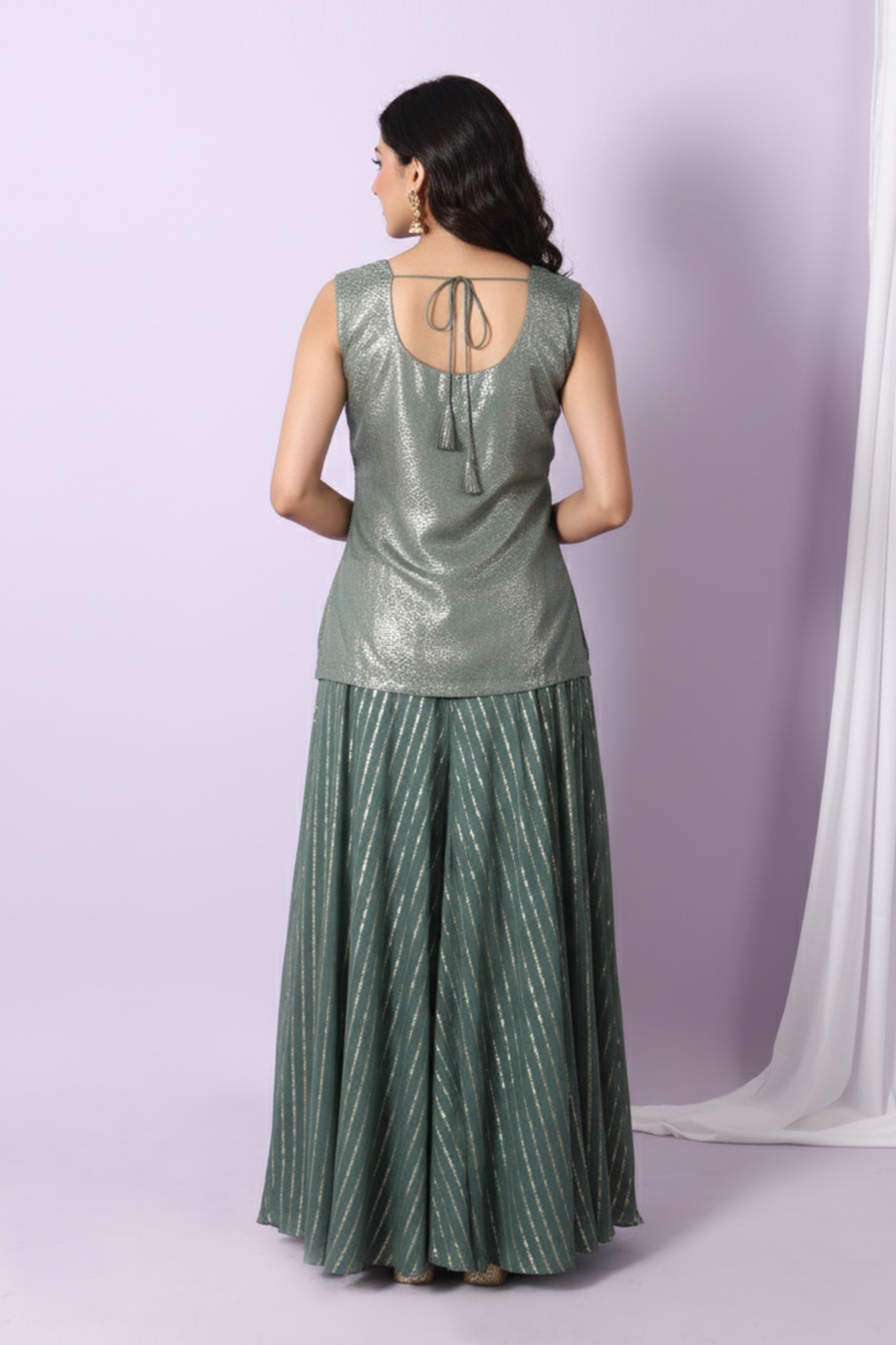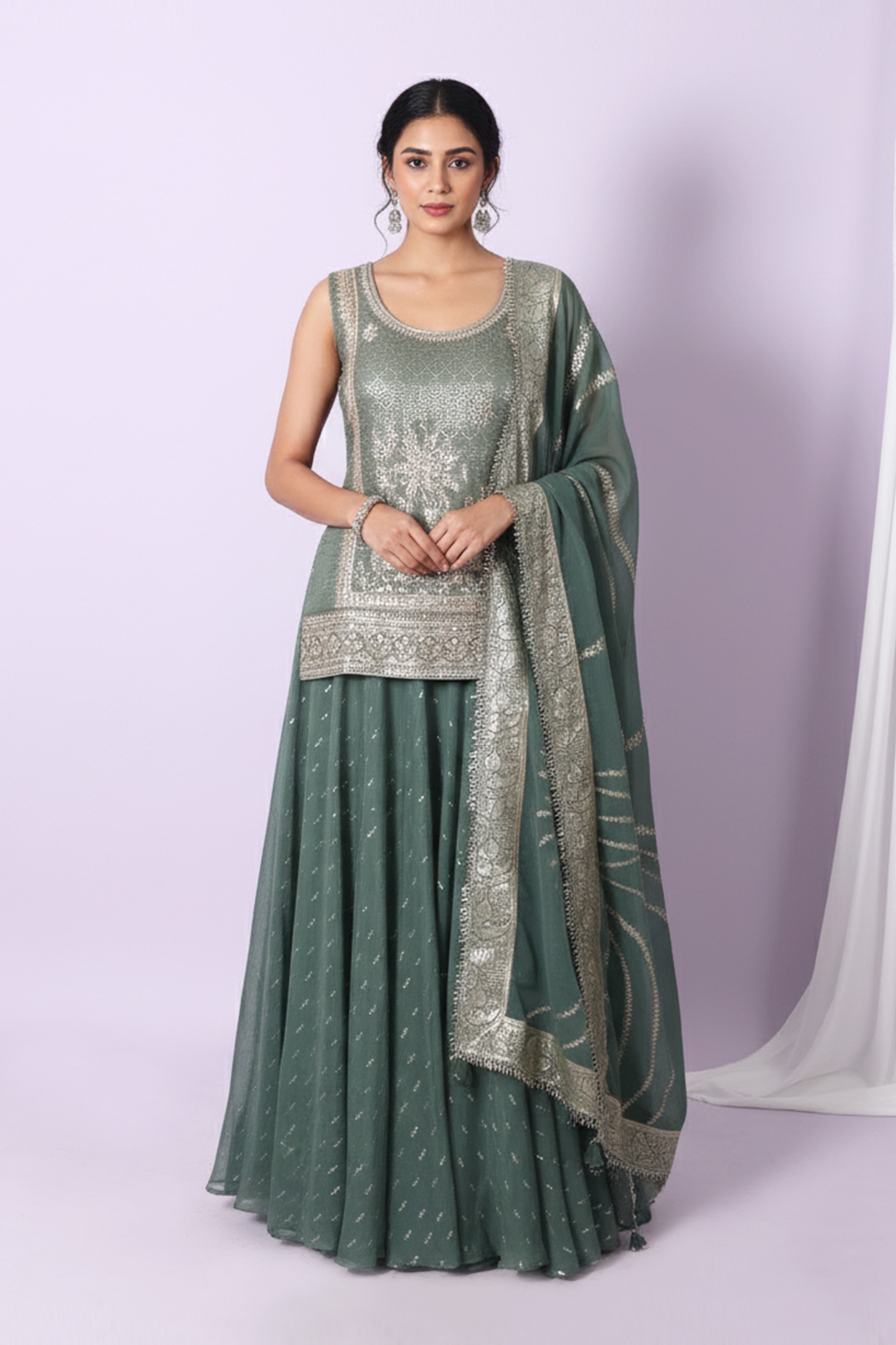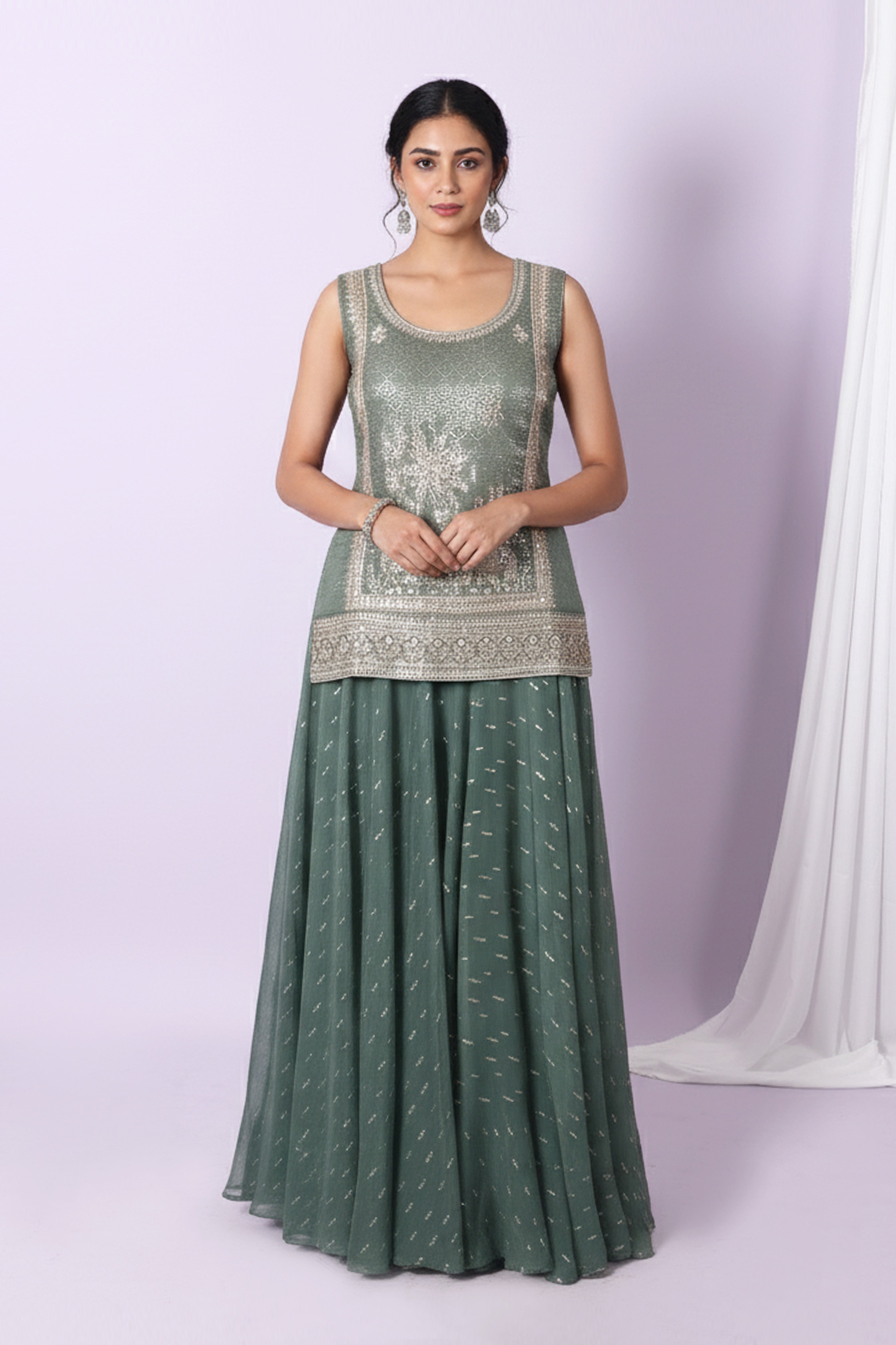 Refresh availabilityGrace meets tradition in this stunning sharara set, beautifully crafted with intricate silver thread embroidery. The sleeveless kurta features a delicate round neckline adorned with shimmering motifs, paired with a flowy sharara that adds effortless charm. Completing the look, the matching dupatta is detailed with ornate borders and tassel accents, making it perfect for festive celebrations, weddings, and special occasions.