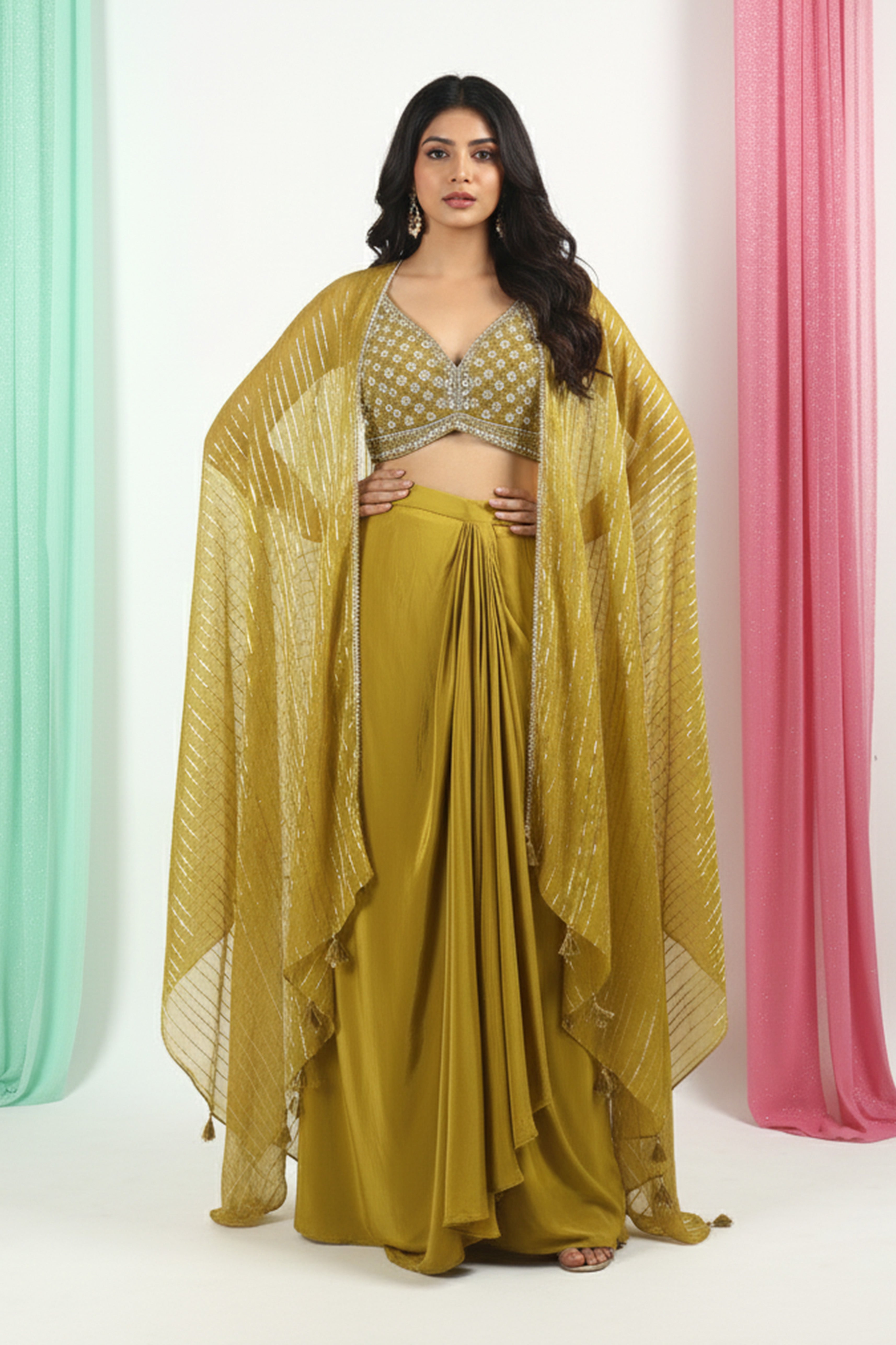 The look is completed with a lightweight embellished dupatta, featuring delicate shimmer accents and tassel edging — adding flair and sophistication to the entire ensemble. Perfect for sangeet nights, mehendi functions, cocktail parties, festive dinners and destination celebrations, this outfit blends contemporary design with traditional charm.