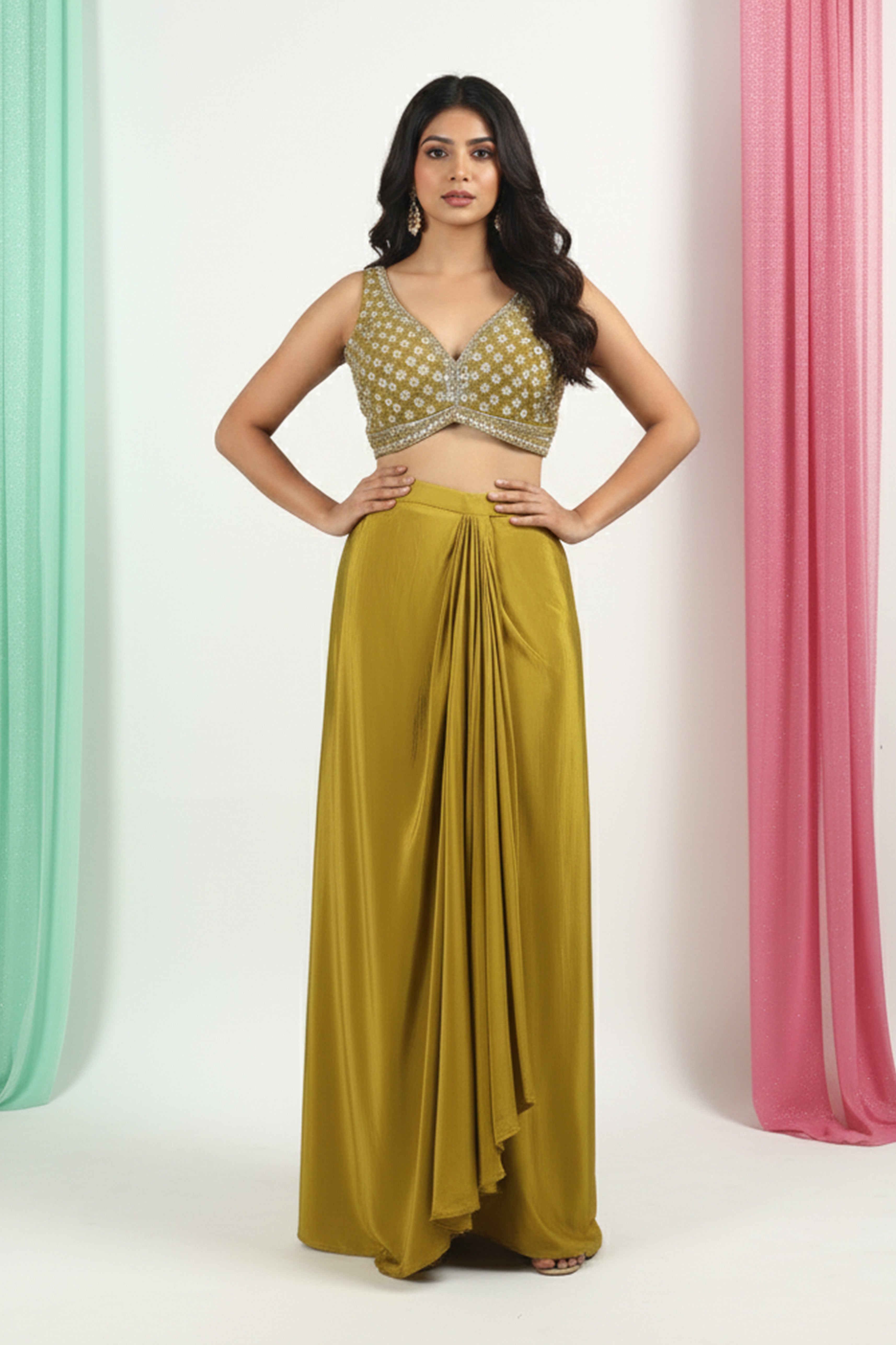 Refresh availabilityMake a chic festive statement with our Embellished Dhoti Set With Dupatta, crafted for the modern woman who loves comfort with glamour. The intricately embellished blouse adds a touch of sparkle and elegance, beautifully paired with a draped dhoti bottom that offers effortless style and graceful movement.