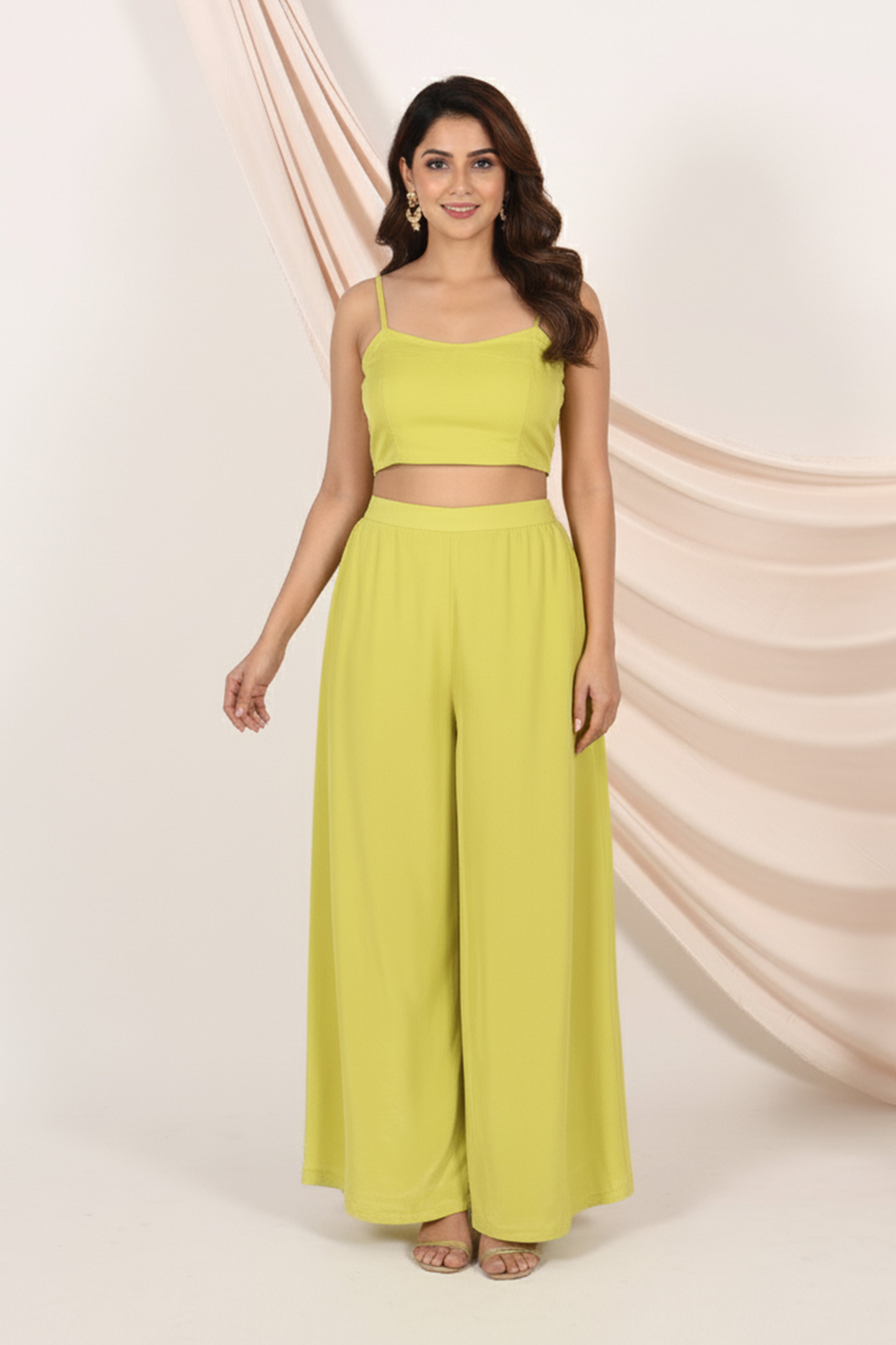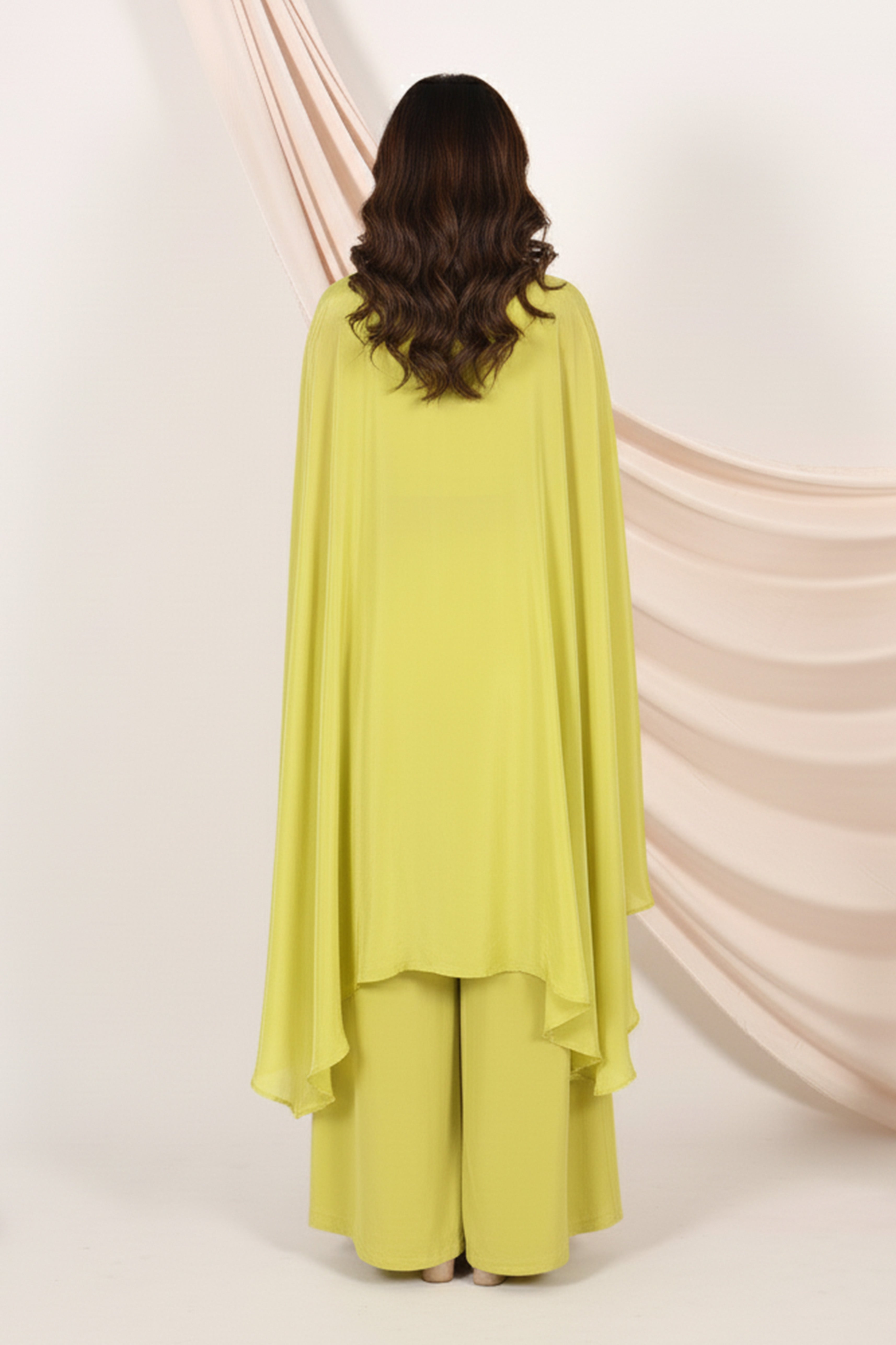 Refresh availabilityRadiate elegance in this refreshing cape set, crafted in a soft, flowy fabric that drapes gracefully. The ensemble features a front-open asymmetrical cape adorned with intricate silver embroidery along the neckline and front panel, paired with wide-leg pants for a breezy, modern silhouette. Effortlessly blending comfort and sophistication, this outfit is perfect for festive luncheons, mehendi functions, or evening celebrations. Style it with statement earrings and heels for a refined, contemporary look.