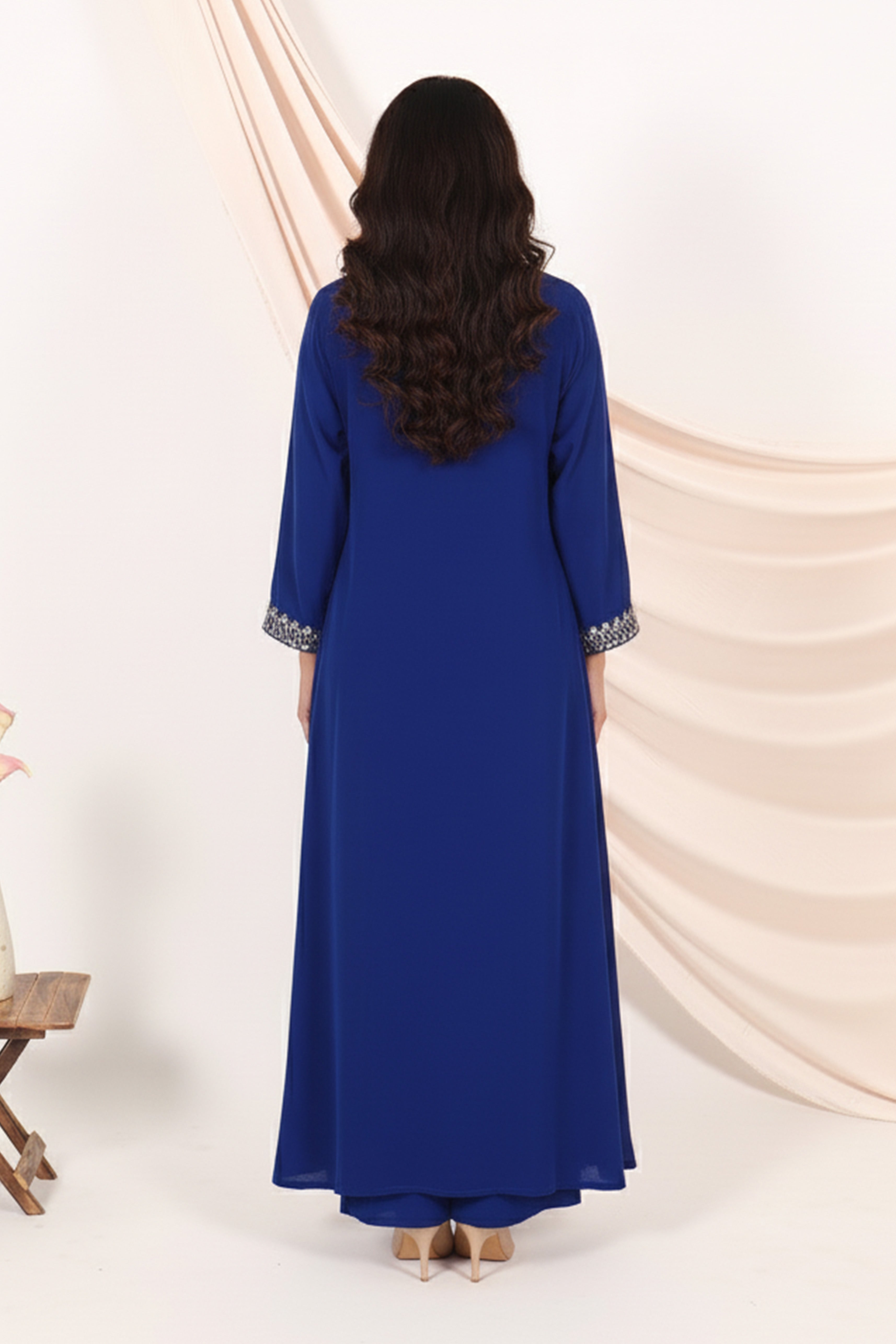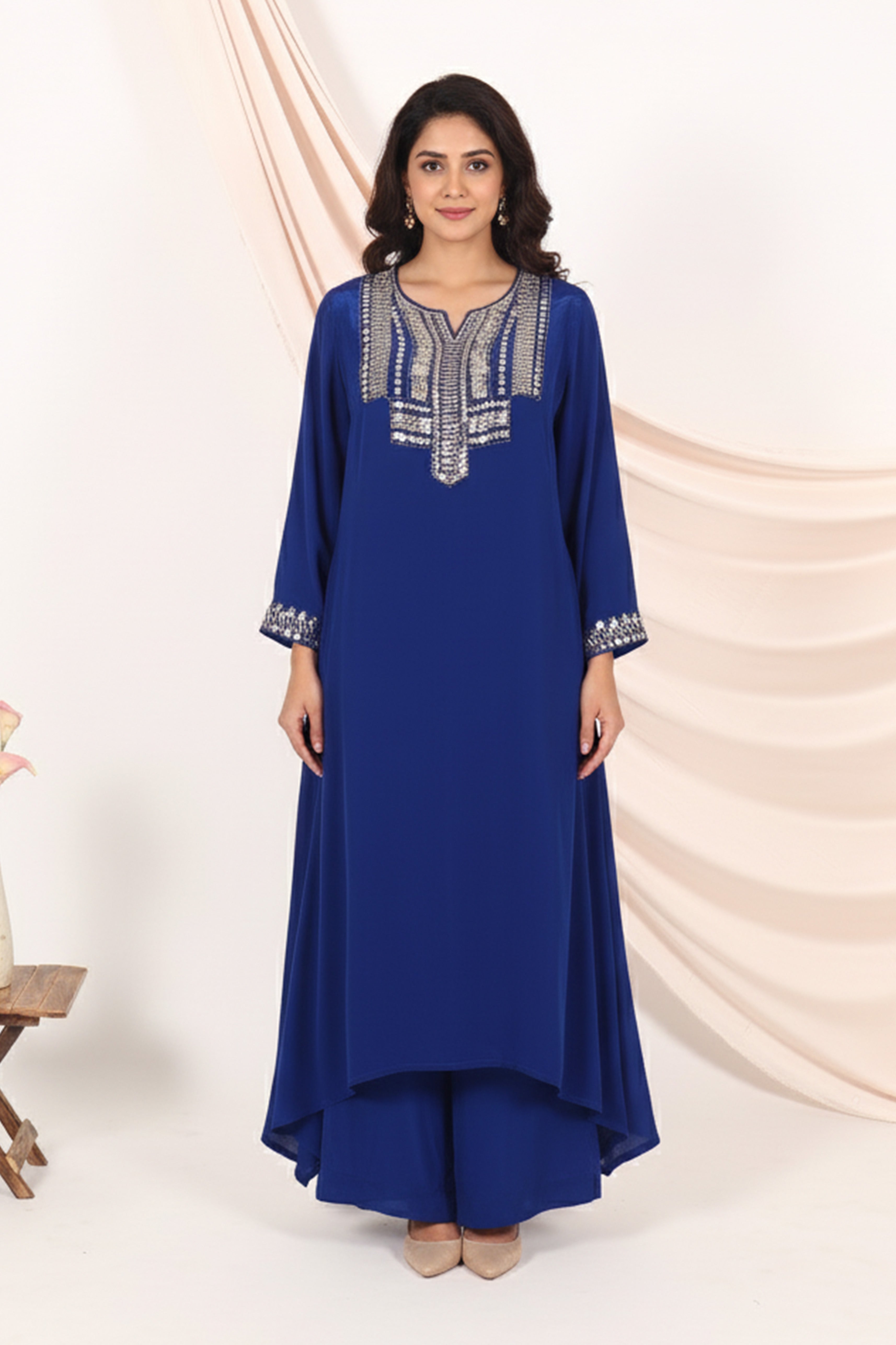 Refresh availabilityMake a graceful statement in this kurta set featuring elegant silver thread and mirror embroidery along the neckline and sleeves. The asymmetric hemline adds a modern touch to its traditional silhouette, paired with matching straight-fit pants for a polished look. Crafted from a soft, flowy fabric, this ensemble blends comfort with regal sophistication — perfect for festive occasions, family gatherings, or evening events. Style it with statement earrings and heels to complete the look.