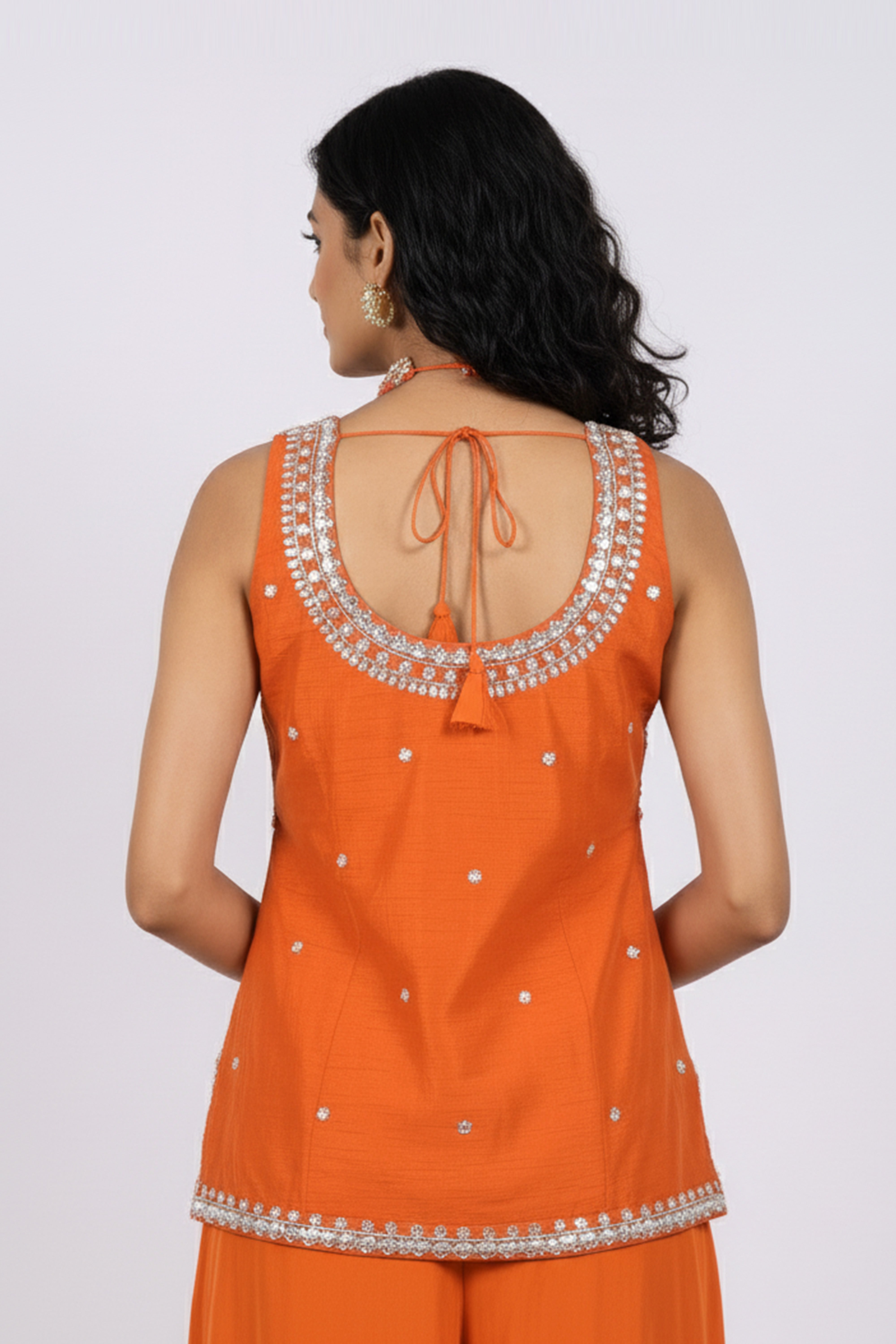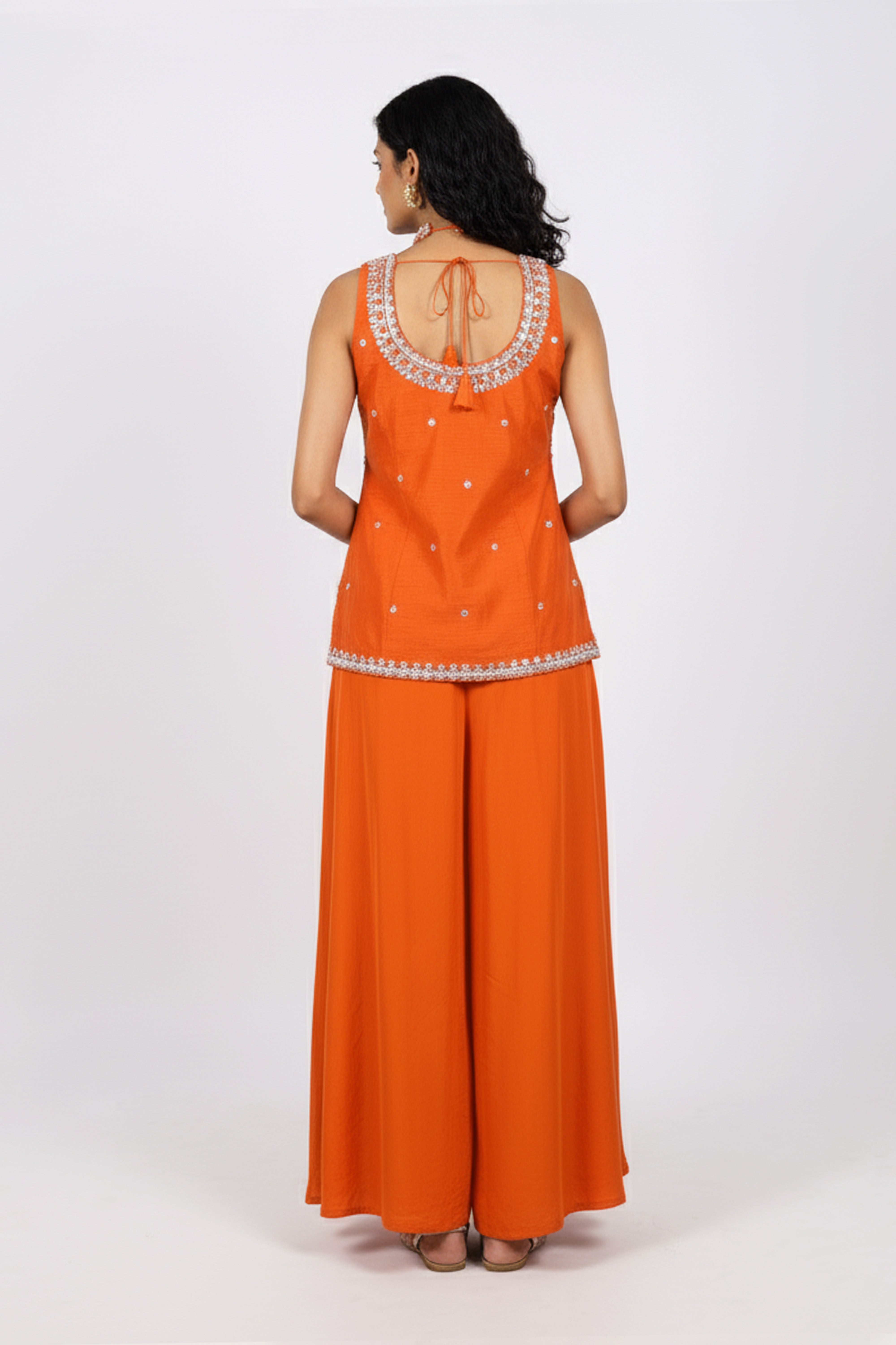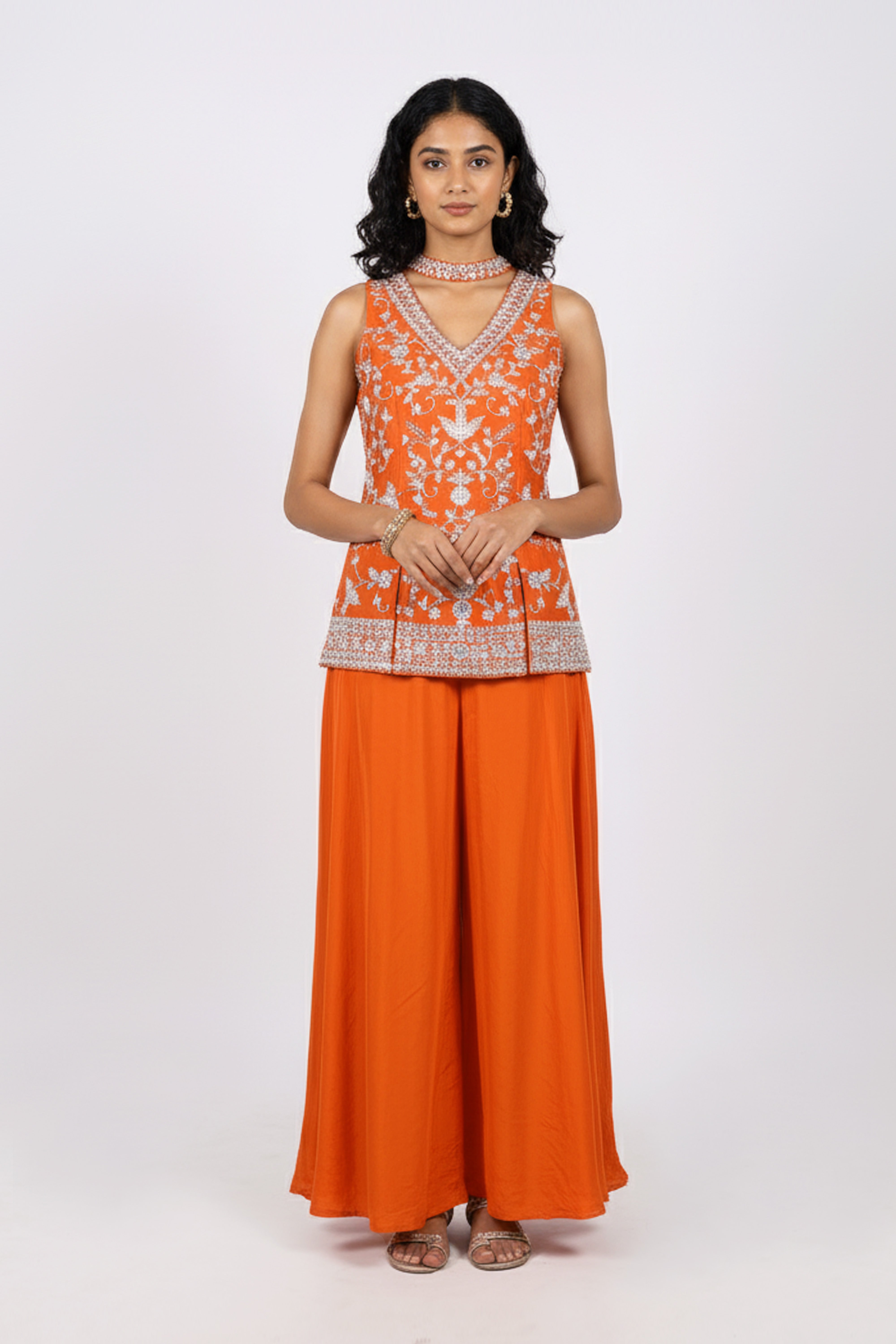 Refresh availabilityRadiate festive elegance in this Embroidered Peplum Sharara Set, a vibrant ensemble that perfectly blends tradition with a touch of modern flair. The sleeveless peplum top is intricately adorned with delicate thread and sequin embroidery, while the flared sharara pants add a graceful flow to the look. Designed for festive celebrations, weddings, or special occasions, this outfit captures effortless charm with its bold hue and refined craftsmanship.