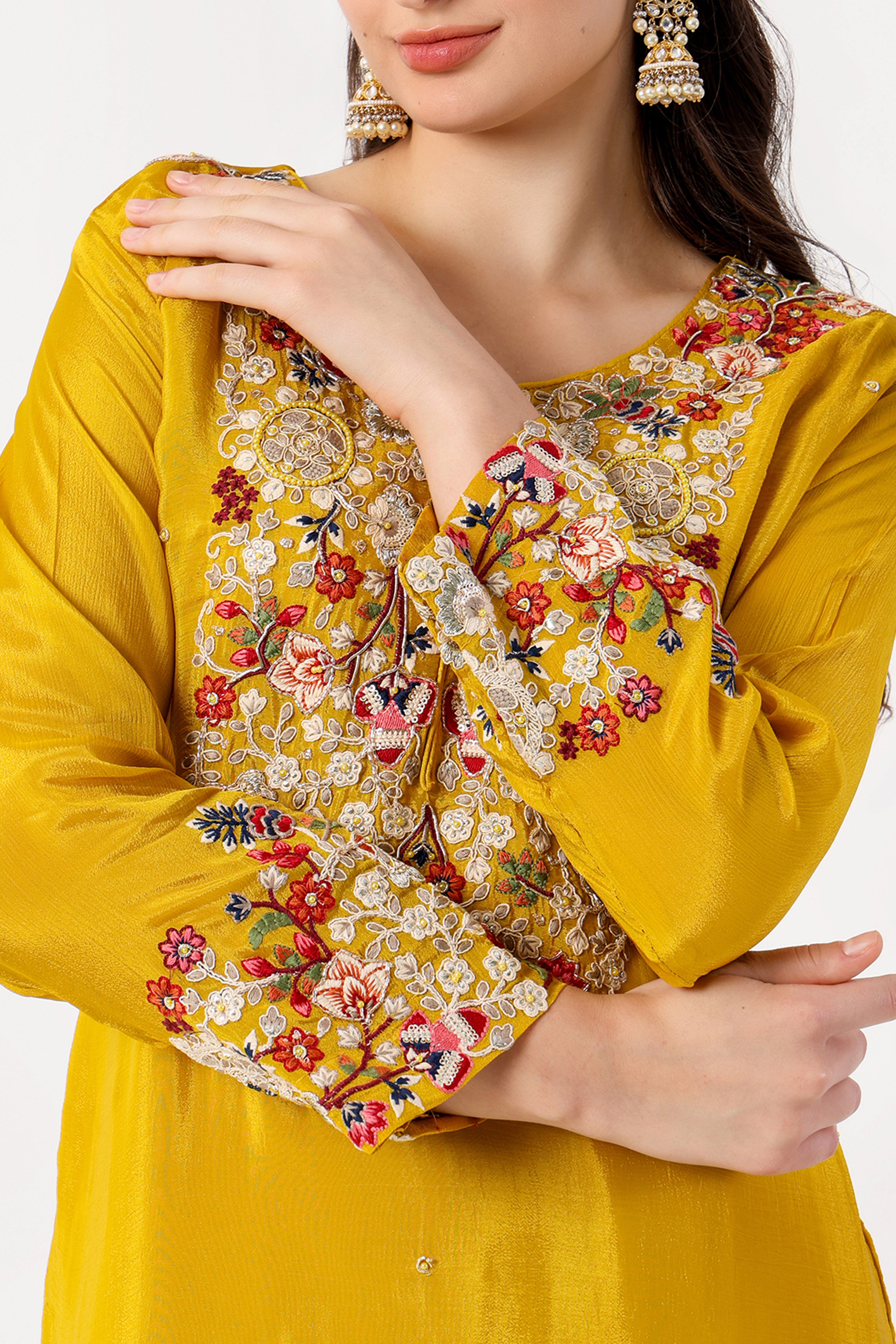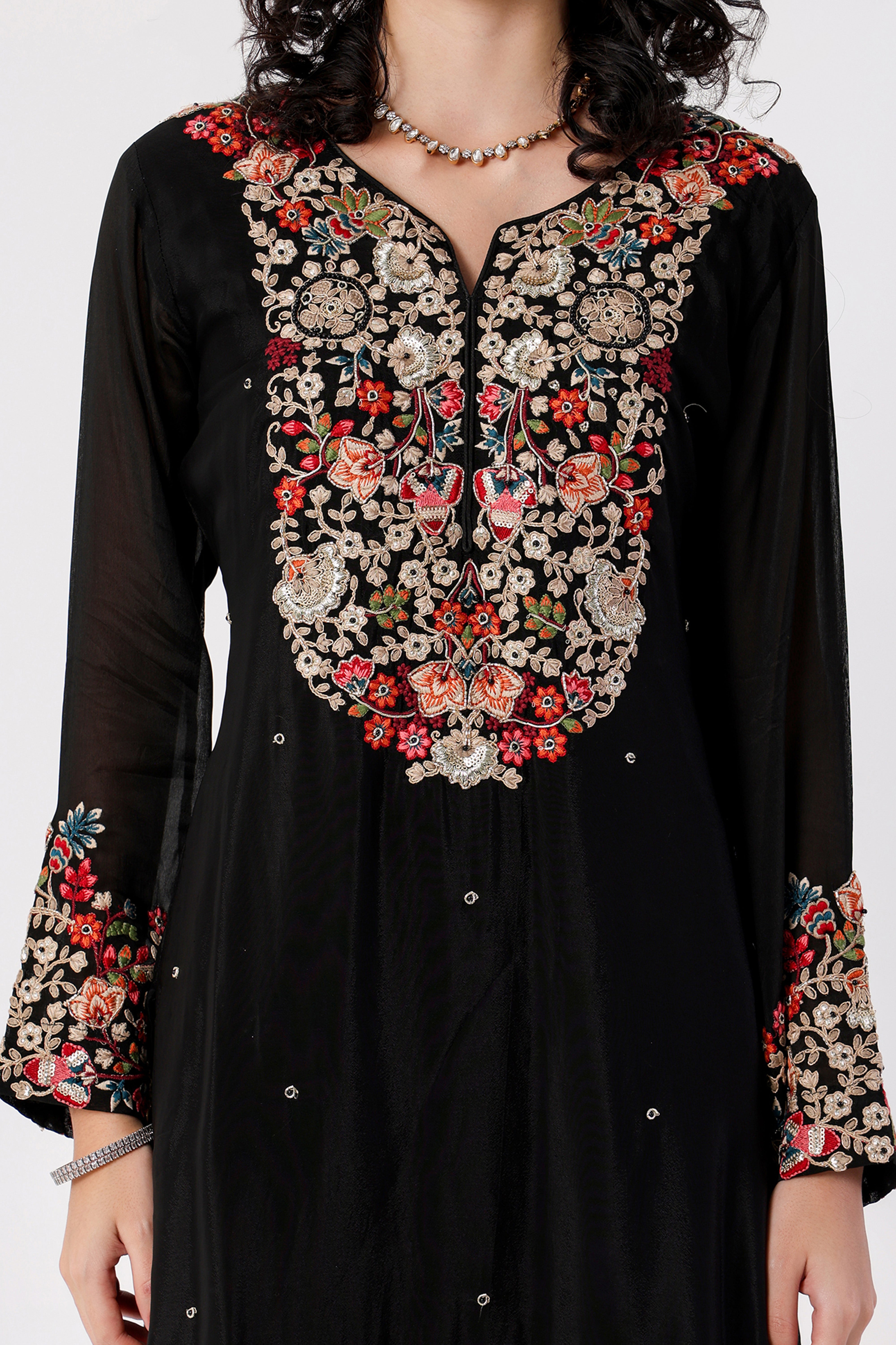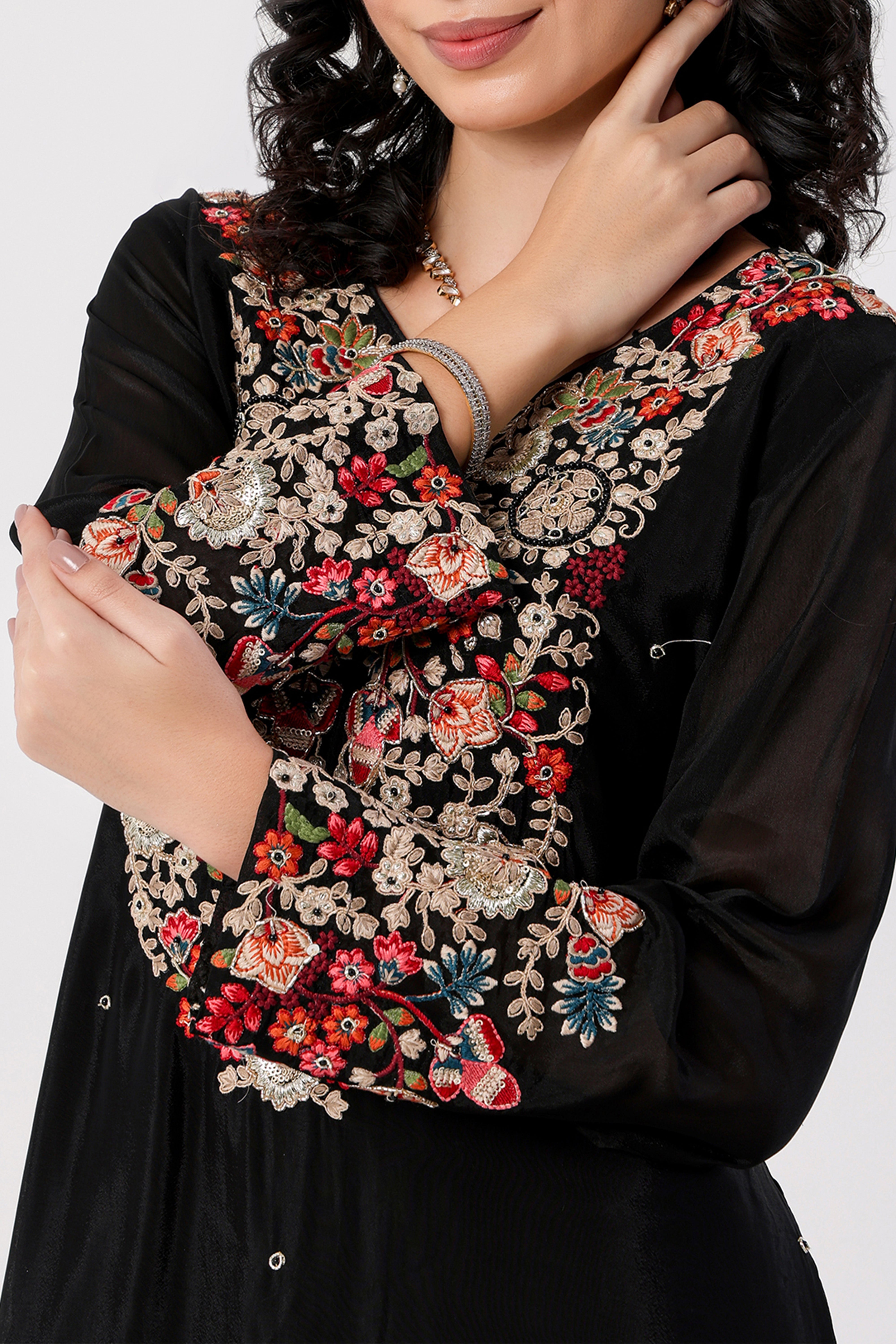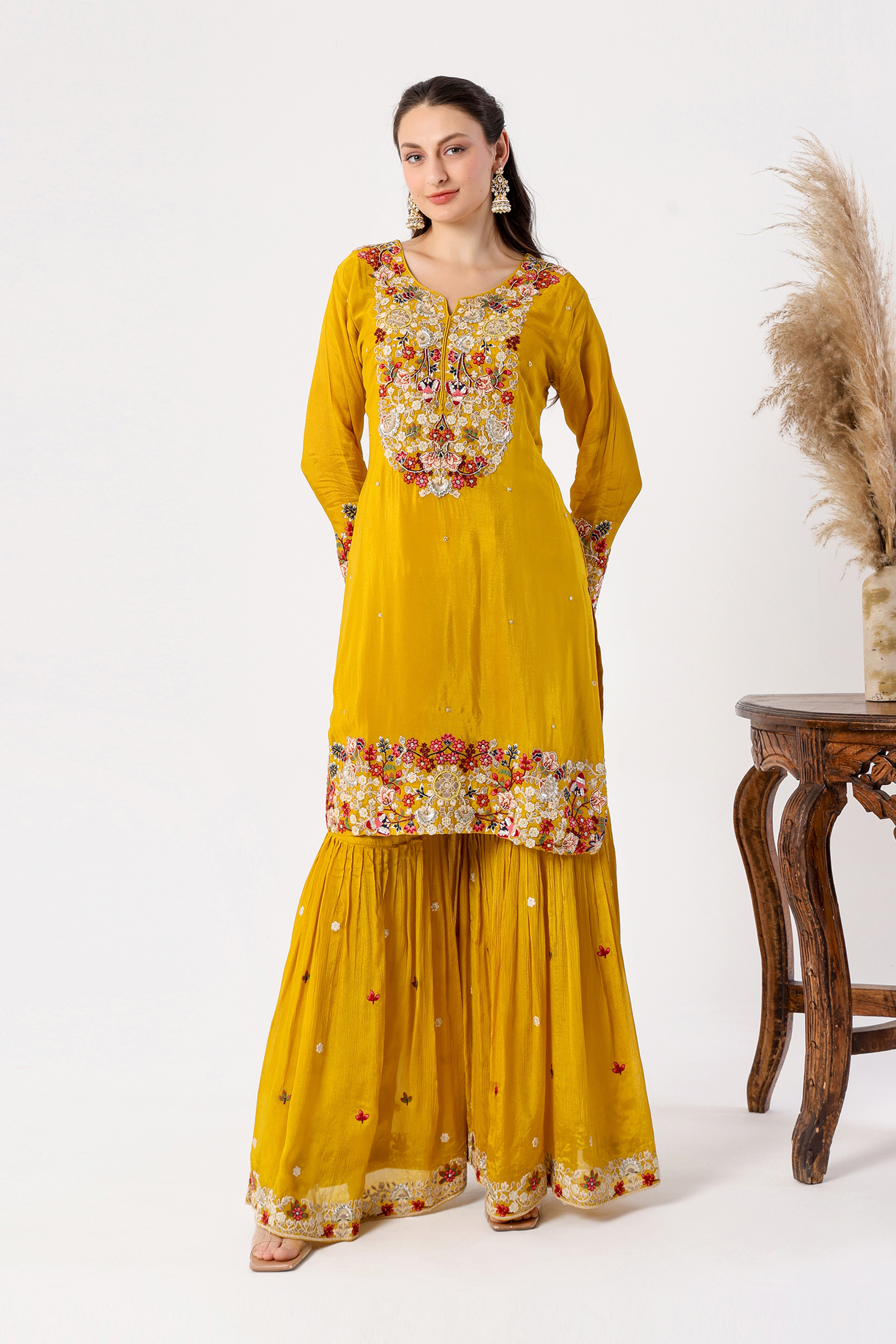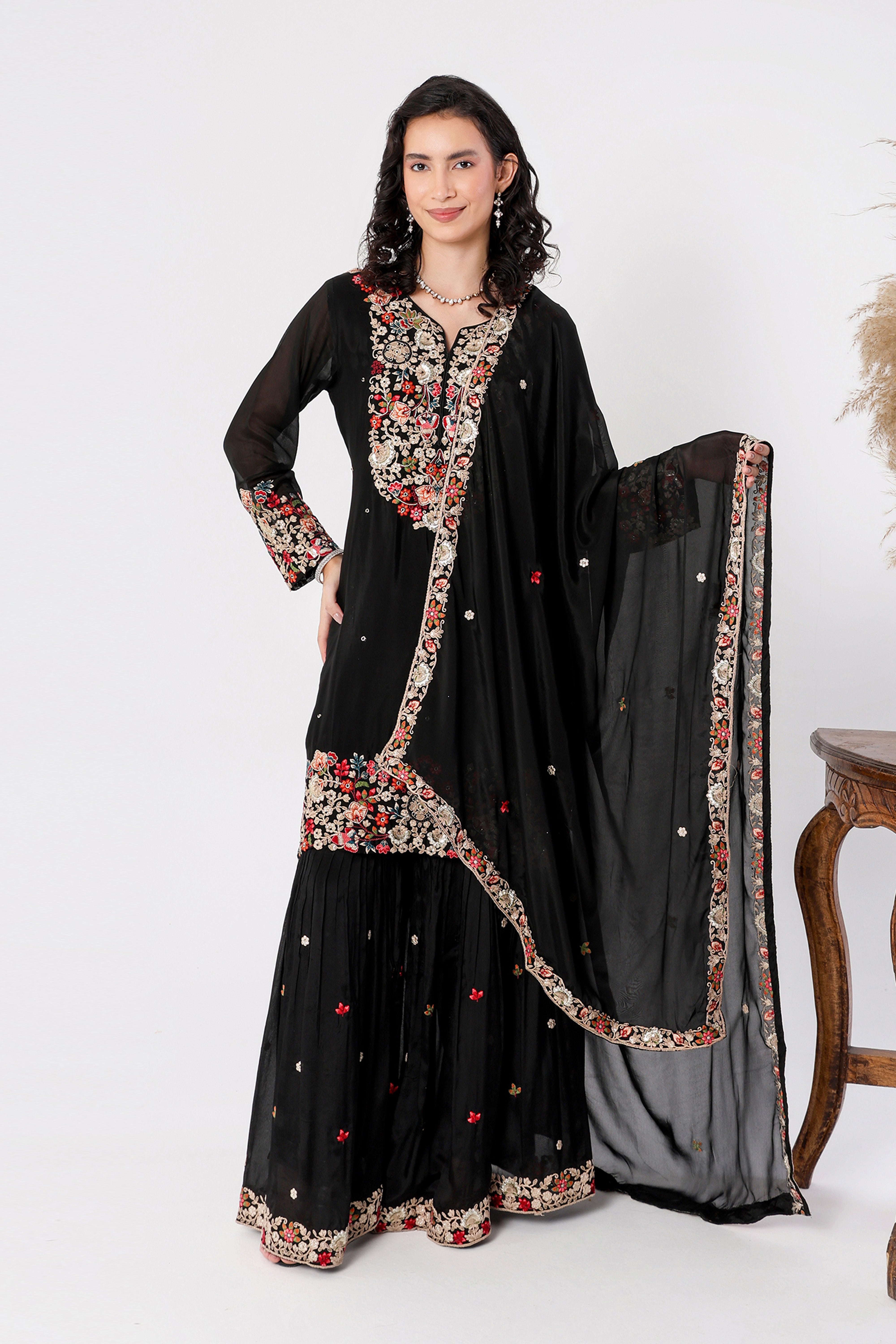 Refresh availabilityRadiate festive elegance in this stunning sharara set. The kurta features intricate thread and zari embroidery highlighted with vibrant floral motifs along the neckline, hem, and sleeves. Crafted from luxurious silk-blend fabric, it exudes a rich sheen and graceful fall. The flared sharara is adorned with delicate butti embroidery and a coordinated embroidered border, completing the look with charm and sophistication. Pair it with statement earrings and juttis for weddings, sangeet functions, or festive celebrations.
