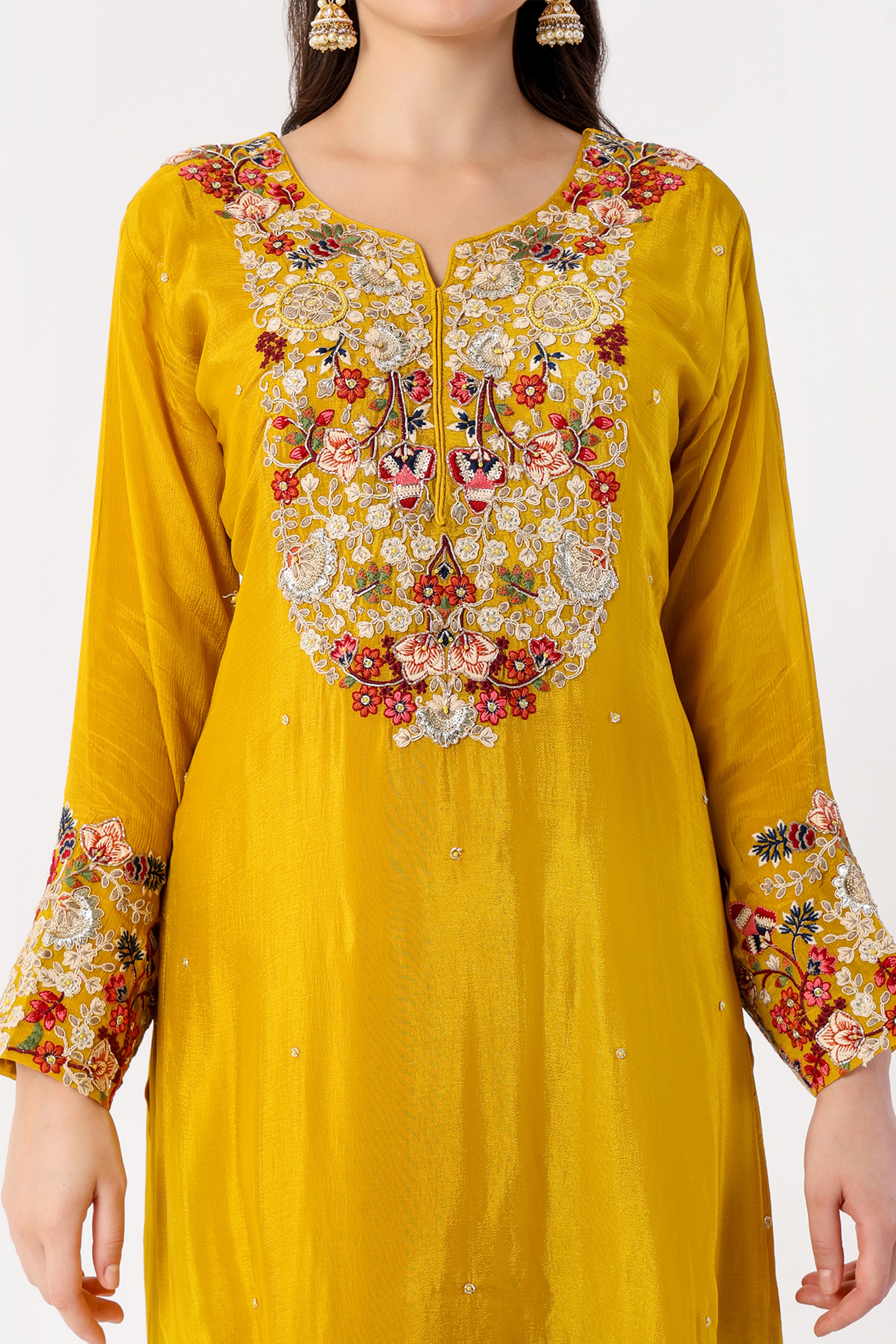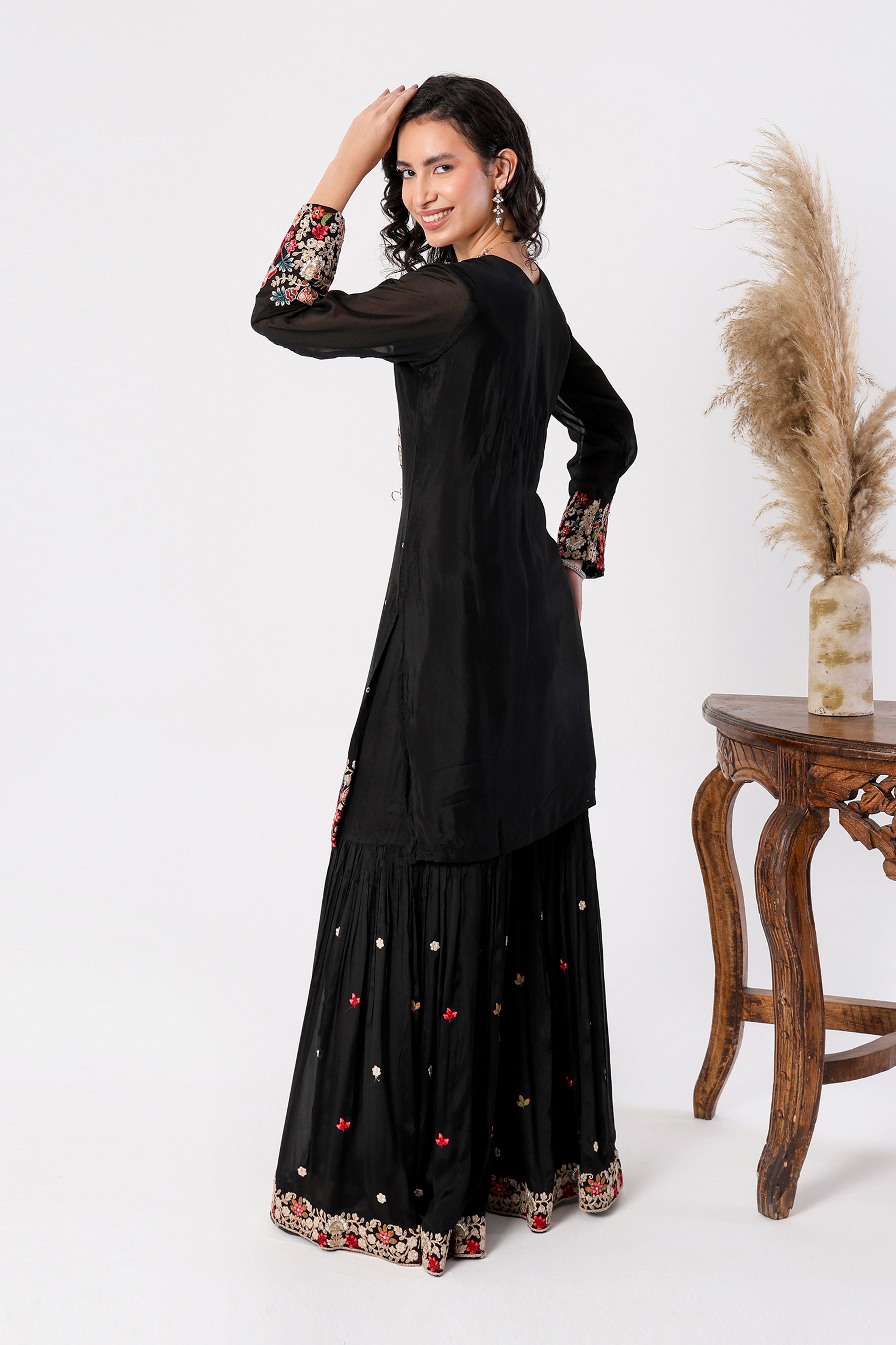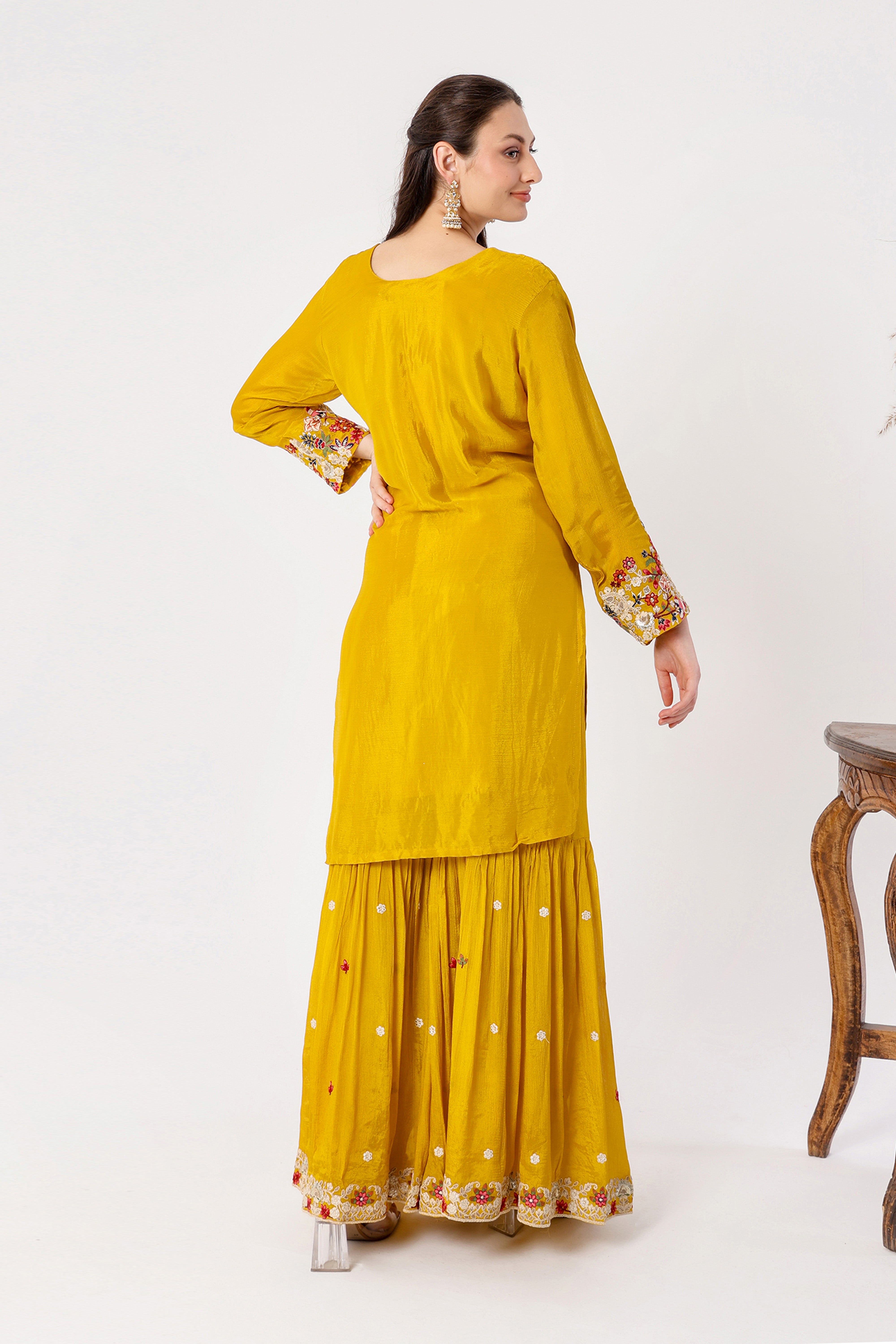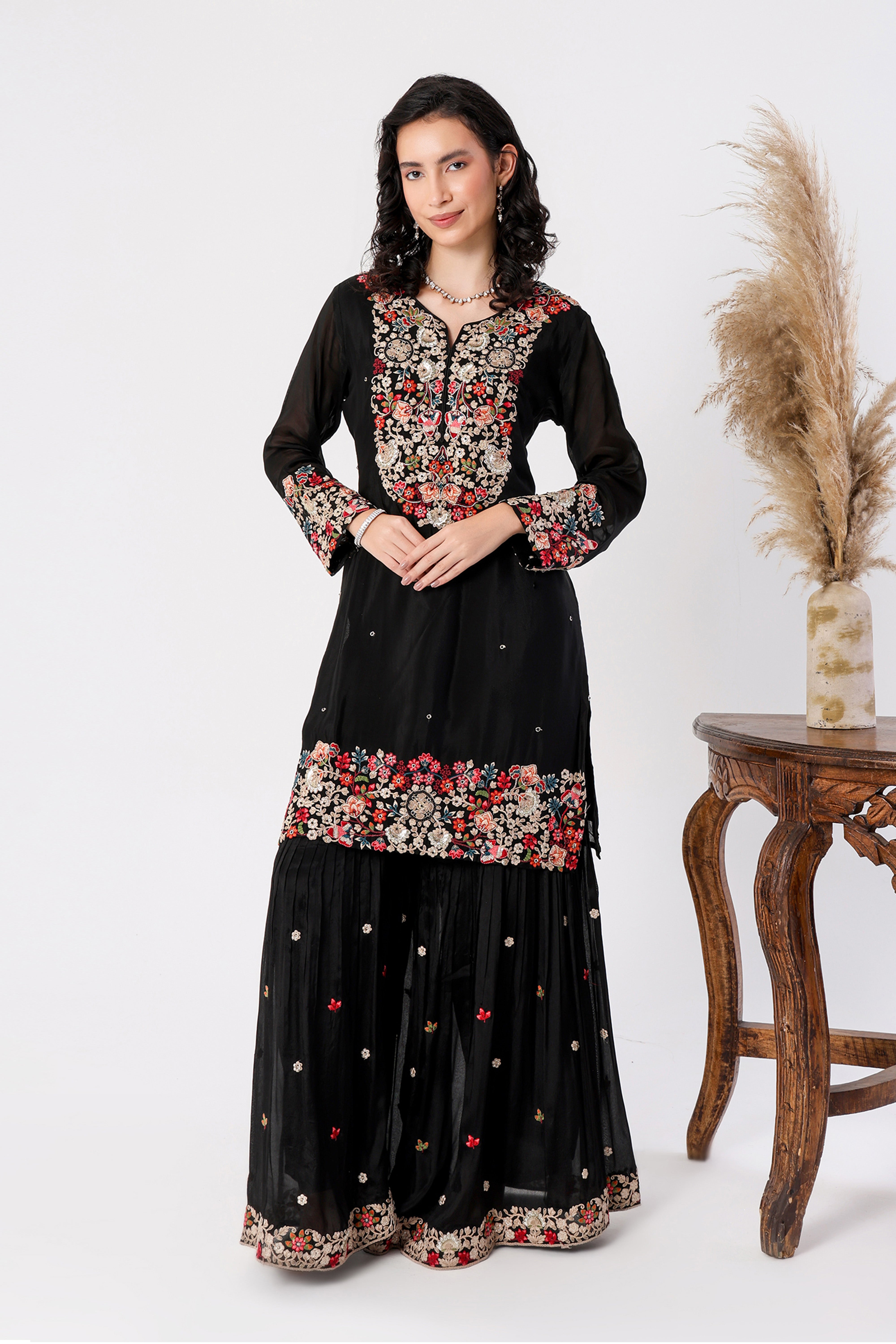 Refresh availabilityRadiate festive elegance in this stunning sharara set. The kurta features intricate thread and zari embroidery highlighted with vibrant floral motifs along the neckline, hem, and sleeves. Crafted from luxurious silk-blend fabric, it exudes a rich sheen and graceful fall. The flared sharara is adorned with delicate butti embroidery and a coordinated embroidered border, completing the look with charm and sophistication. Pair it with statement earrings and juttis for weddings, sangeet functions, or festive celebrations.