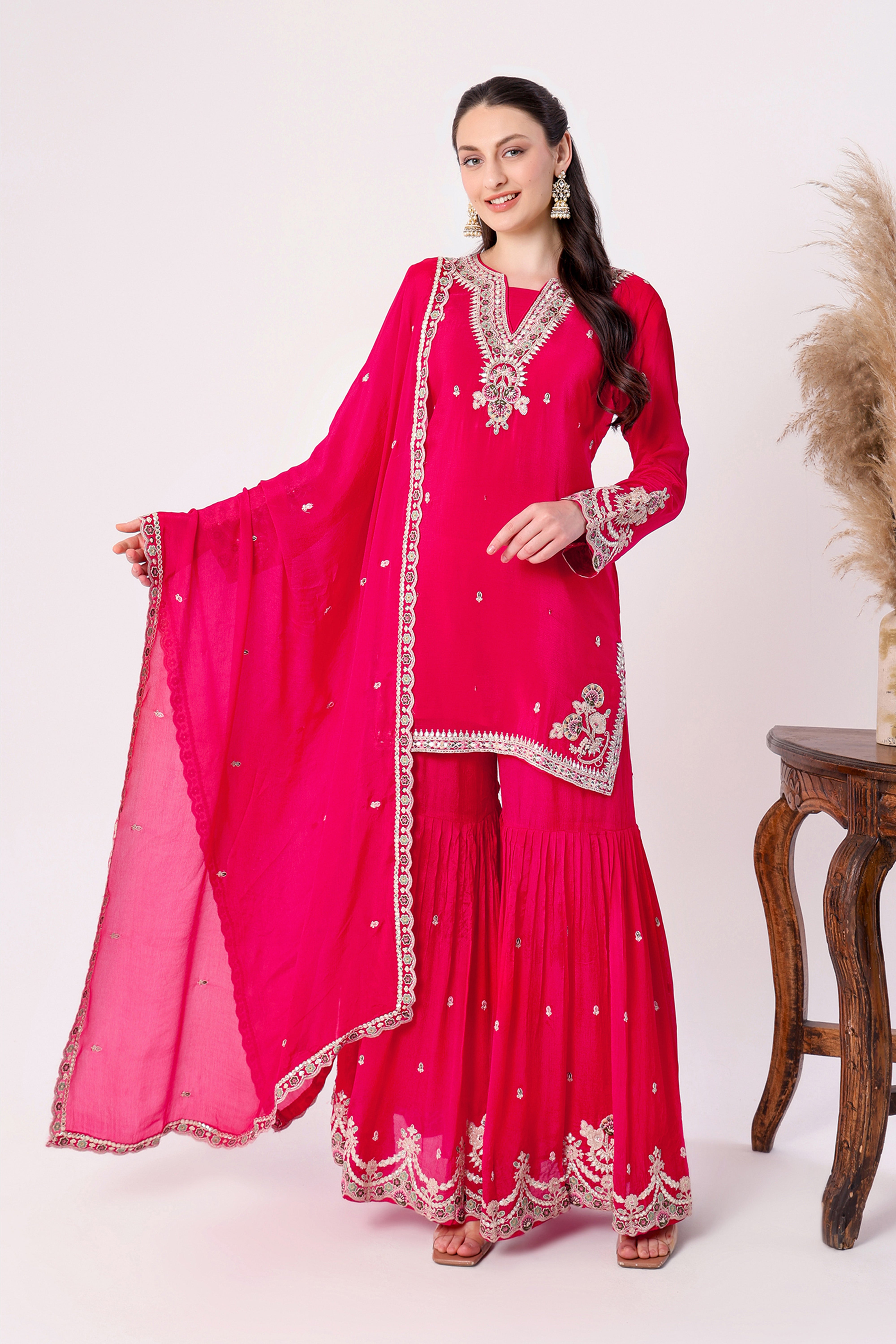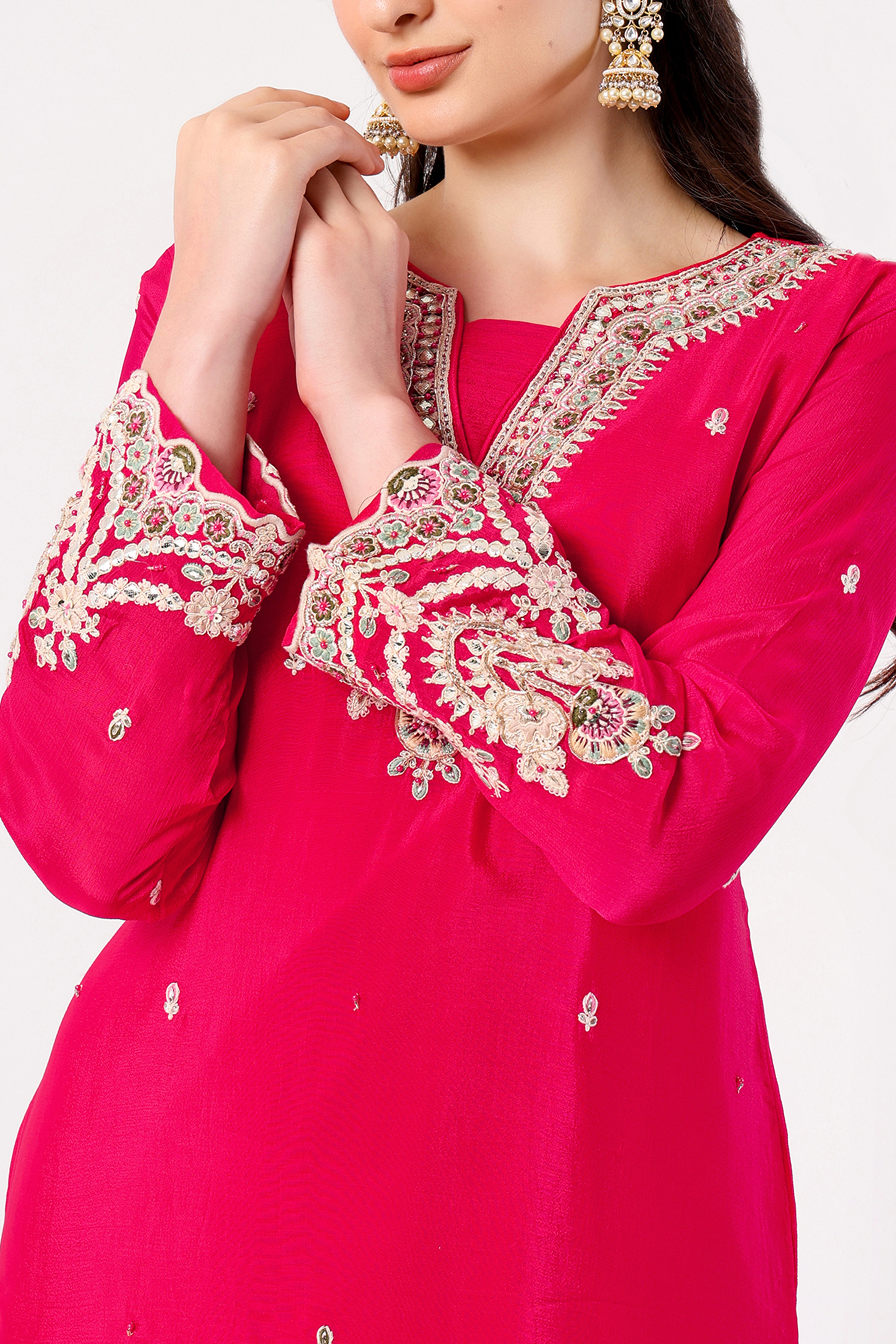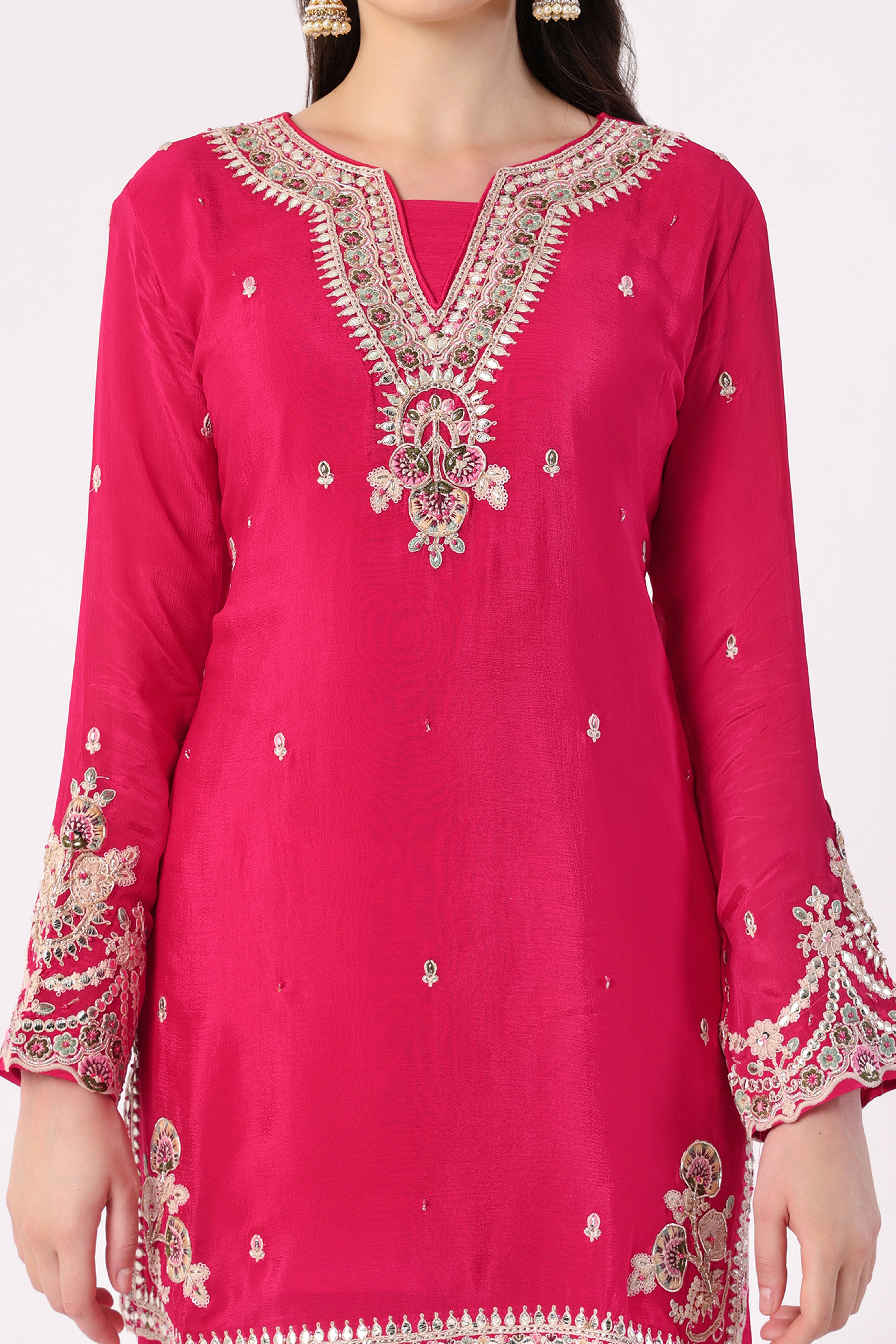 Refresh availabilityMake a bold statement with this exquisite sharara set, designed to bring out your inner radiance. The kurta features intricate silver zari and sequin embroidery along the neckline, cuffs, and hemline, adding a regal charm to the vibrant hue. The flared sharara is adorned with delicate scalloped embroidery that enhances its festive allure. Paired with a matching dupatta detailed with a scalloped lace border and scattered embellishments, this ensemble is perfect for weddings, sangeet nights, and celebratory gatherings. Style it with chandbalis and heels for a timeless ethnic look.
