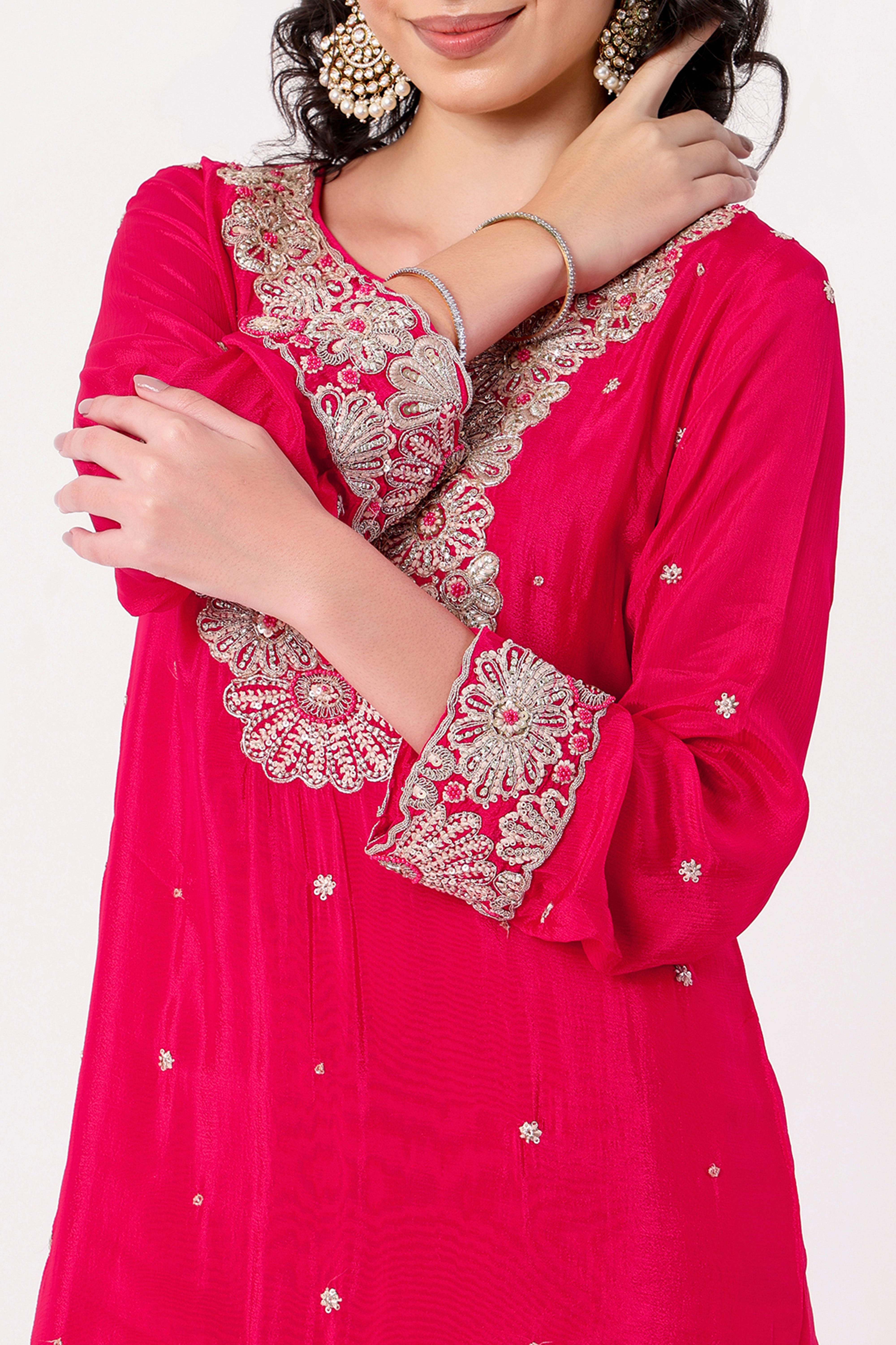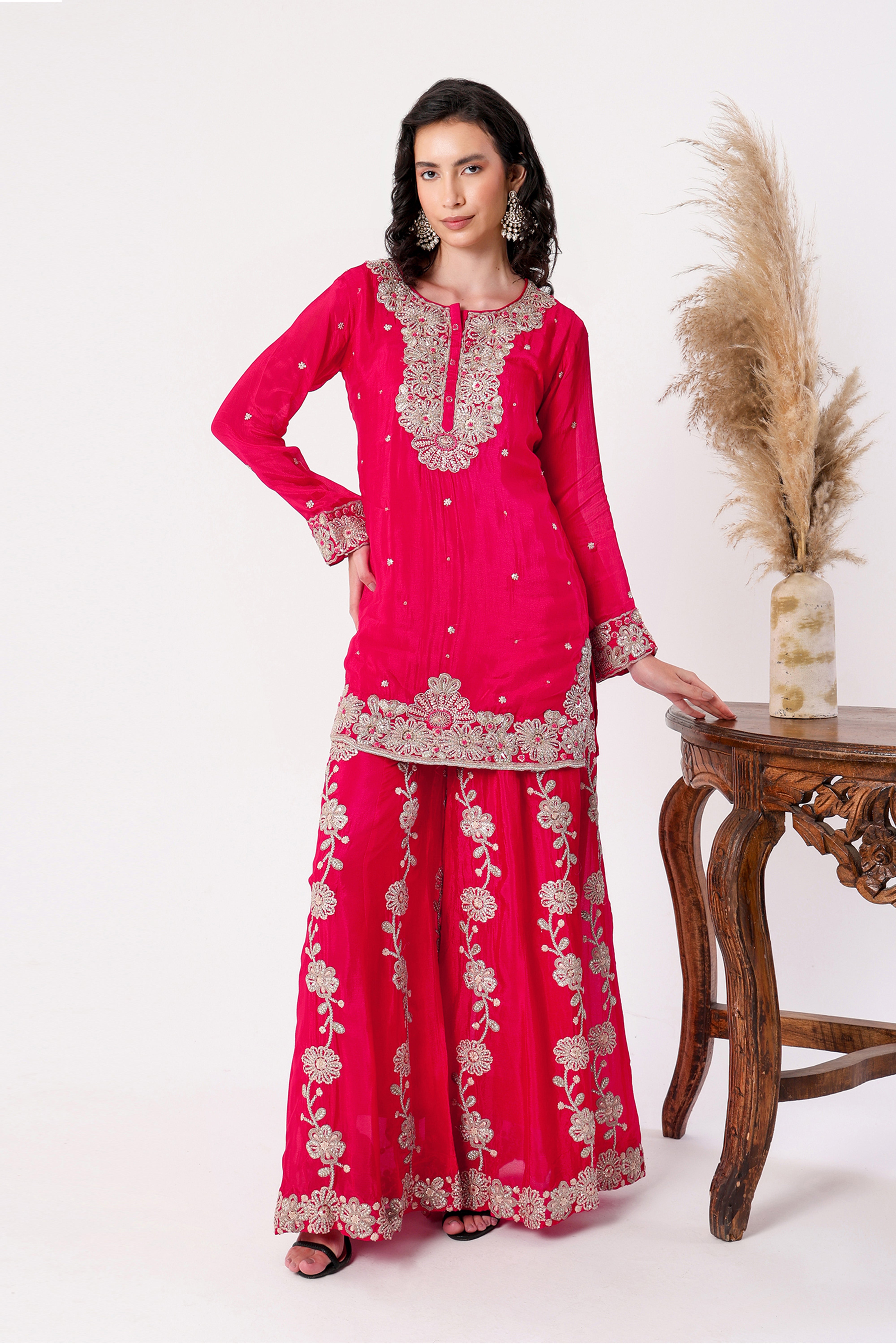 Refresh availabilityStep into elegance with this radiant hot pink sharara set, beautifully detailed with intricate silver zari and sequin embroidery. The straight-cut kurta features a delicately adorned neckline and hem, creating a perfect blend of traditional craftsmanship and modern grace. The flared sharara pants showcase all-over floral embroidery that adds richness and depth to the ensemble. A matching dupatta with scalloped borders and scattered embellishments completes the look. Perfect for festive occasions, wedding functions, or evening celebrations—pair it with statement jhumkas and heels for an effortlessly regal appeal.