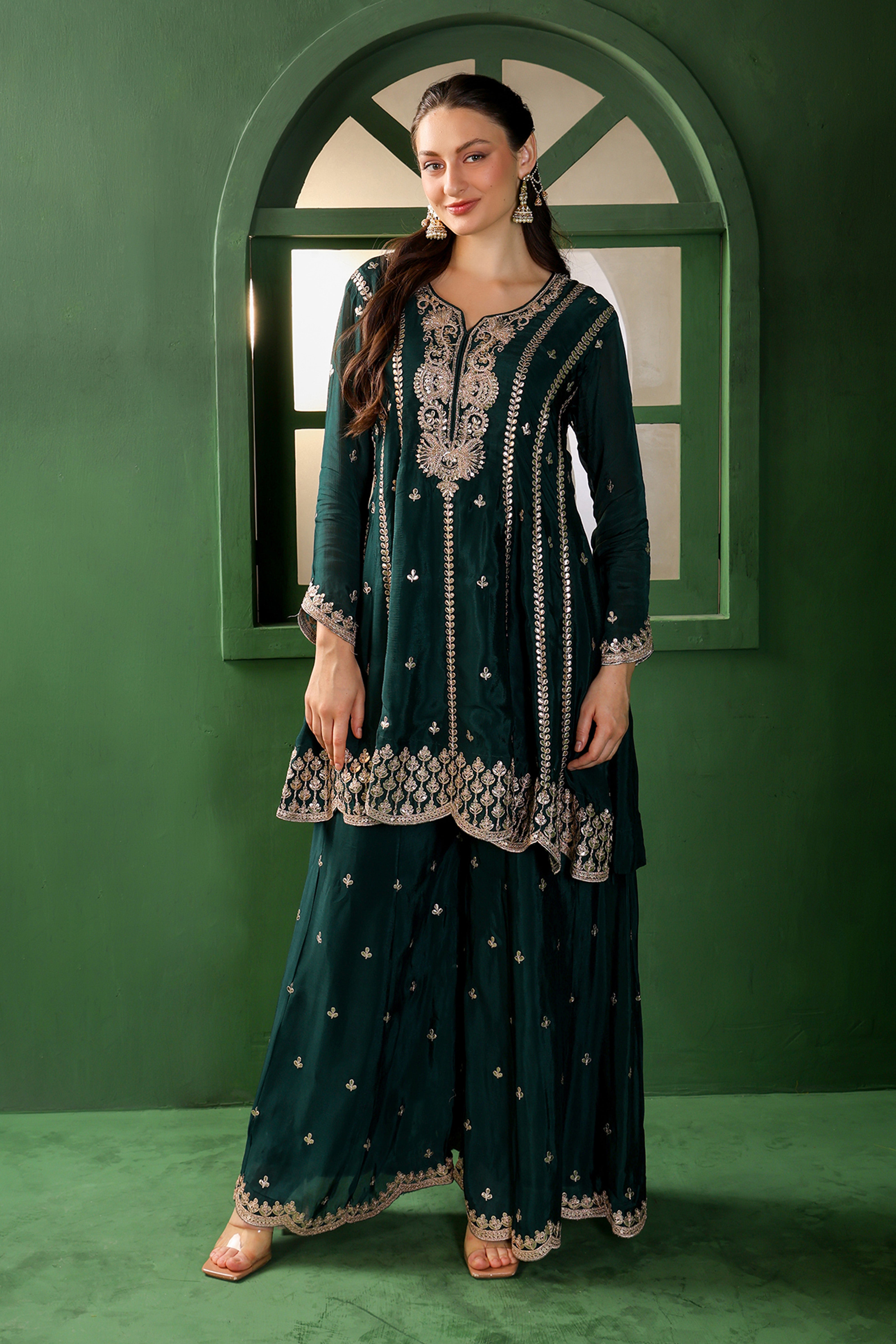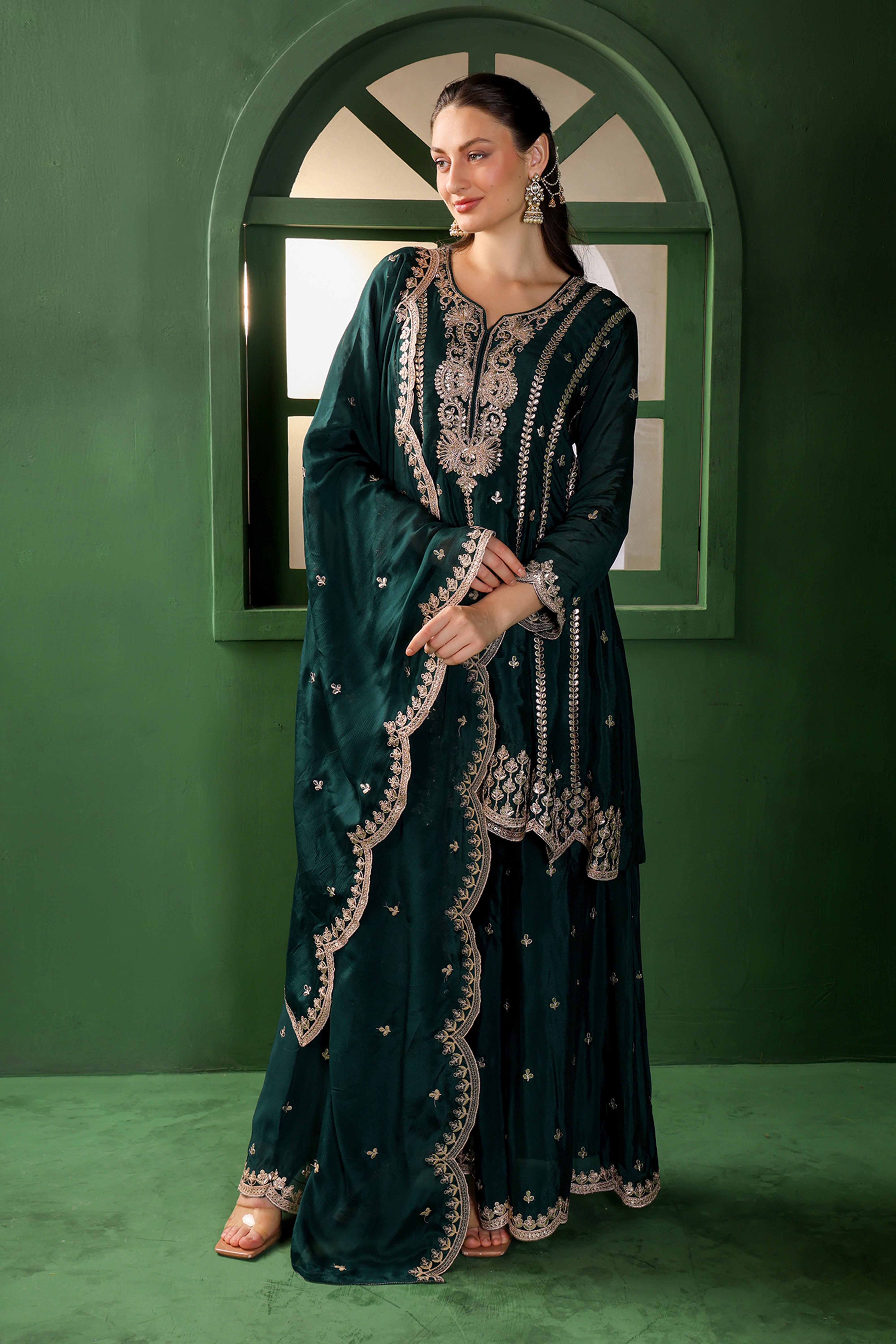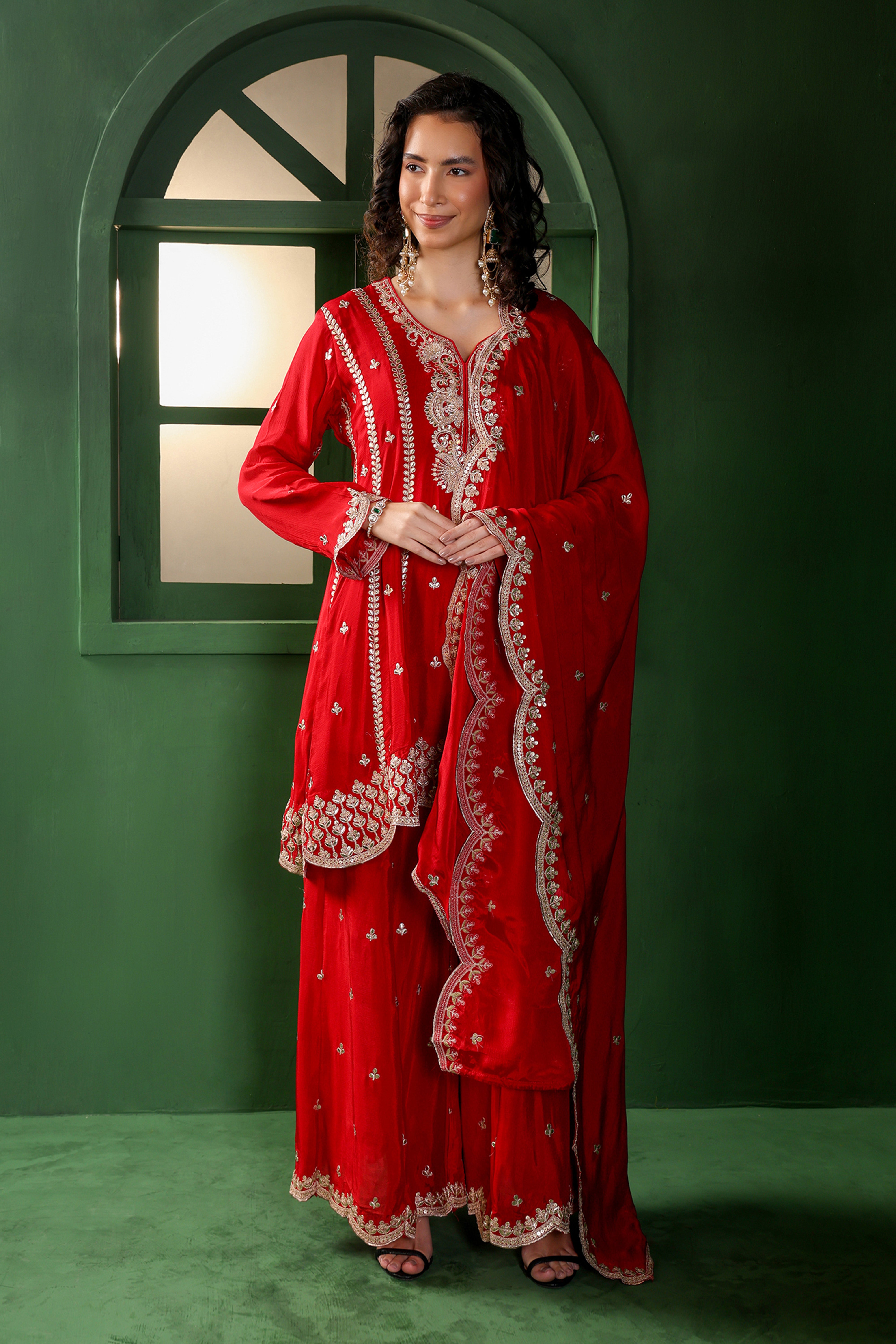 Refresh availabilityMake a regal statement in this striking scarlet sharara set, intricately adorned with golden zari and thread embroidery. The kurta features an elegant neckline accentuated with ornate detailing and delicate motifs scattered across the fabric. The matching flared sharara and dupatta with scalloped embroidered borders exude timeless charm and grandeur. Perfect for weddings, festive soirees, or evening celebrations — this ensemble beautifully blends traditional craftsmanship with modern sophistication.