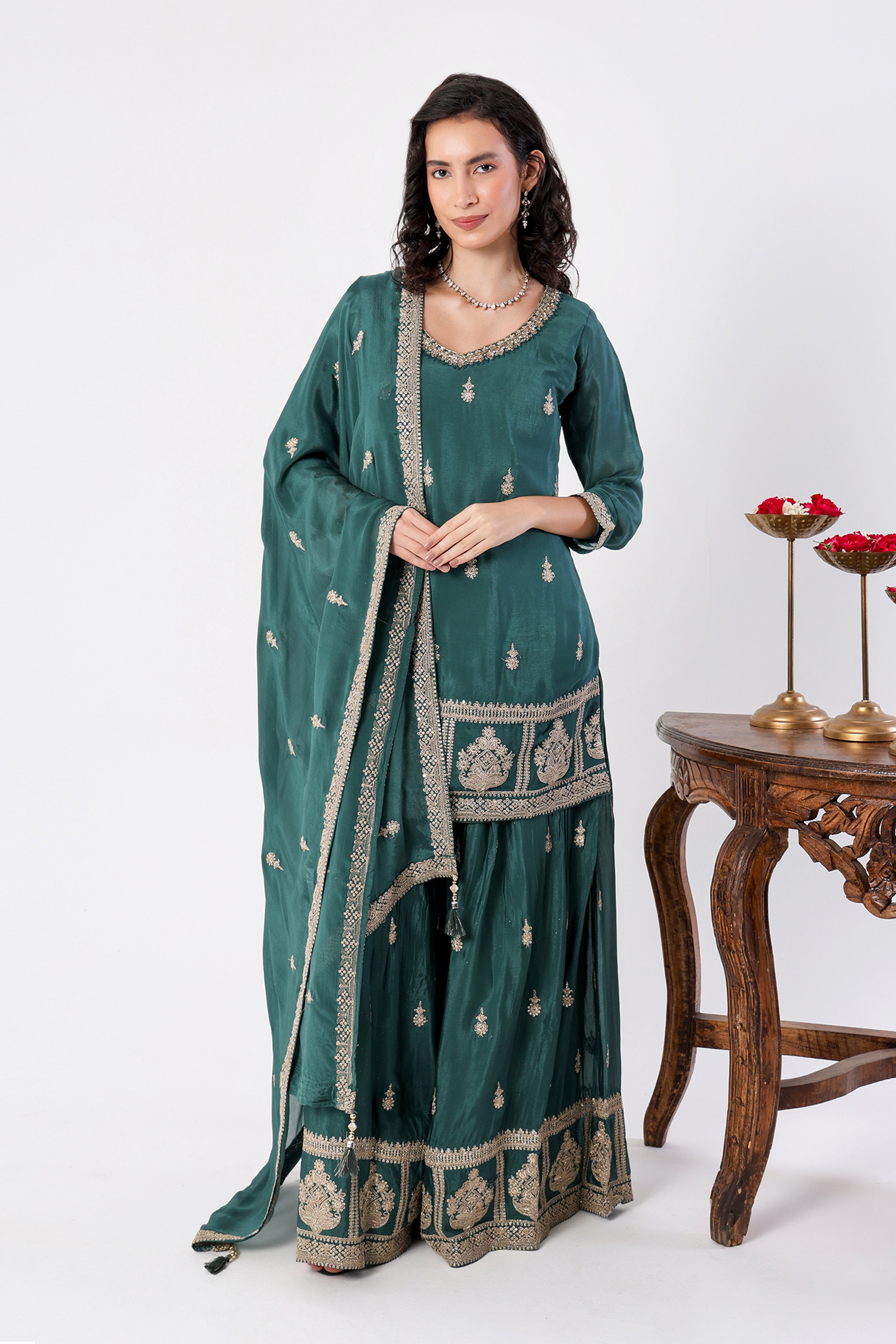 Refresh availabilityGrace meets glamour in this Embroidered Sharara Set, a timeless ensemble crafted from luxurious silk fabric. The kurta features delicate zari and sequin embroidery, enhanced with intricate border detailing along the neckline, sleeves, and hem. Paired with a flowy sharara and a matching dupatta edged with ornate embellishments, this outfit radiates understated elegance. Perfect for festive celebrations, traditional functions, or wedding gatherings — this ensemble beautifully balances heritage craftsmanship with modern charm.