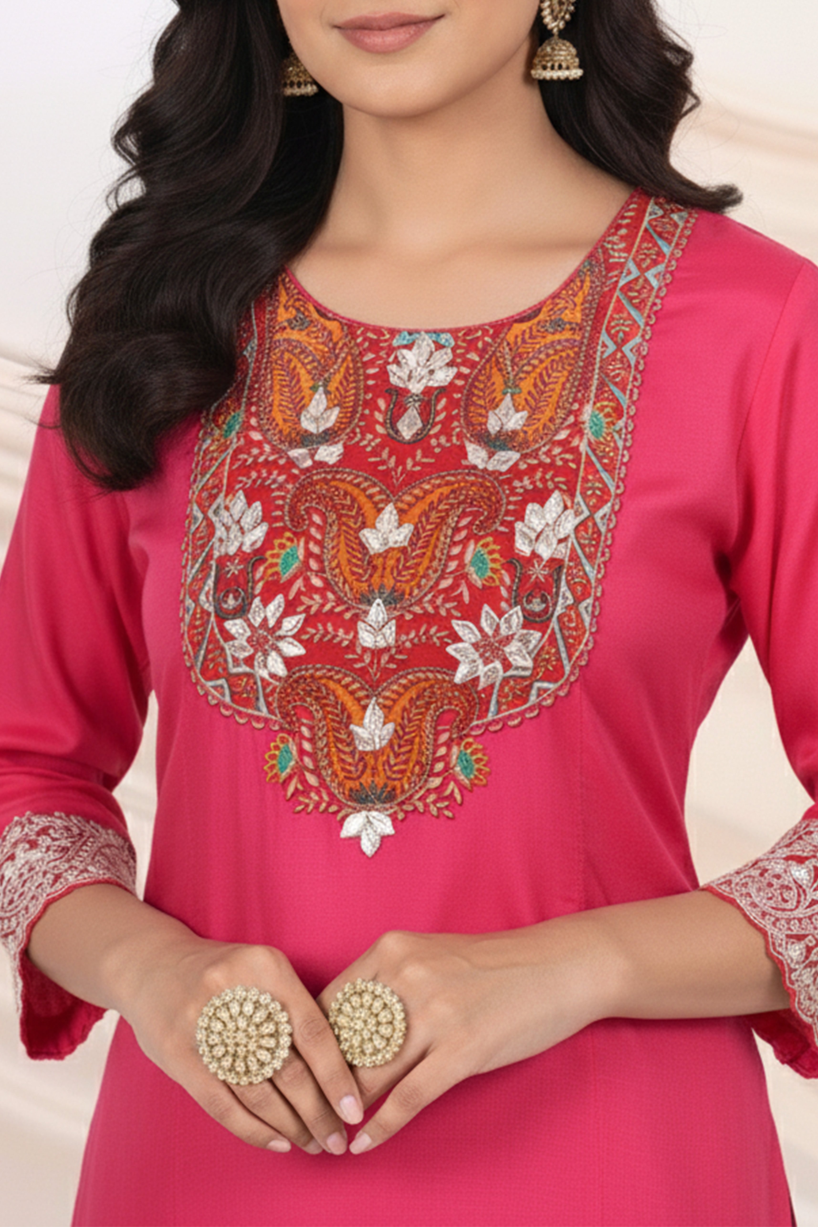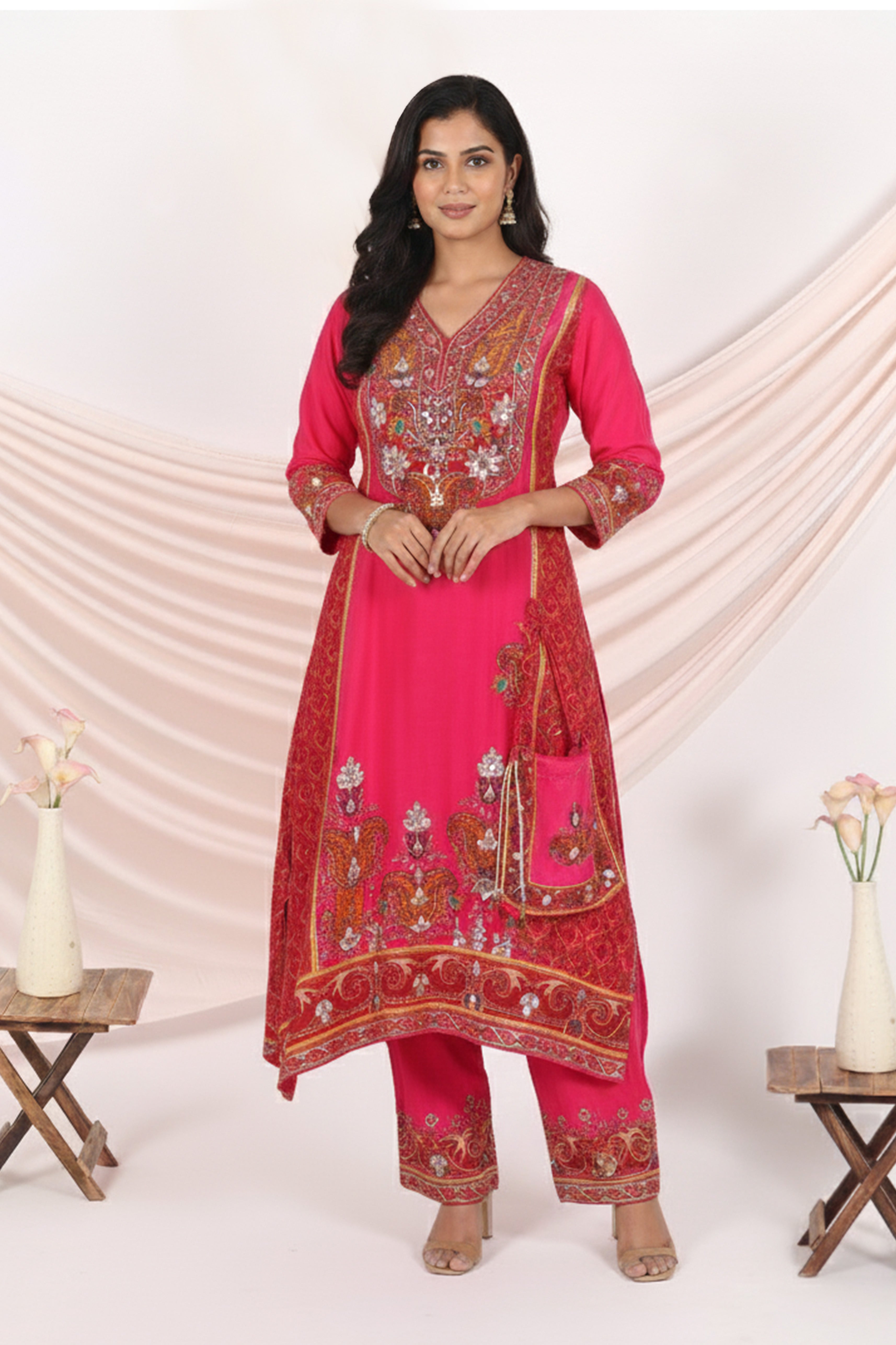 Turn heads with this stunning fuchsia pink embroidered suit set, featuring intricate thread and mirror work that adds a rich festive appeal. The V-neck kurta showcases elaborate multicolour embroidery on the front and sleeves, paired with matching embroidered pants for a cohesive look. The outfit is completed with a delicate chiffon dupatta featuring embroidered borders. Perfect for festive occasions, weddings, or special celebrations, this ensemble blends traditional artistry with vibrant contemporary style.