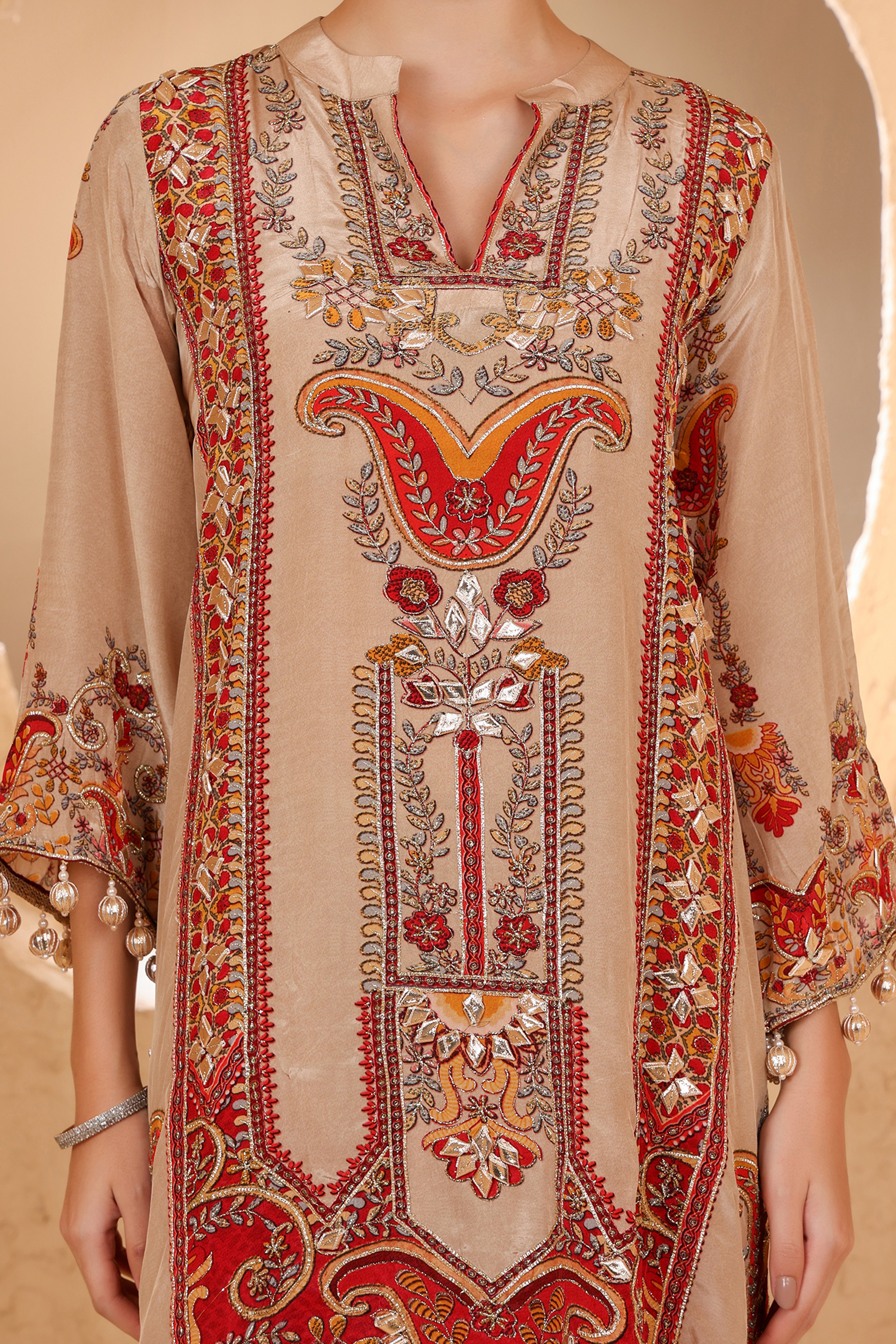 Refresh availabilityEmbrace timeless elegance with this embroidered suit set, crafted to perfection for festive and formal occasions. The kurta features exquisite thread and zari embroidery in shades of red and gold, beautifully complemented by traditional motifs and a contrasting neckline. It is paired with matching salwar pants highlighted with intricate printed borders and a lightweight organza dupatta edged with detailed embroidery. The rich color palette and luxurious fabric lend a graceful charm, making this ensemble perfect for festive gatherings and celebrations.