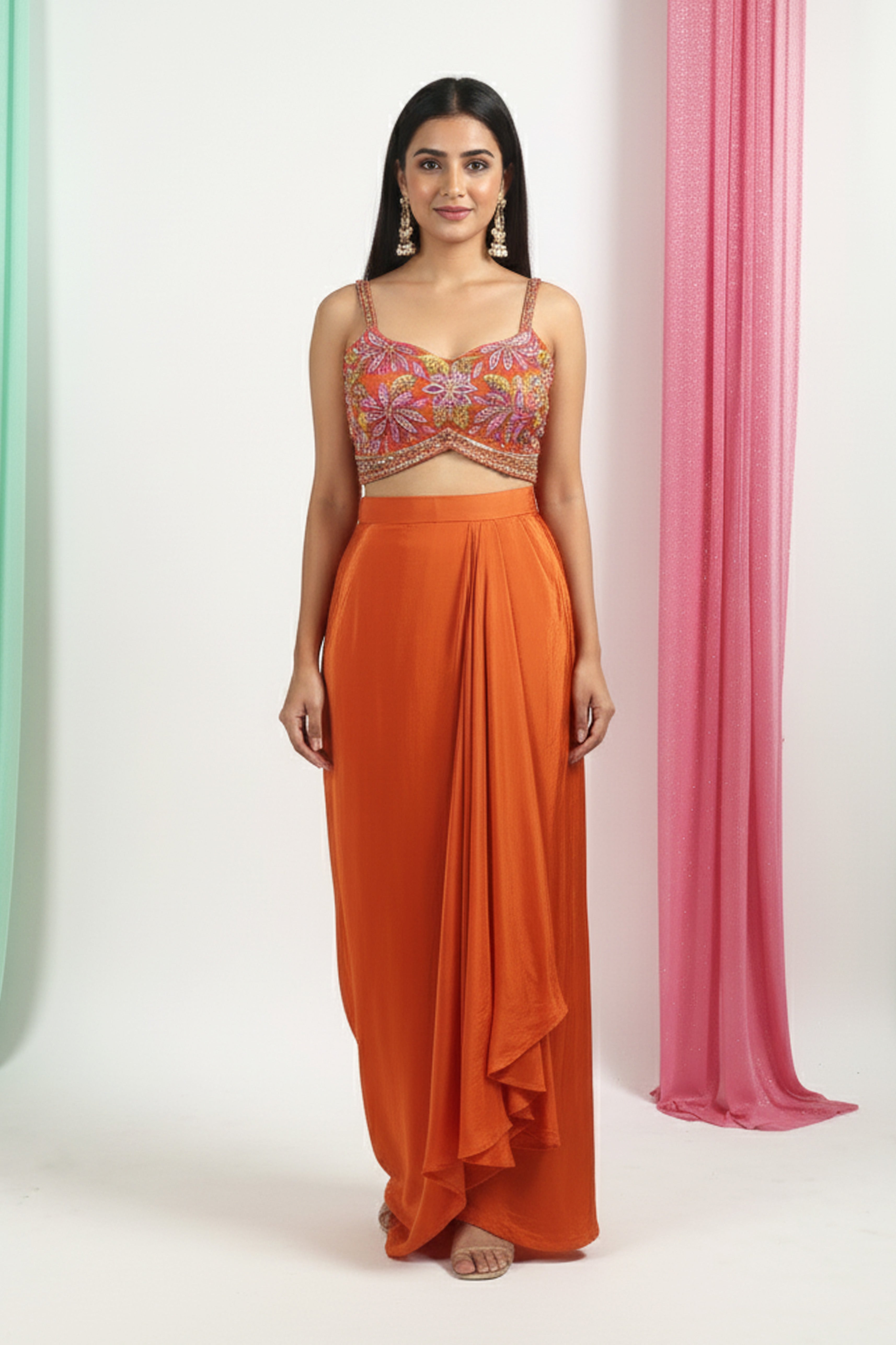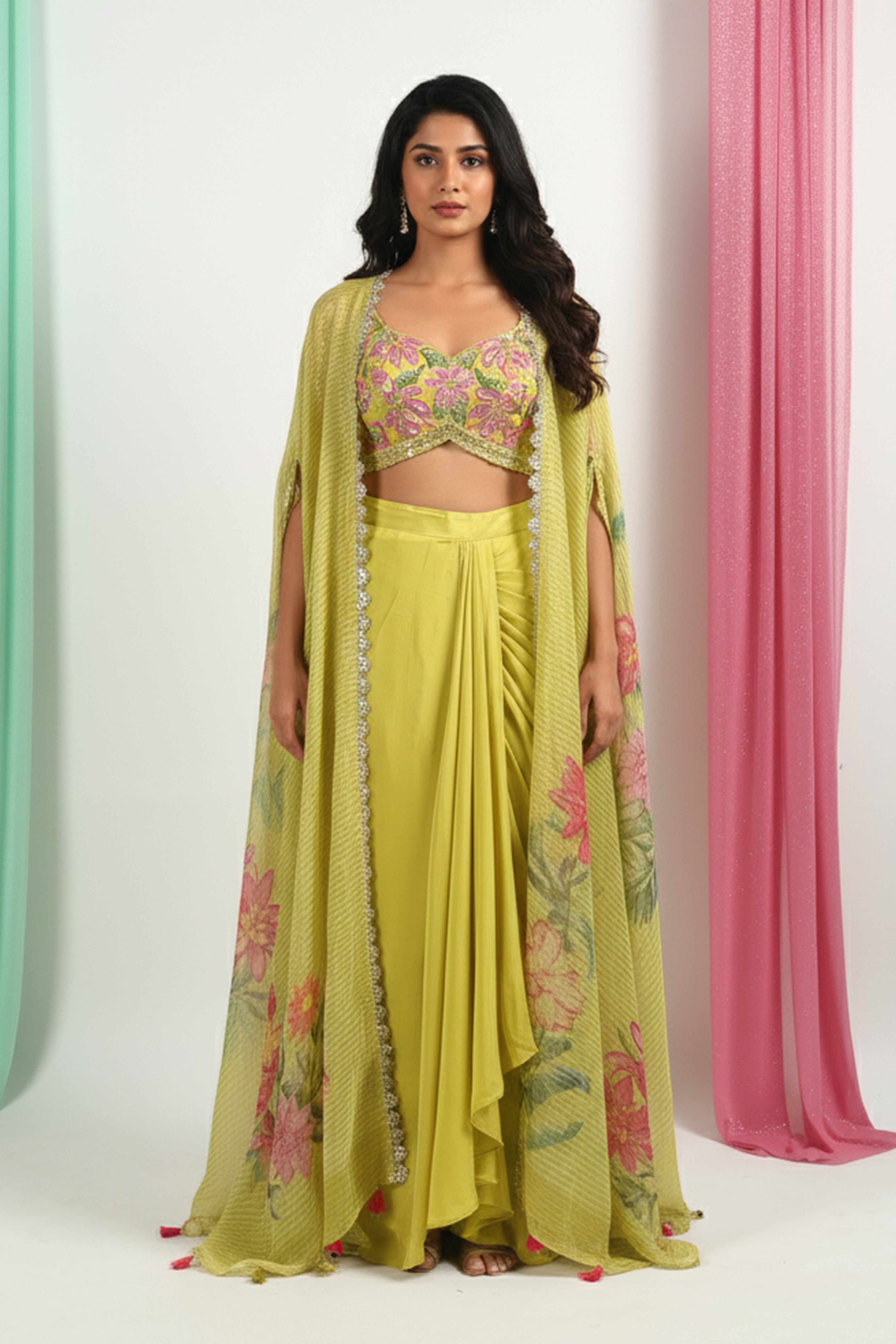 The highlight of this look is the lightweight organza cape adorned width vibrant floral prints, scalloped lace edging, and playful tassels, adding drama and movement to every step. Paired with statement earrings, this outfit is perfect for cocktail nights, mehendi ceremonies, festive dinners, and special occasions.
