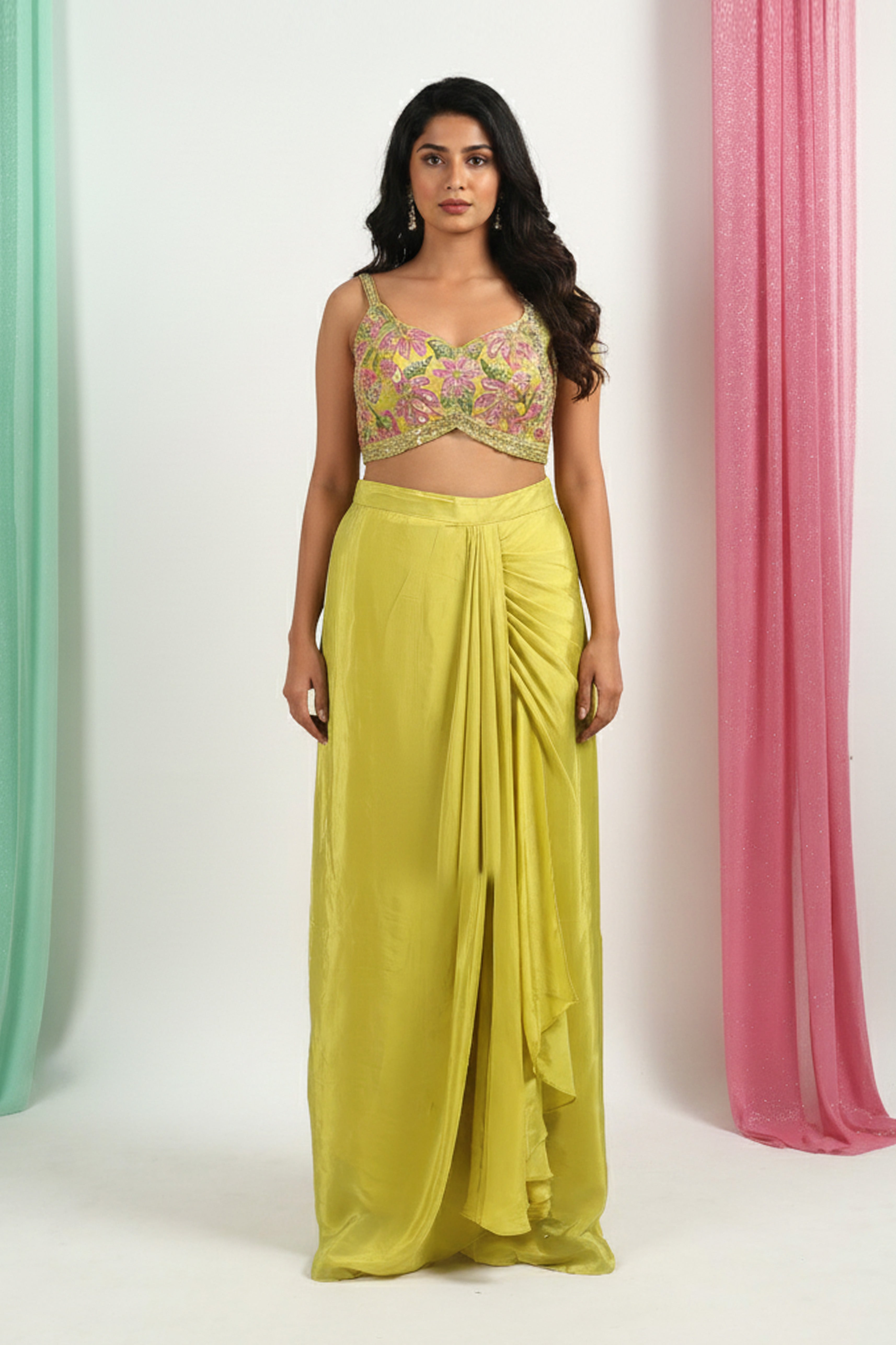 Refresh availabilityStep into effortless festive elegance with our Floral Cape Dhoti Set, designed to make you stand out at celebrations. The ensemble features a beautifully hand-embroidered bustier paired with a flowy Dhoti , creating a modern yet ethnic silhouette.