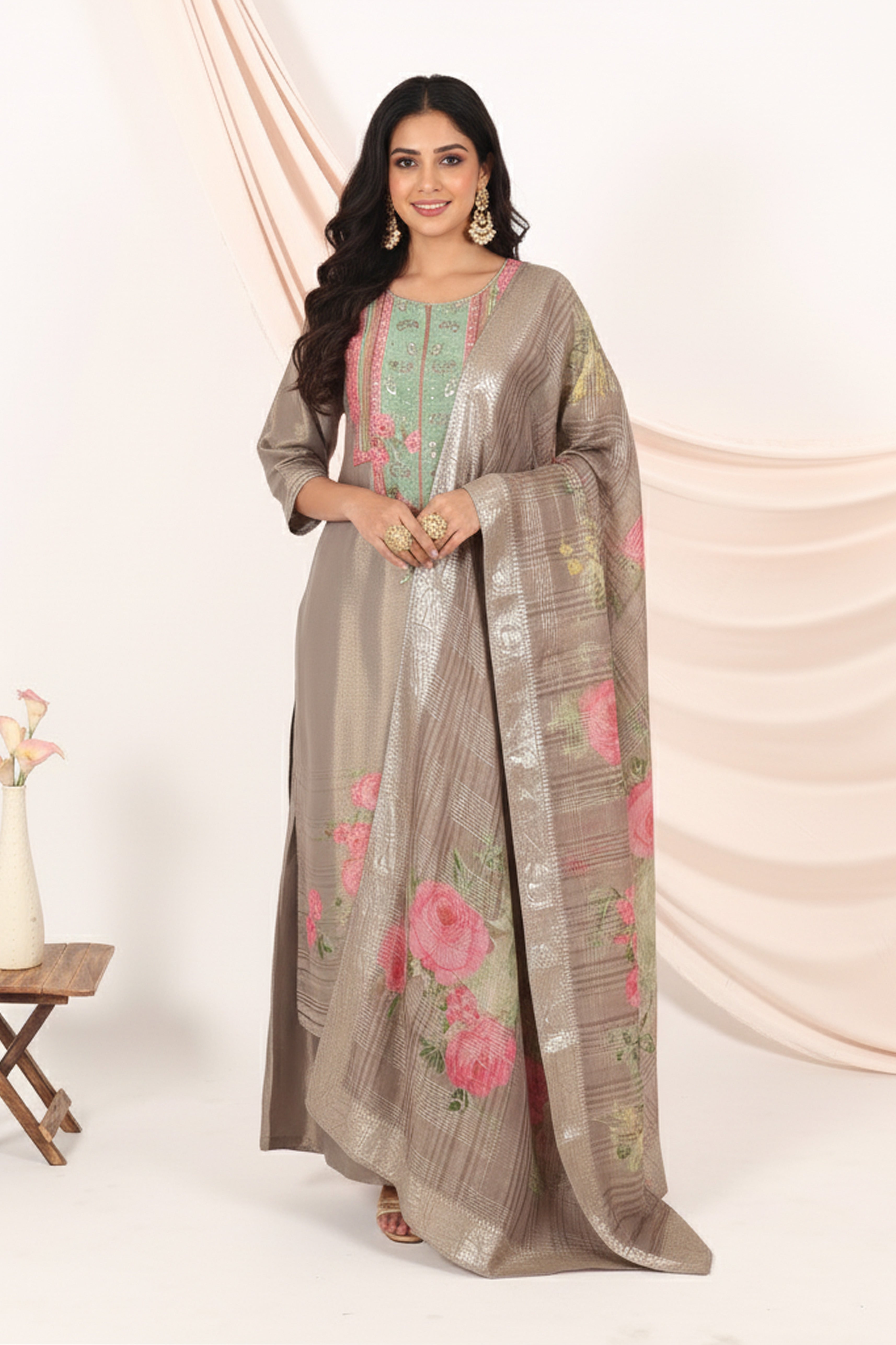 Refresh availabilityGrace your festive moments with this Floral Printed Silk Suit Set featuring a embroidered yoke accentuated with delicate floral motifs. The ensemble is paired with a shimmering silk dupatta adorned with large rose prints and subtle zari highlights, adding a luxurious touch. The soft sheen of the fabric combined with elegant pastel hues creates a refined, feminine appeal. Perfect for daytime celebrations, festive gatherings, or elegant soirées, this outfit exudes understated sophistication with timeless charm.