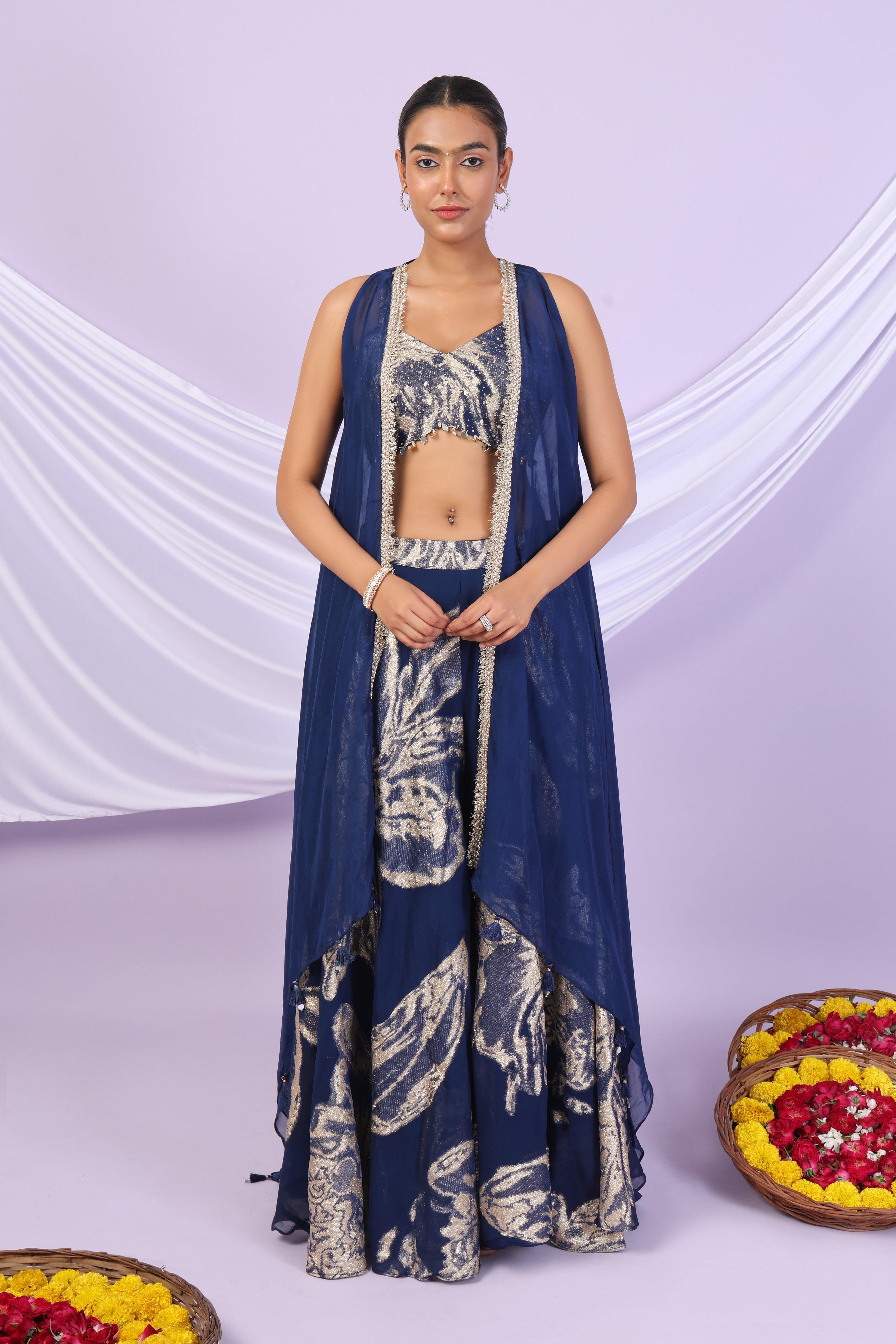 Refresh availabilityTurn heads with this Foil Floral Palazzo Set with Cape, a perfect blend of elegance and modern style. The outfit features a chic crop-top adorned with delicate foil floral motifs, paired with flowy palazzo pants that exude effortless grace. A lightweight matching cape drapes beautifully over the shoulders, adding a contemporary edge to the ensemble. Ideal for weddings, festive occasions, or cocktail evenings, this set offers comfort with a glamorous appeal.