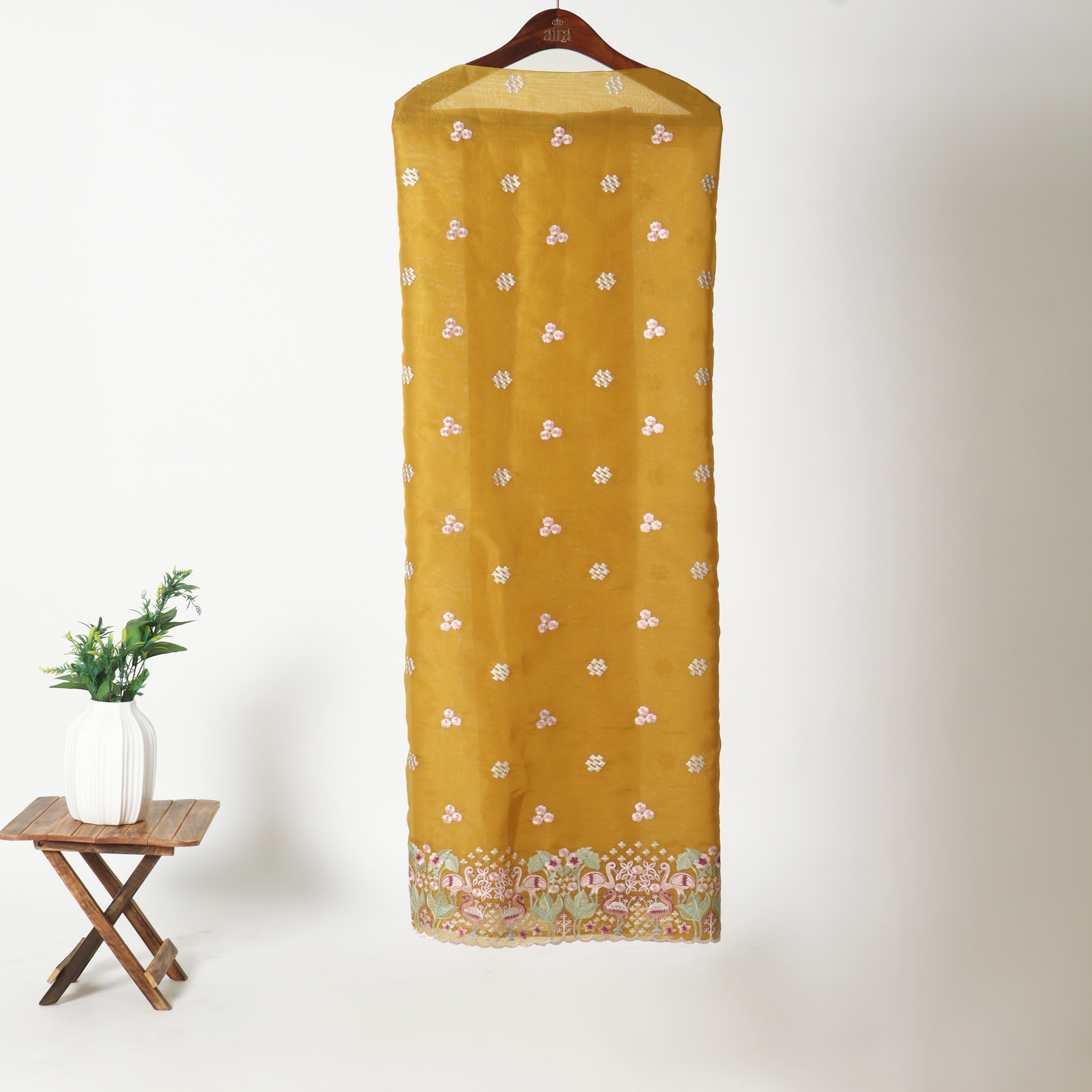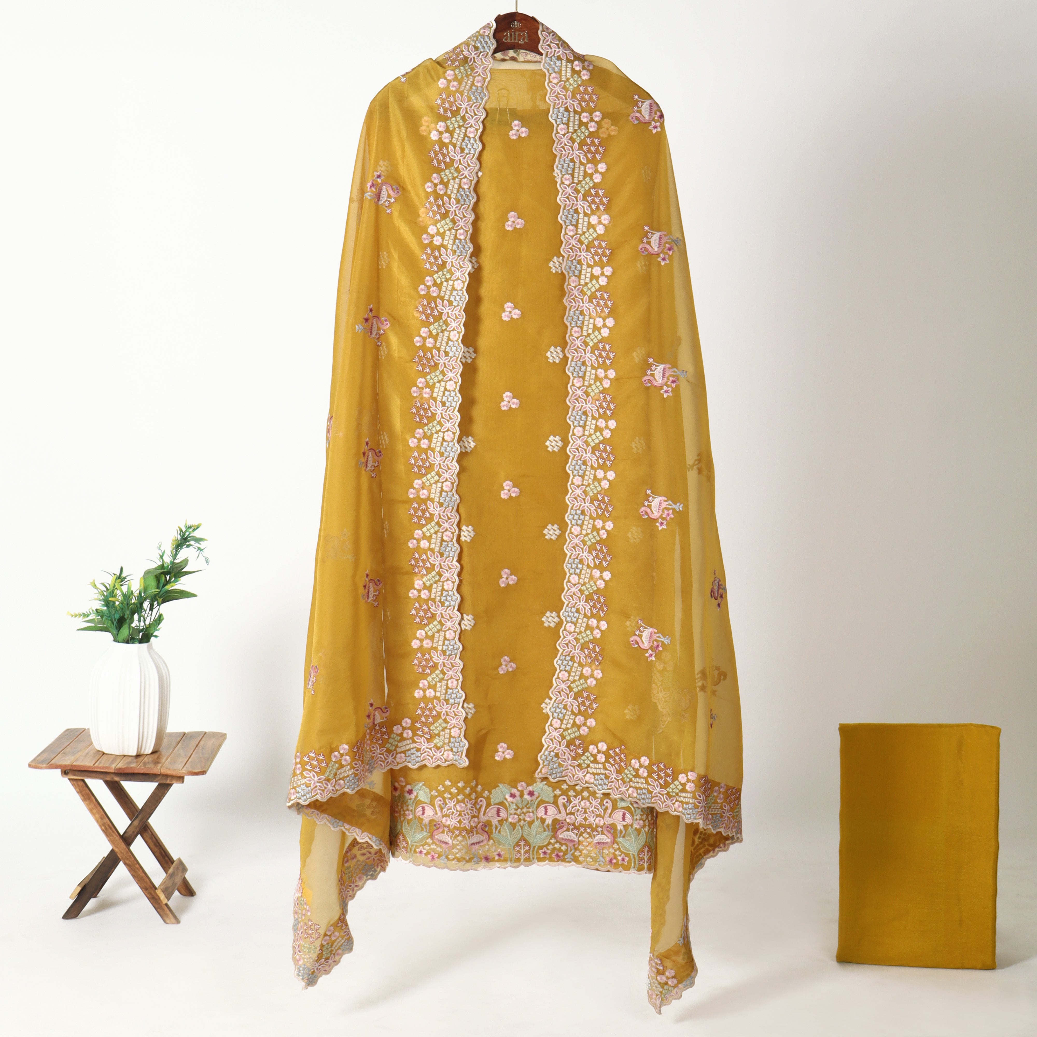 Refresh availabilityRadiating festive warmth and timeless elegance, the Embroidered Unstitched Organza Suit is crafted for celebrations that call for rich colour and delicate detailing. The kurta fabric is adorned with finely placed floral and paisley-inspired embroidery in soft pastel tones, creating a beautiful contrast against the vibrant marigold base.