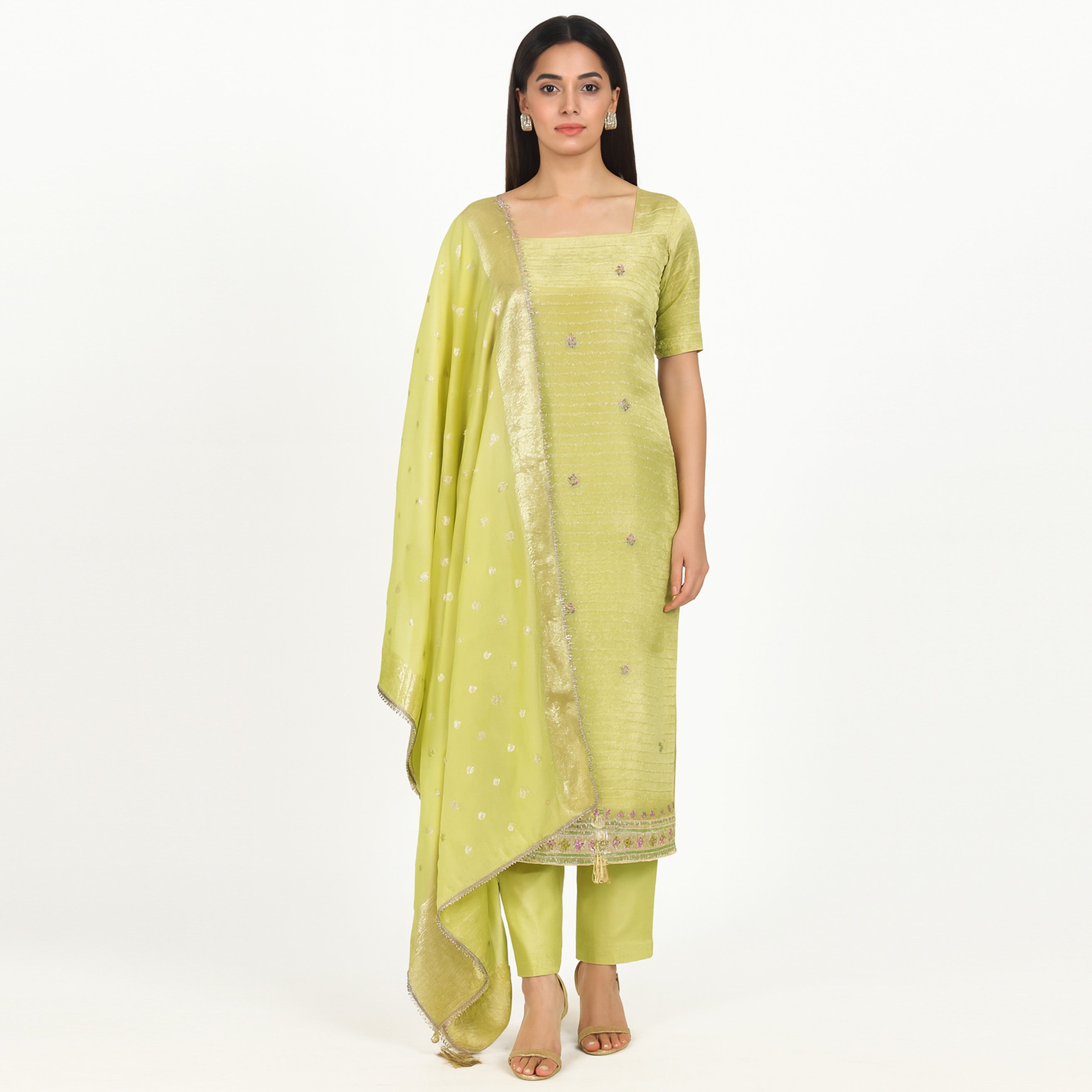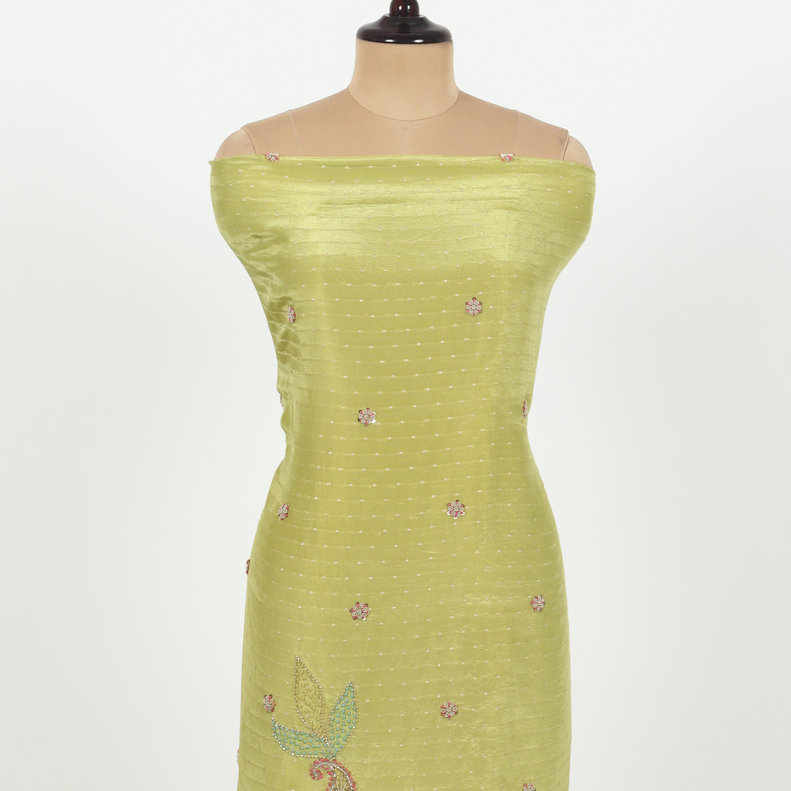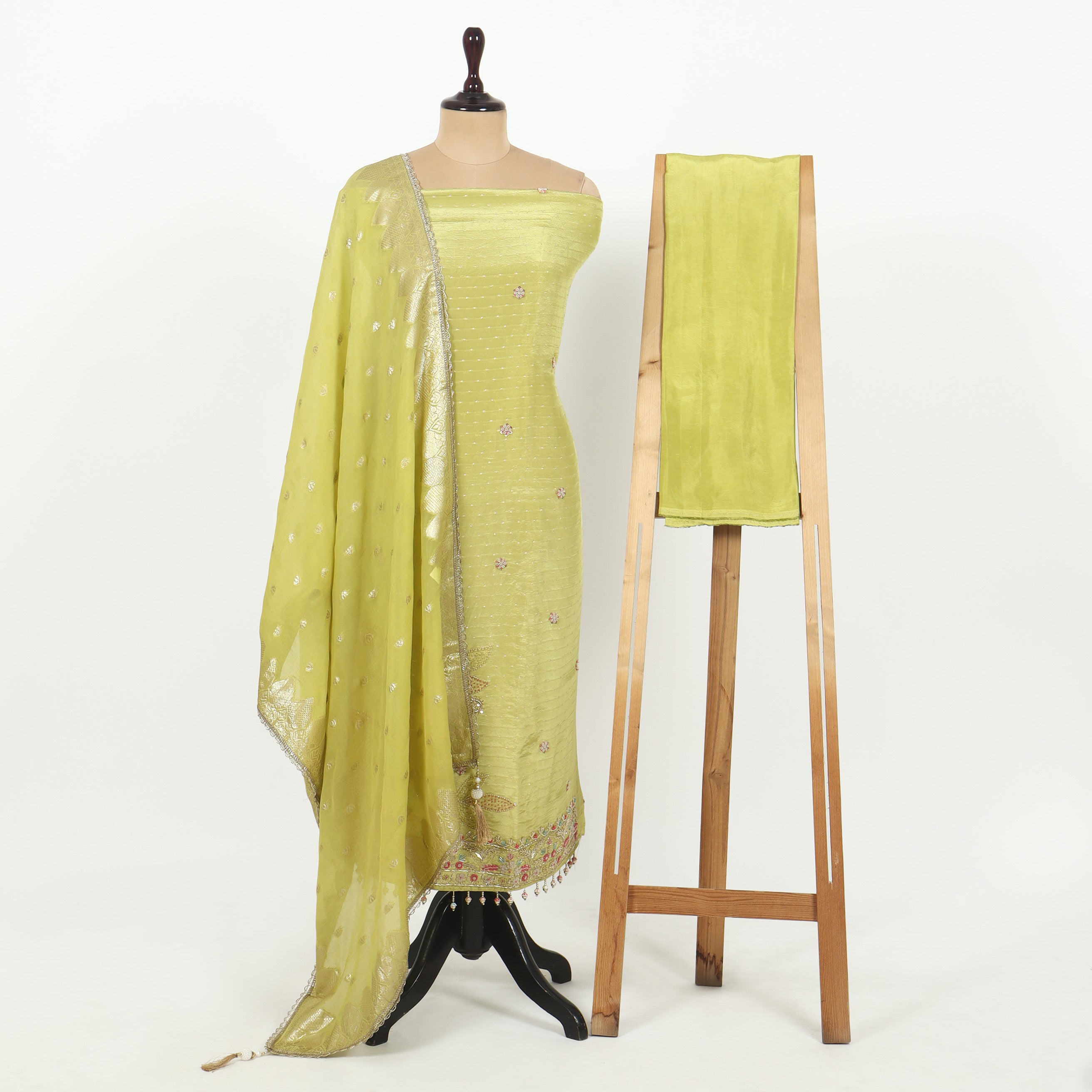 Refresh availabilityThis lime green unstitched tissue suit offers a vibrant, fresh hue perfect for any season. Crafted from lightweight tissue fabric, it ensures breathability and a comfortable fit once tailored. Its unstitched state allows for customization, making it ideal for those seeking a personalized garment that balances elegance with ease.