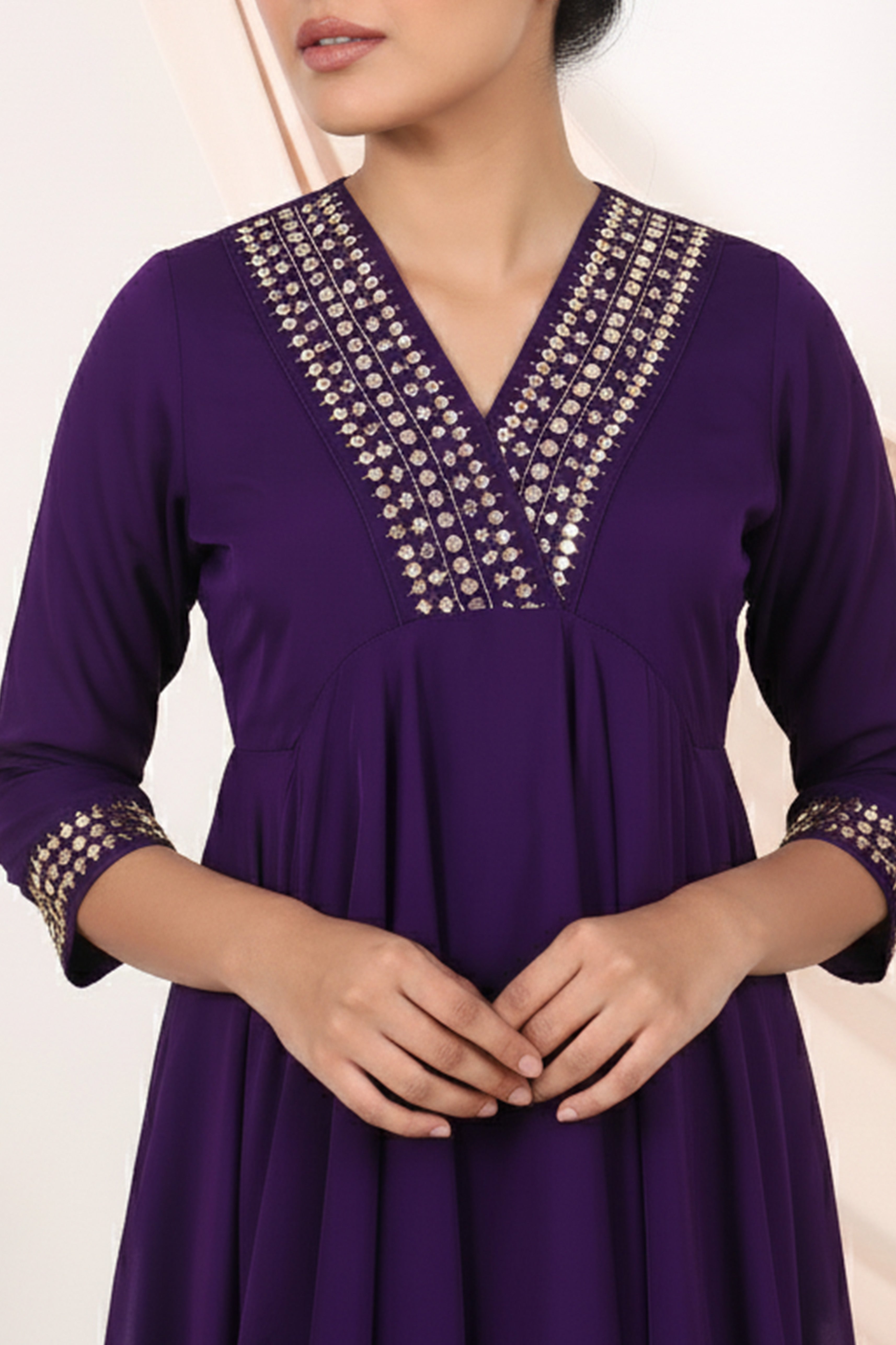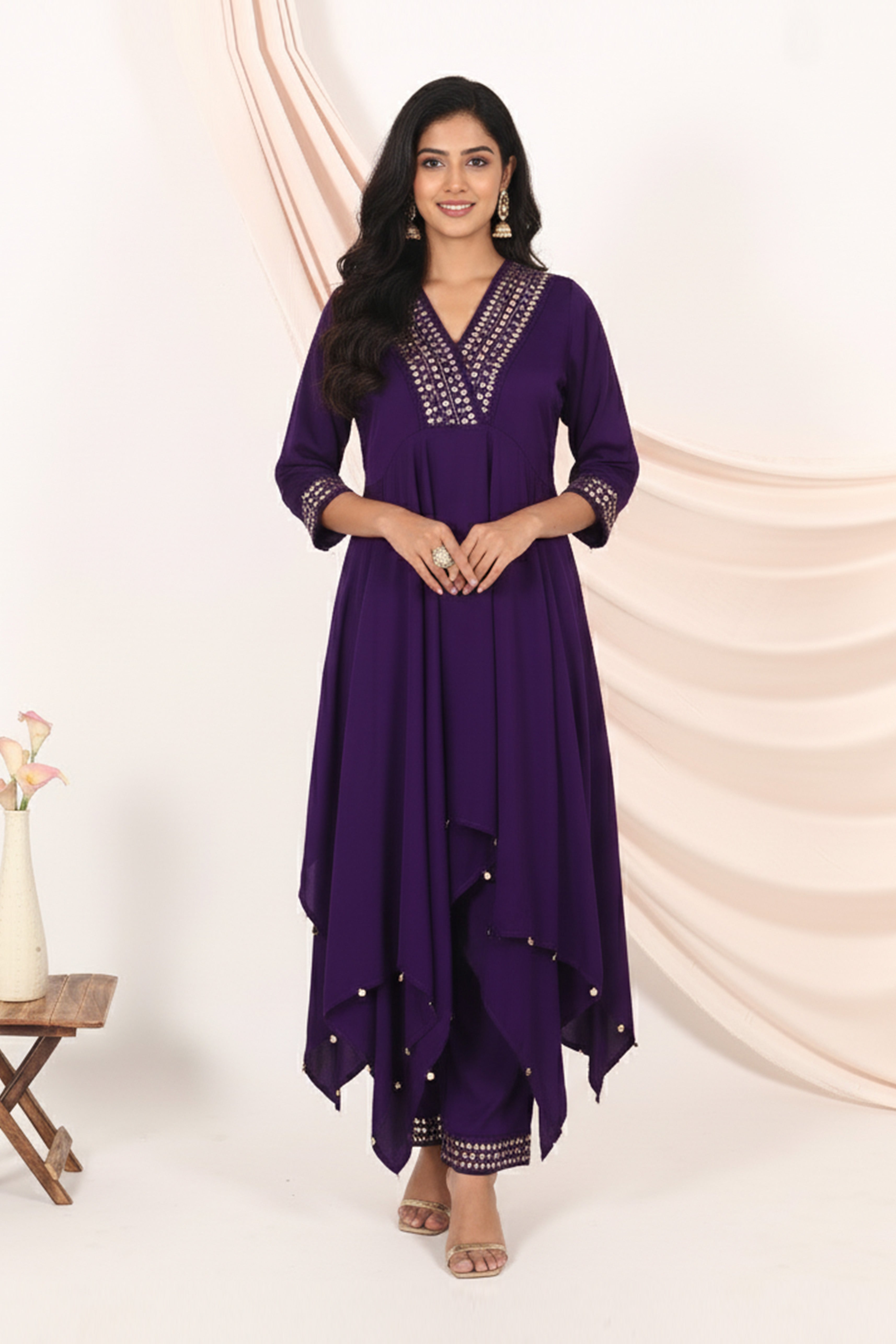 Elevate your festive wardrobe with this layered kurta set, featuring intricate mirror and thread embroidery on the neckline and sleeves. The asymmetrical hemline adds a contemporary flair, while the embellished borders lend a touch of shimmer. Paired with matching embroidered pants, this ensemble beautifully balances elegance and comfort. Ideal for festive gatherings, evening celebrations, or wedding functions — this outfit radiates regal charm with a modern twist.