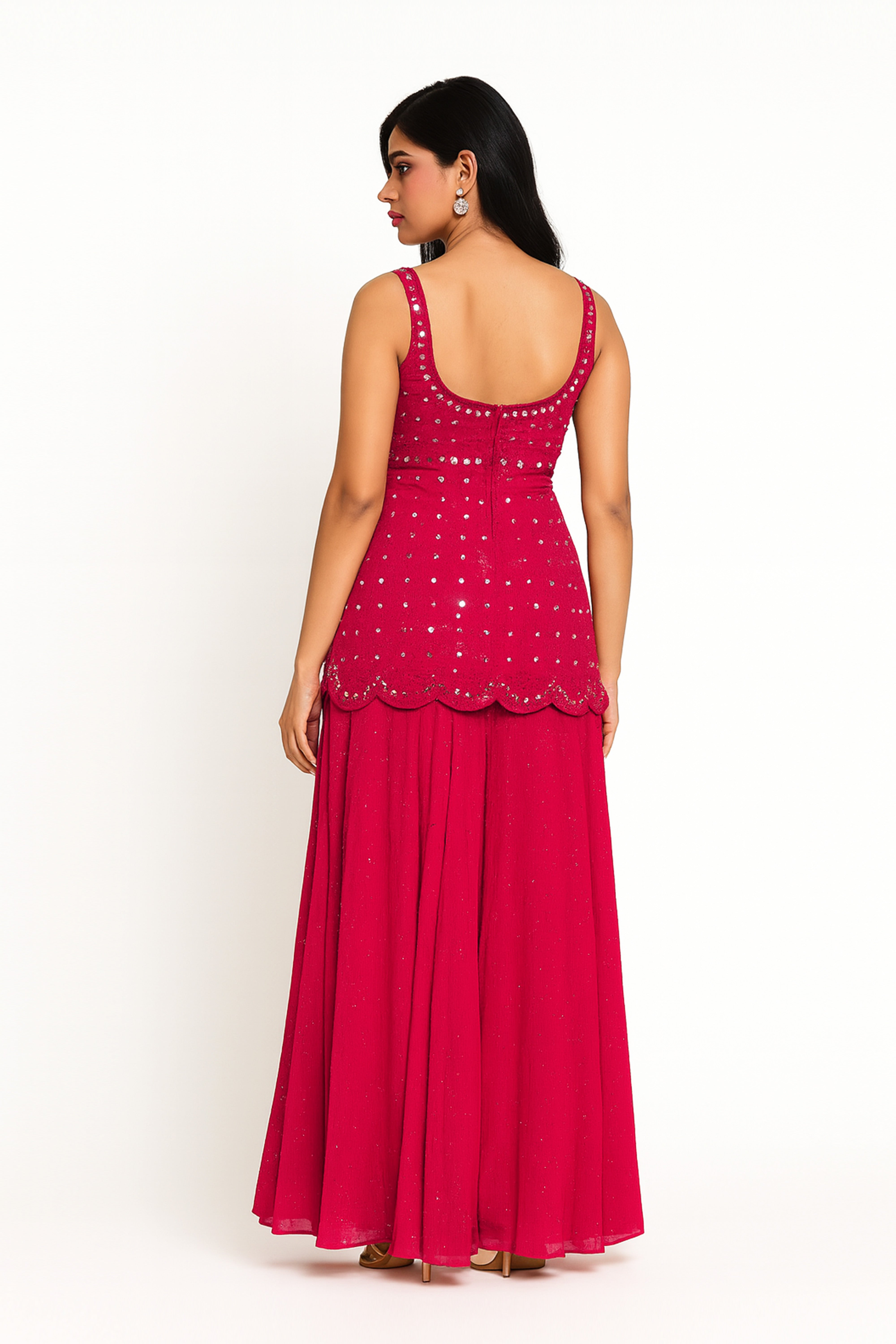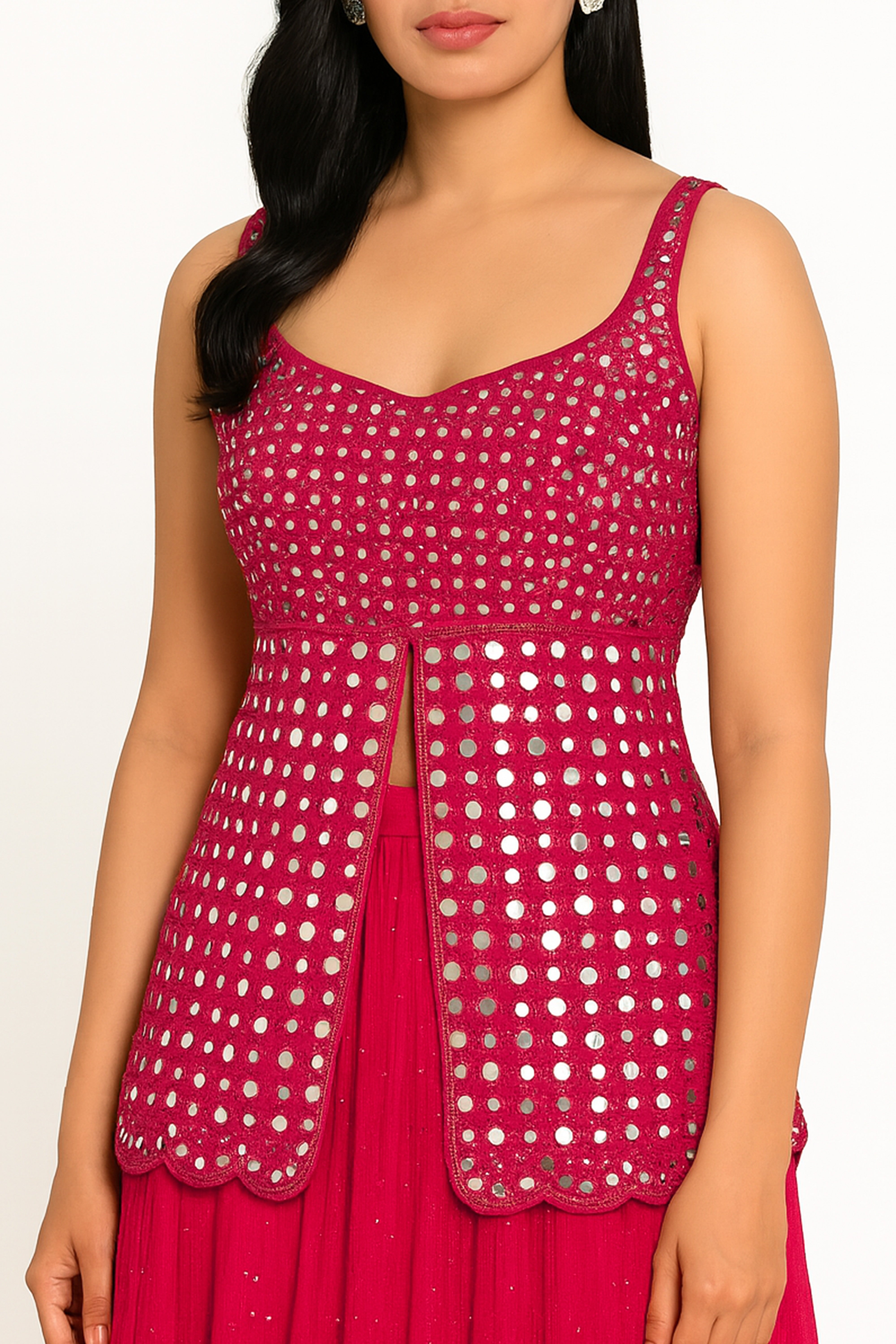 Refresh availabilityAdd a sparkling touch to your festive wardrobe with this elegant Mirror Work Sharara Set. The outfit features a beautifully crafted kurta embellished with intricate mirror detailing, paired with a flowy sharara bottom that offers comfort with style. A matching dupatta, highlighted with delicate mirror accents, completes the look with grace.