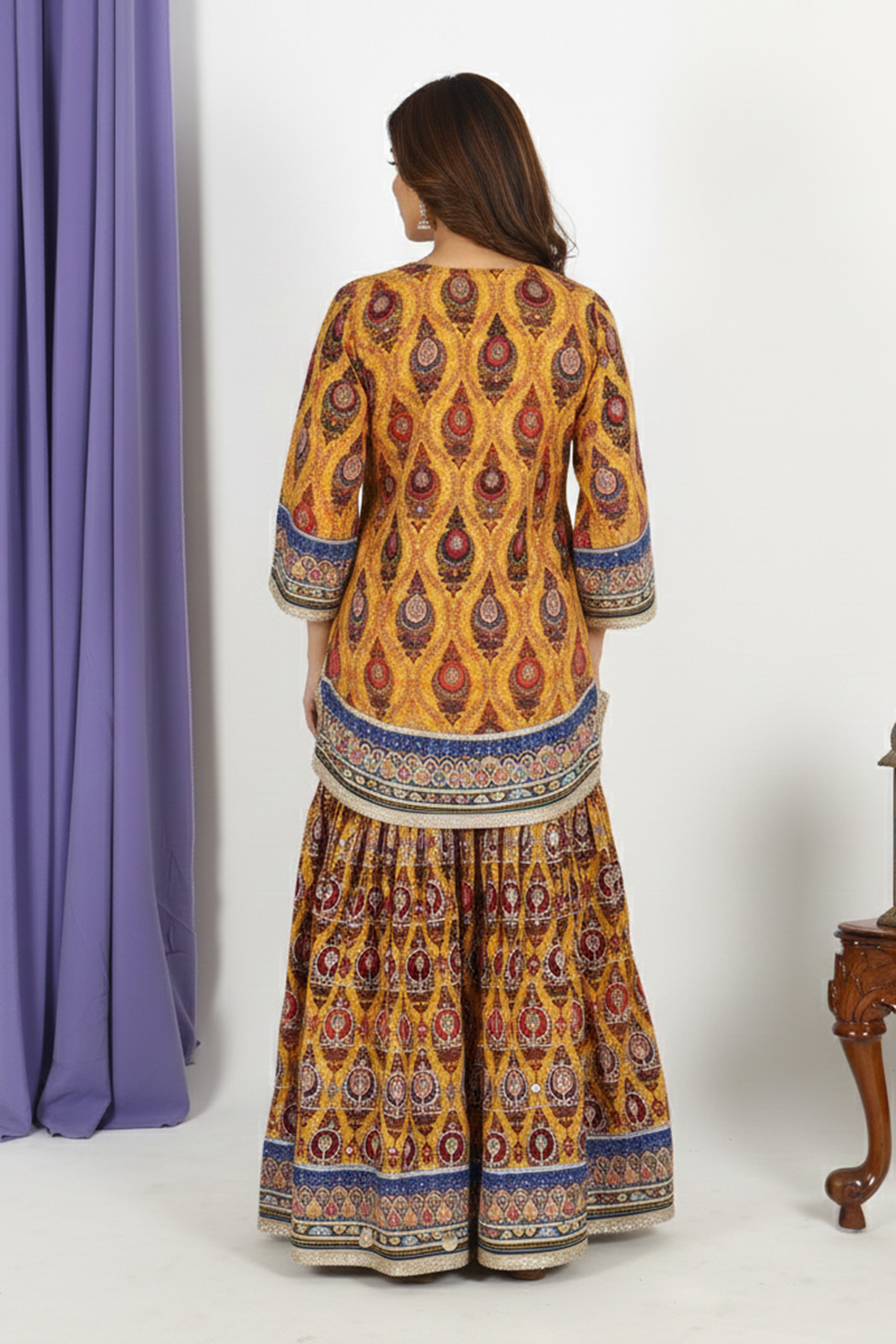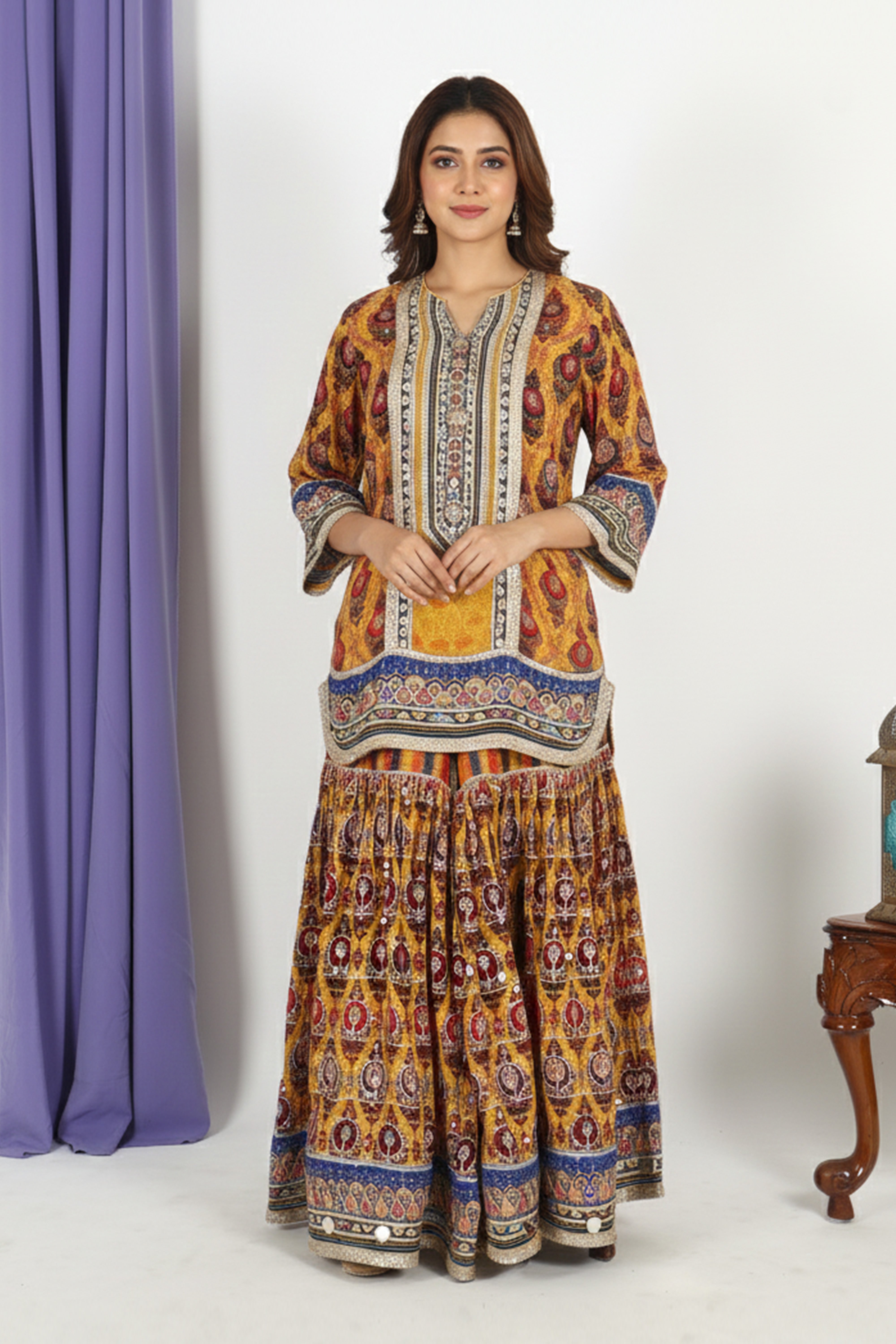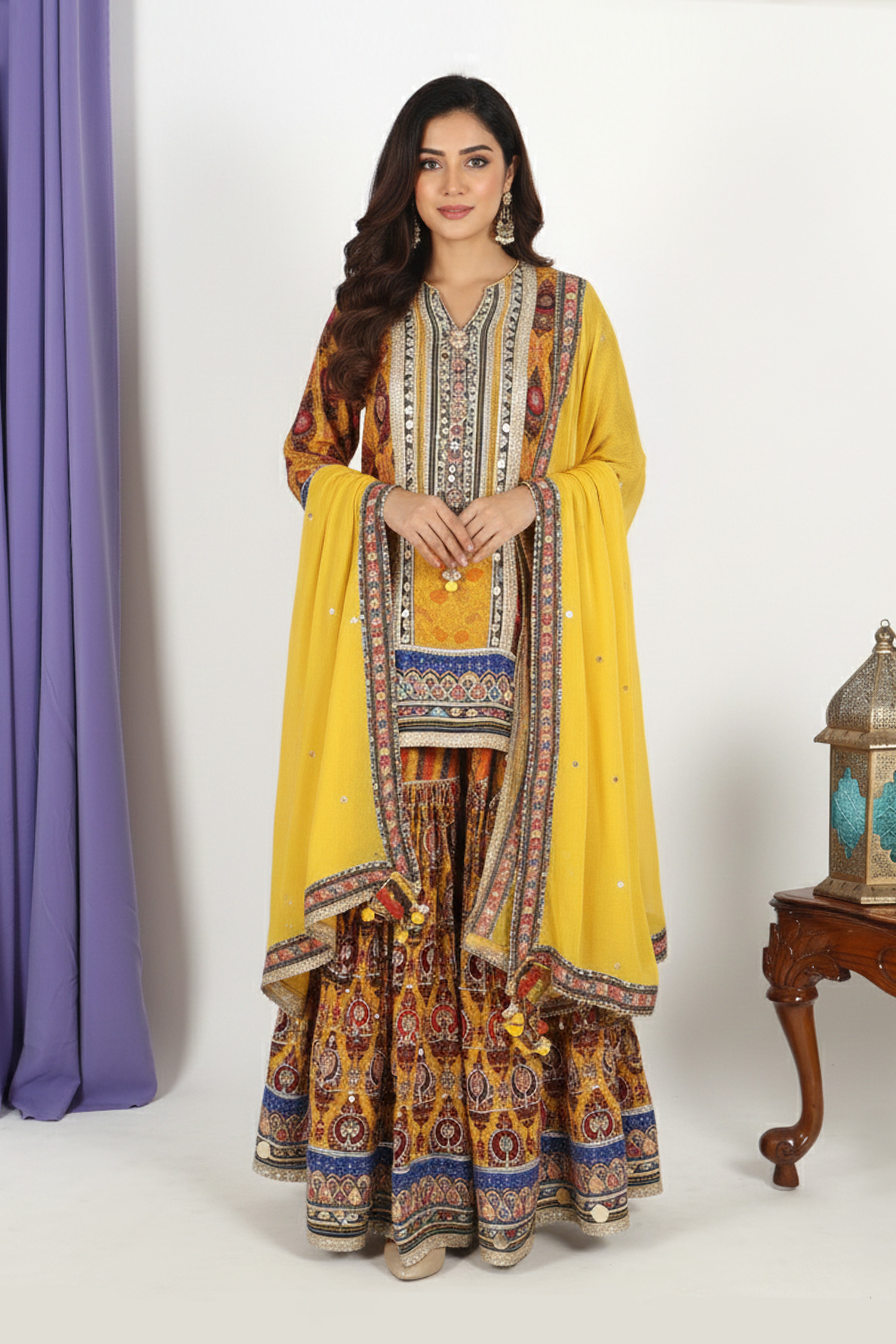 Paired with a flared printed sharara that mirrors the kurta’s design palette, the ensemble offers a graceful and eye-catching silhouette. The look is completed with a soft mustard dupatta adorned with delicate embellishments and a finely crafted border, giving it a polished, festive-ready appeal.