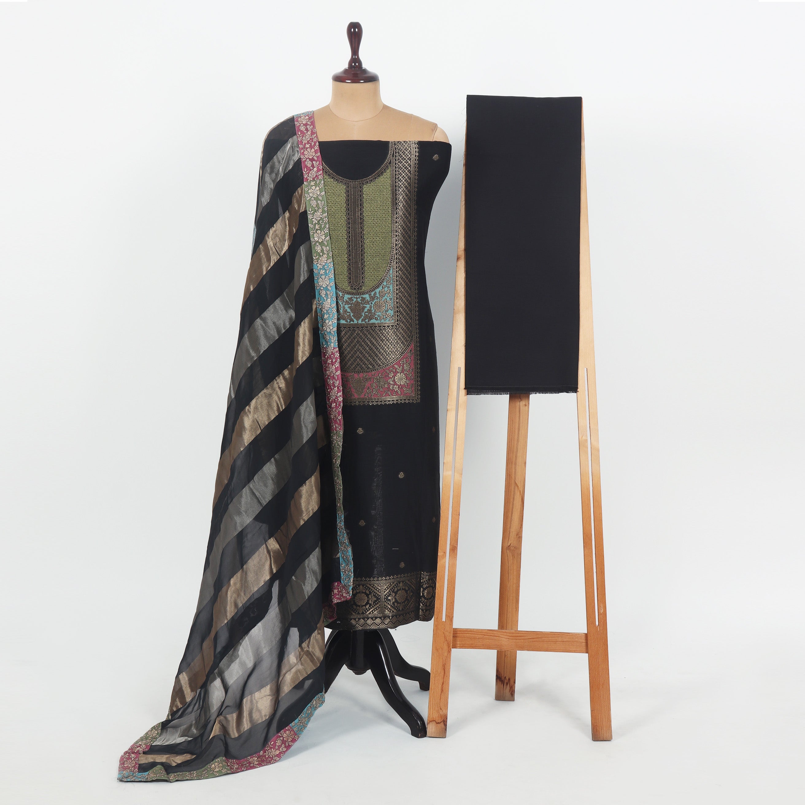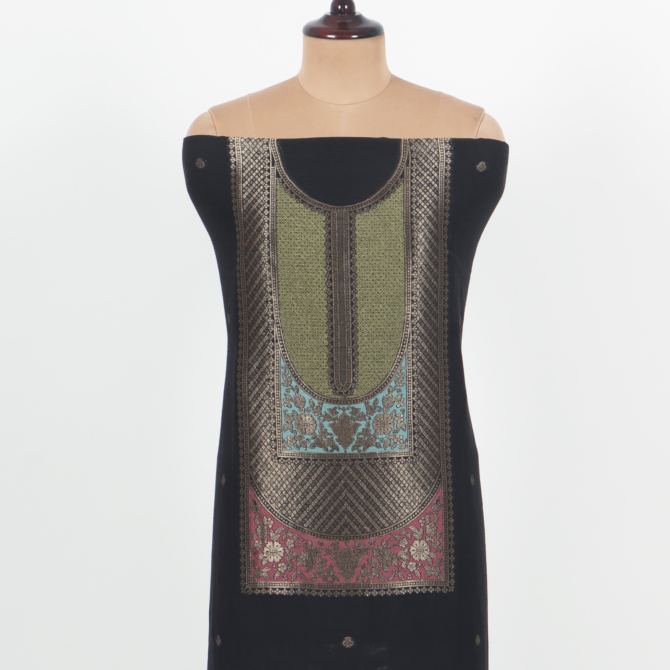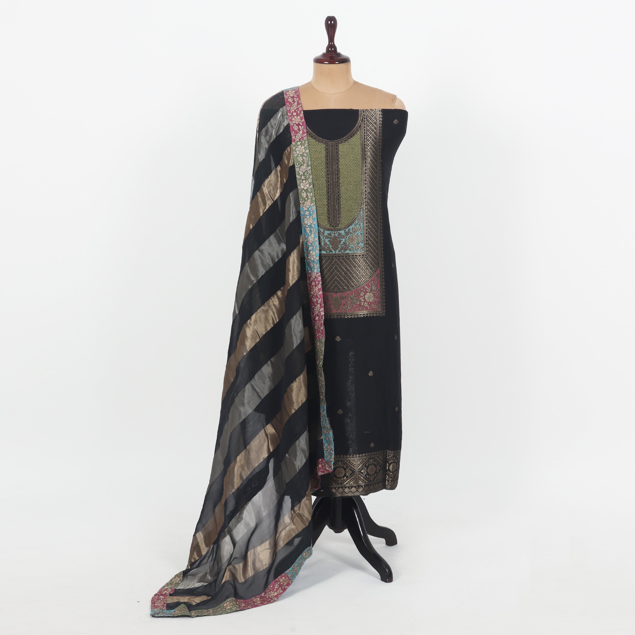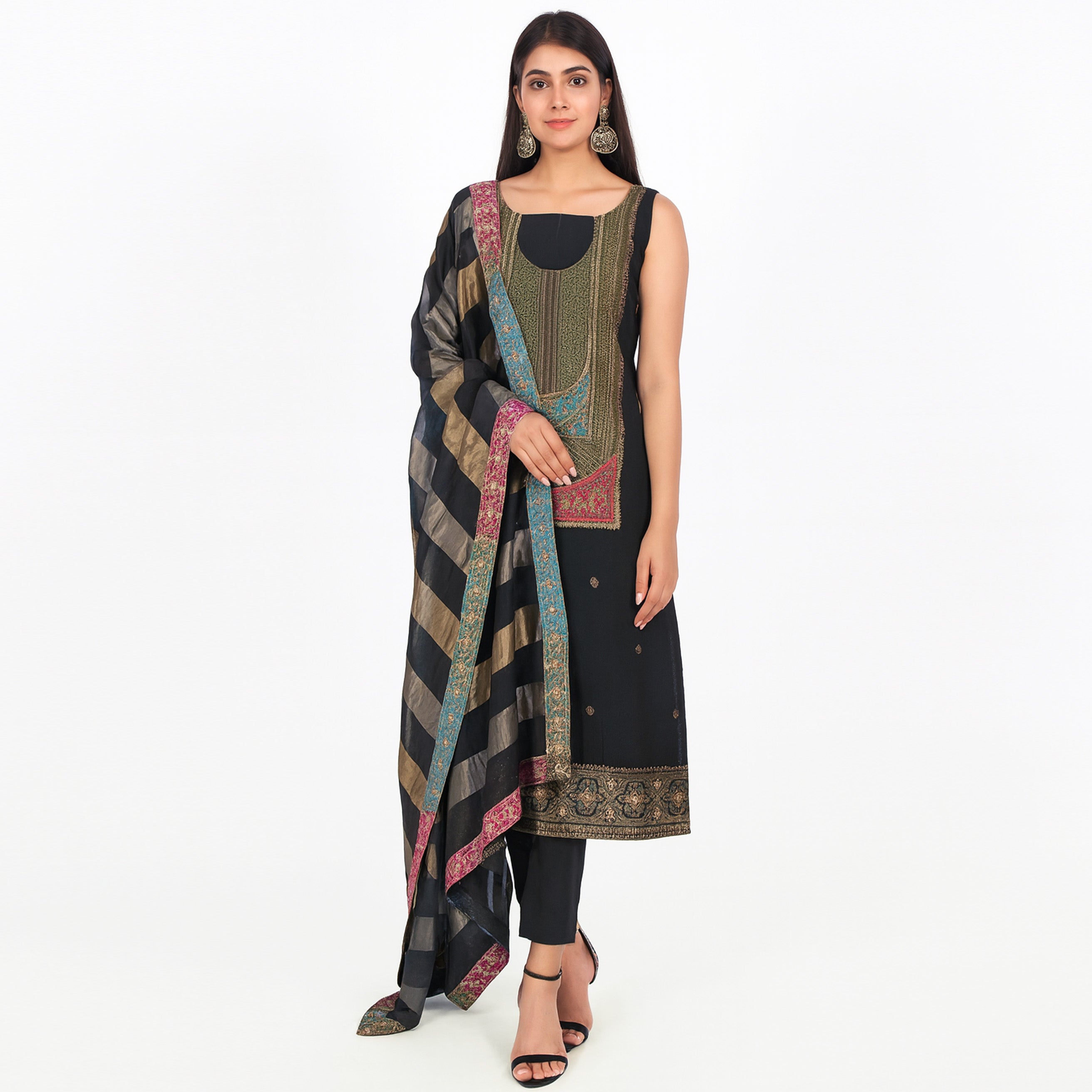 Refresh availabilityElevate your wardrobe with the Black Blue Unstitched Dola Silk Suit, crafted from premium Dola silk known for its soft texture and natural sheen. This unstitched fabric offers versatility to tailor a custom fit, perfect for creating elegant traditional or contemporary attire. The rich black and blue hues blend sophistication with timeless appeal, making it an ideal choice for festive occasions and formal events. Embrace the luxurious feel and effortless style this fabric brings to your personalized wardrobe creation.