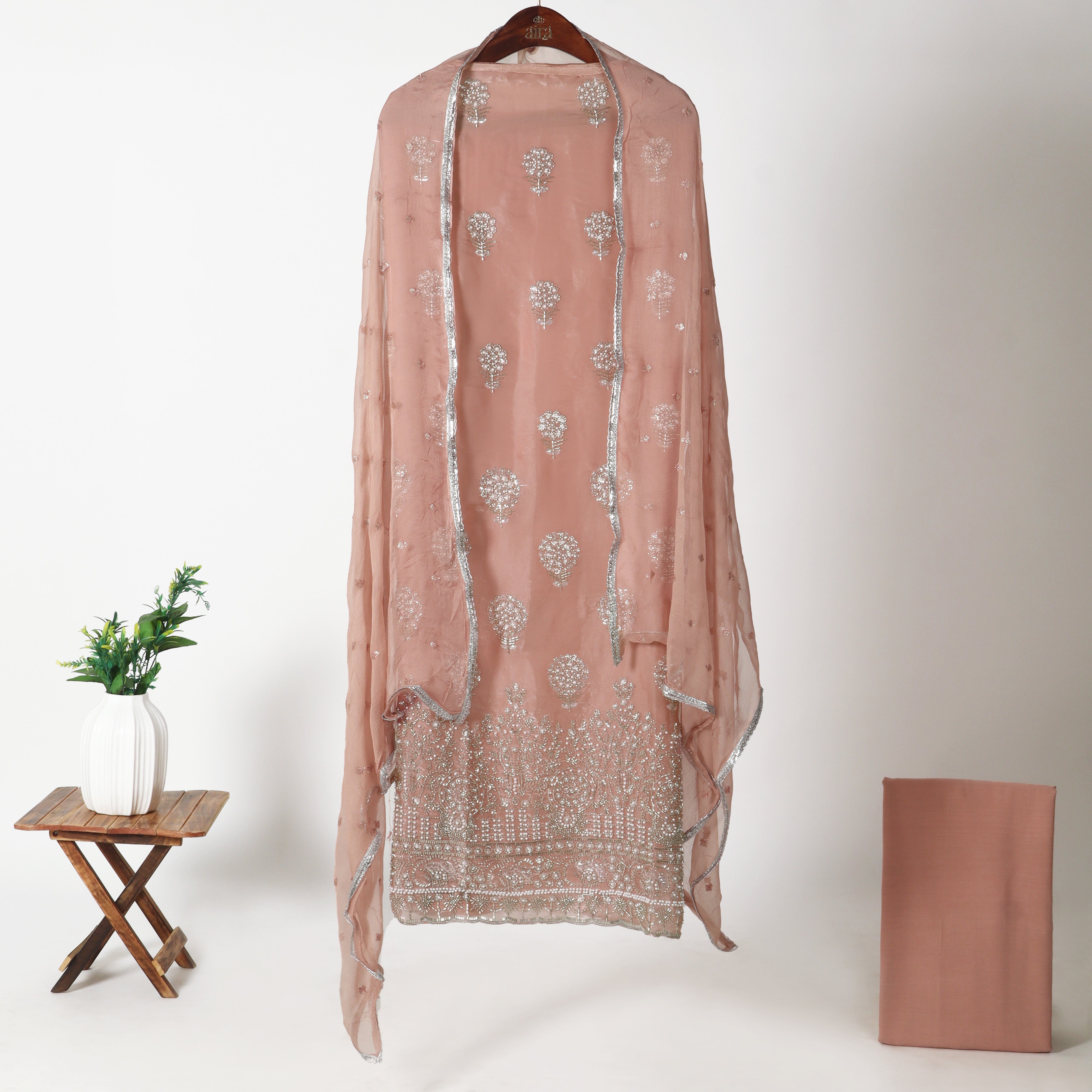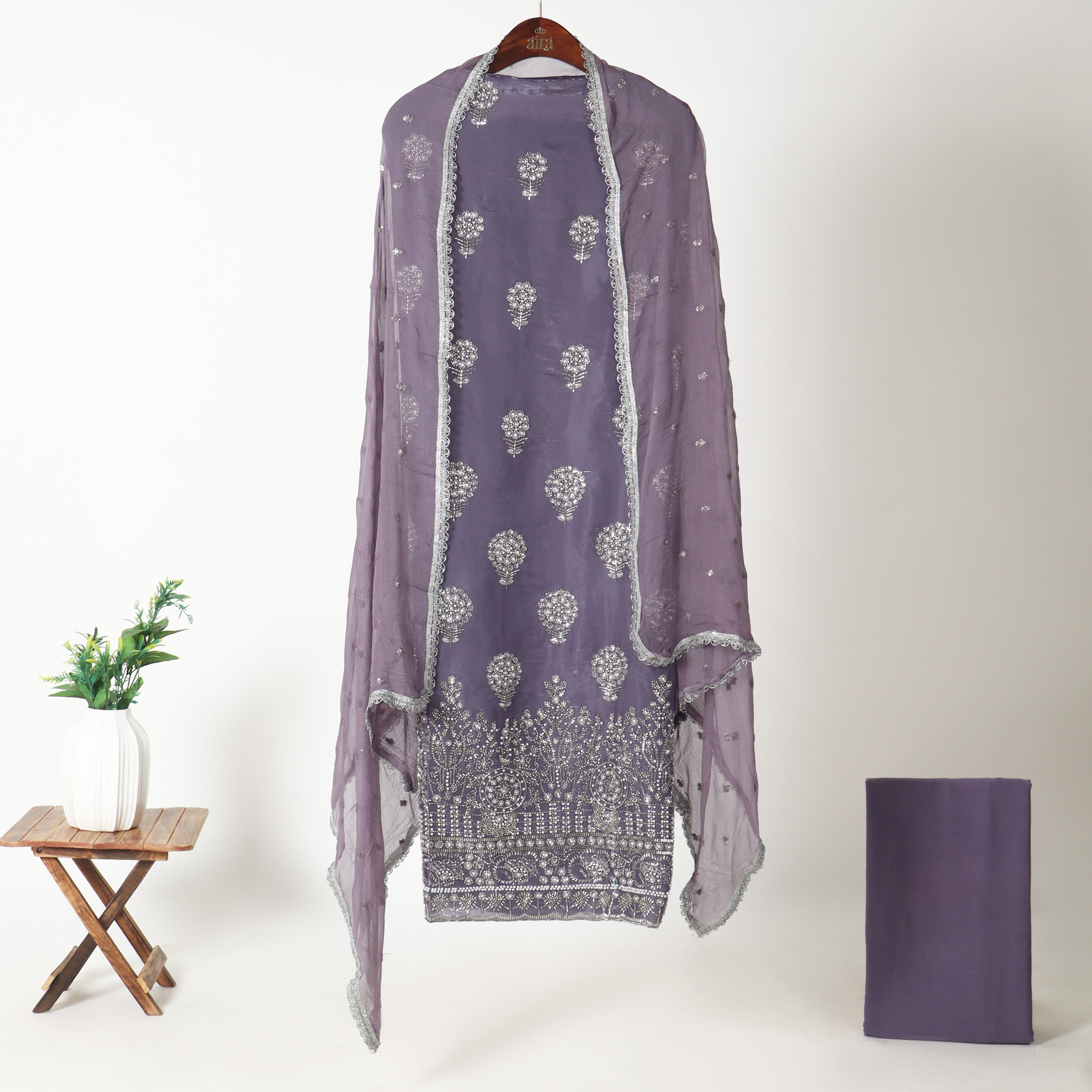 Refresh availabilityGraceful and delicately luminous, the Embroidered Unstitched Jimmy-Choo Suit is crafted for elegant festive moments and refined occasions. The kurta fabric is adorned with evenly spaced silver floral motifs that add a soft shimmer, while the richly embroidered hem enhances the ensemble with intricate detailing and depth.