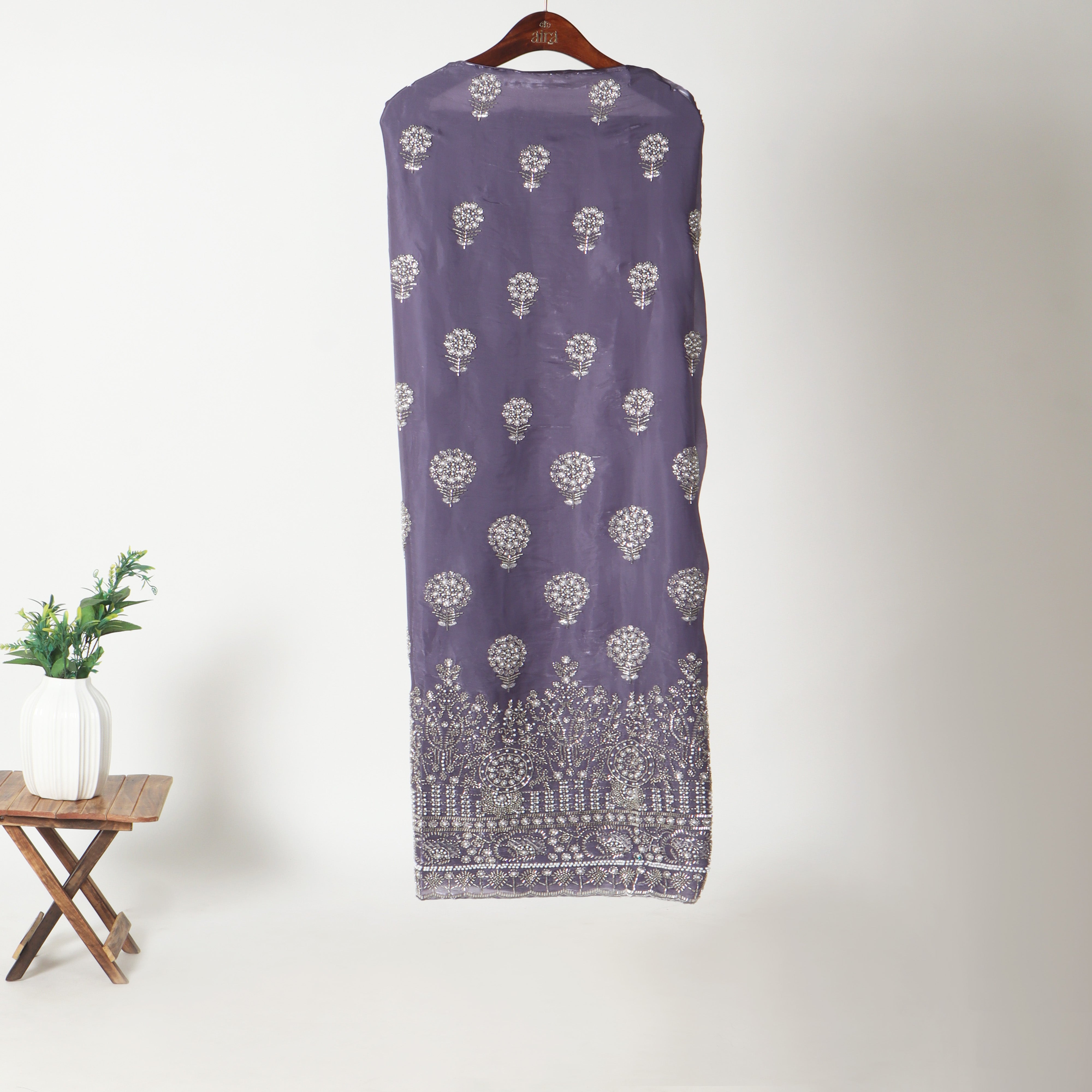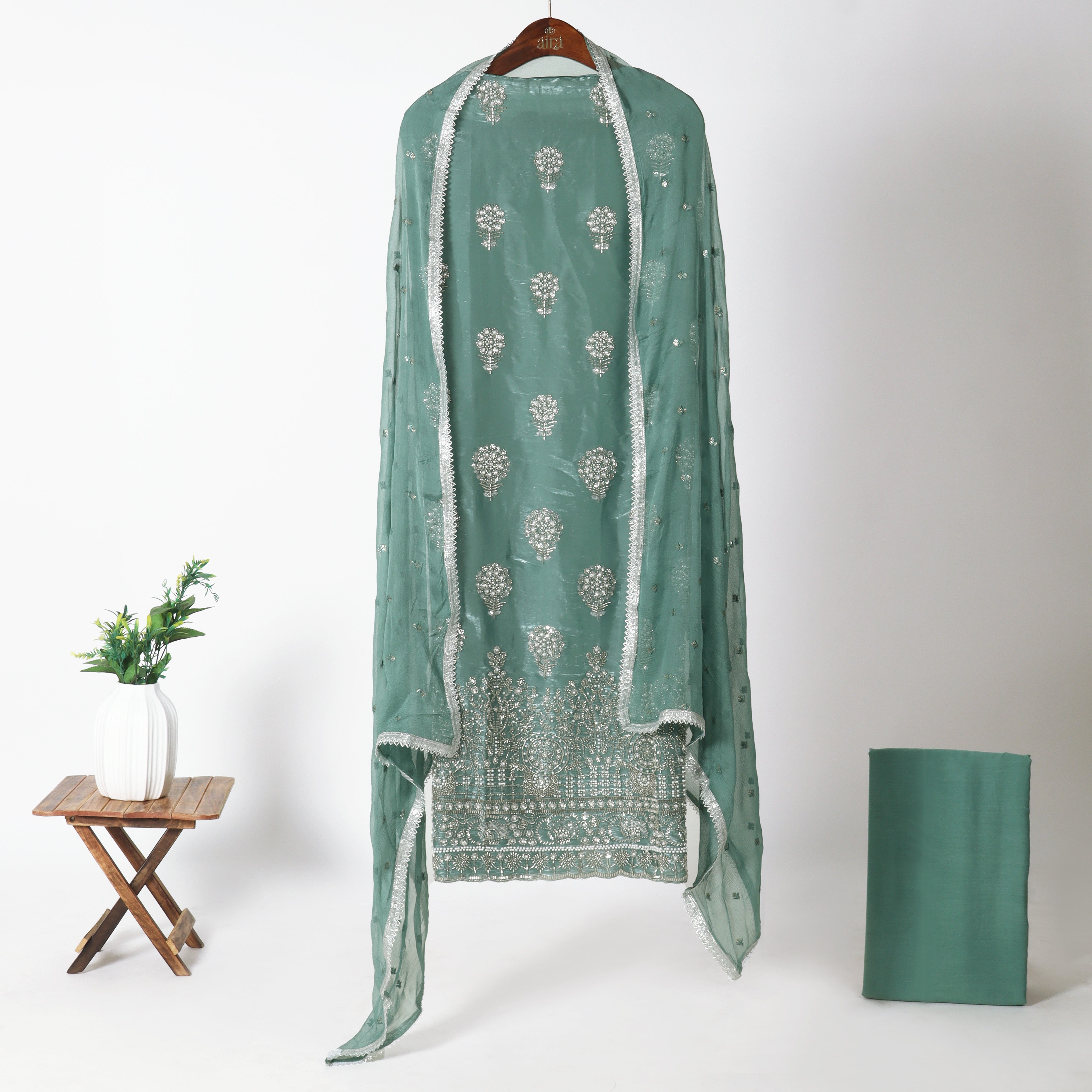 Complementing the kurta is a sheer embroidered dupatta, finished with a subtle silver lace border that lends a fluid, graceful drape. The coordinated solid bottom fabric balances the look beautifully, allowing for comfortable and customised stitching as per your preferred silhouette.