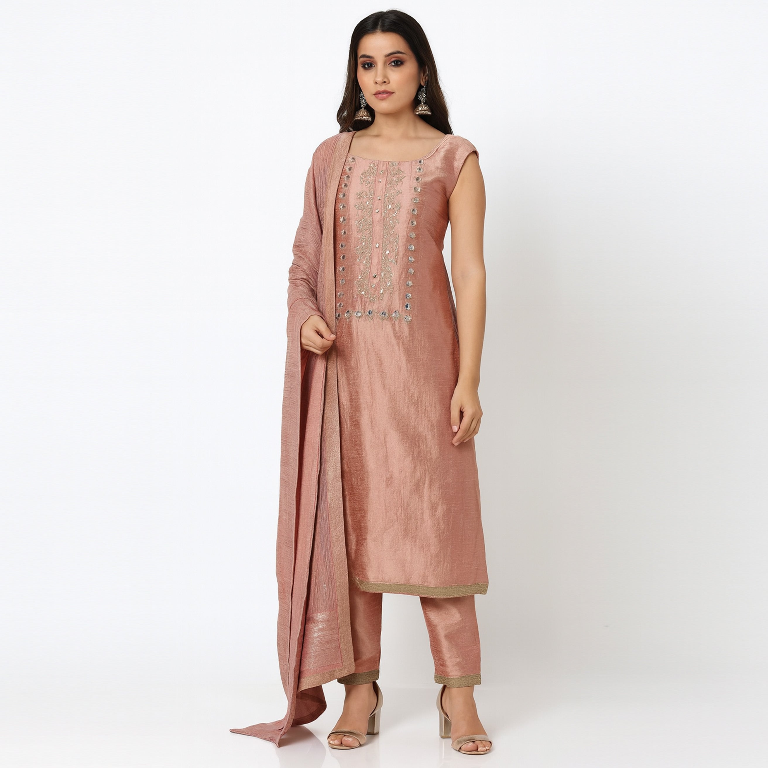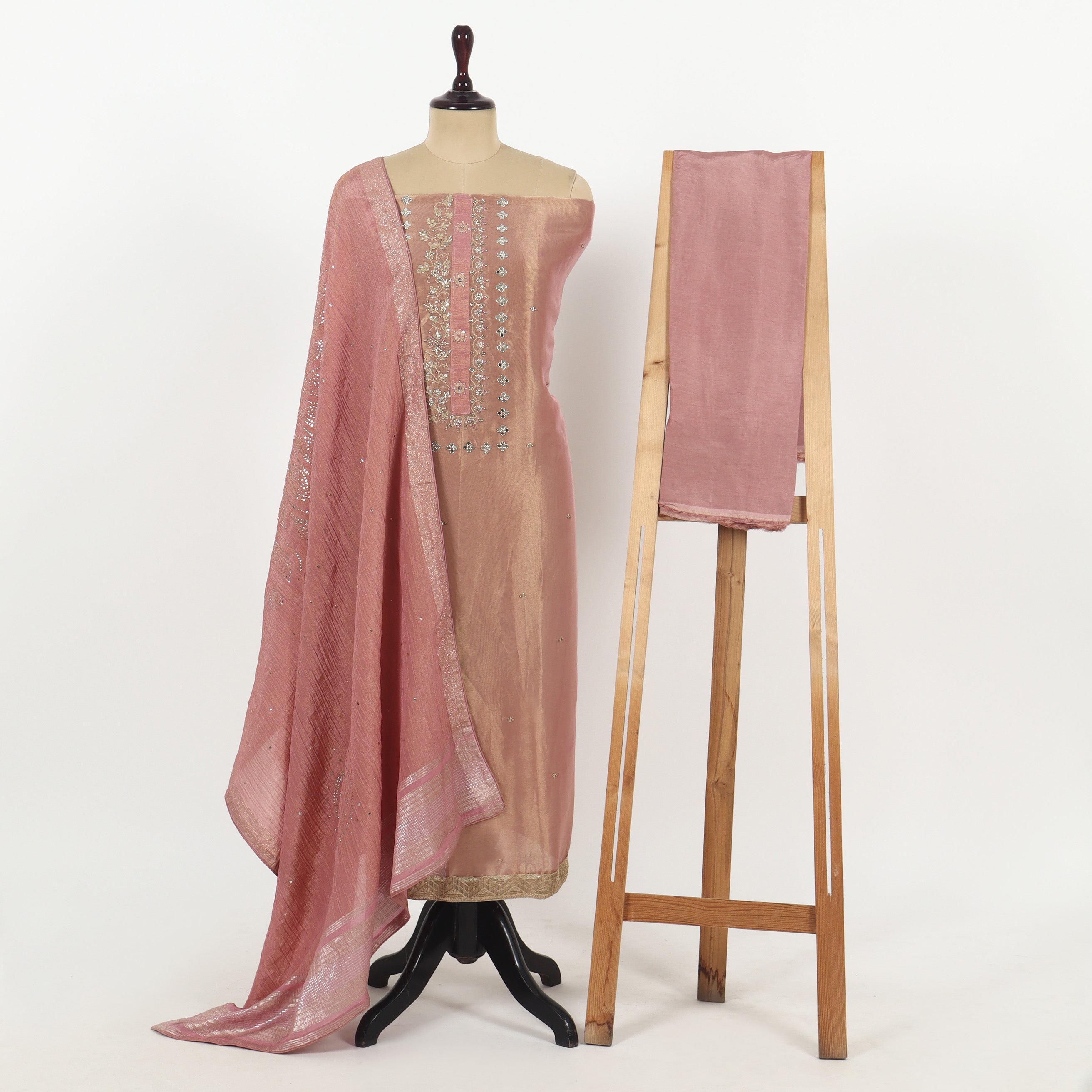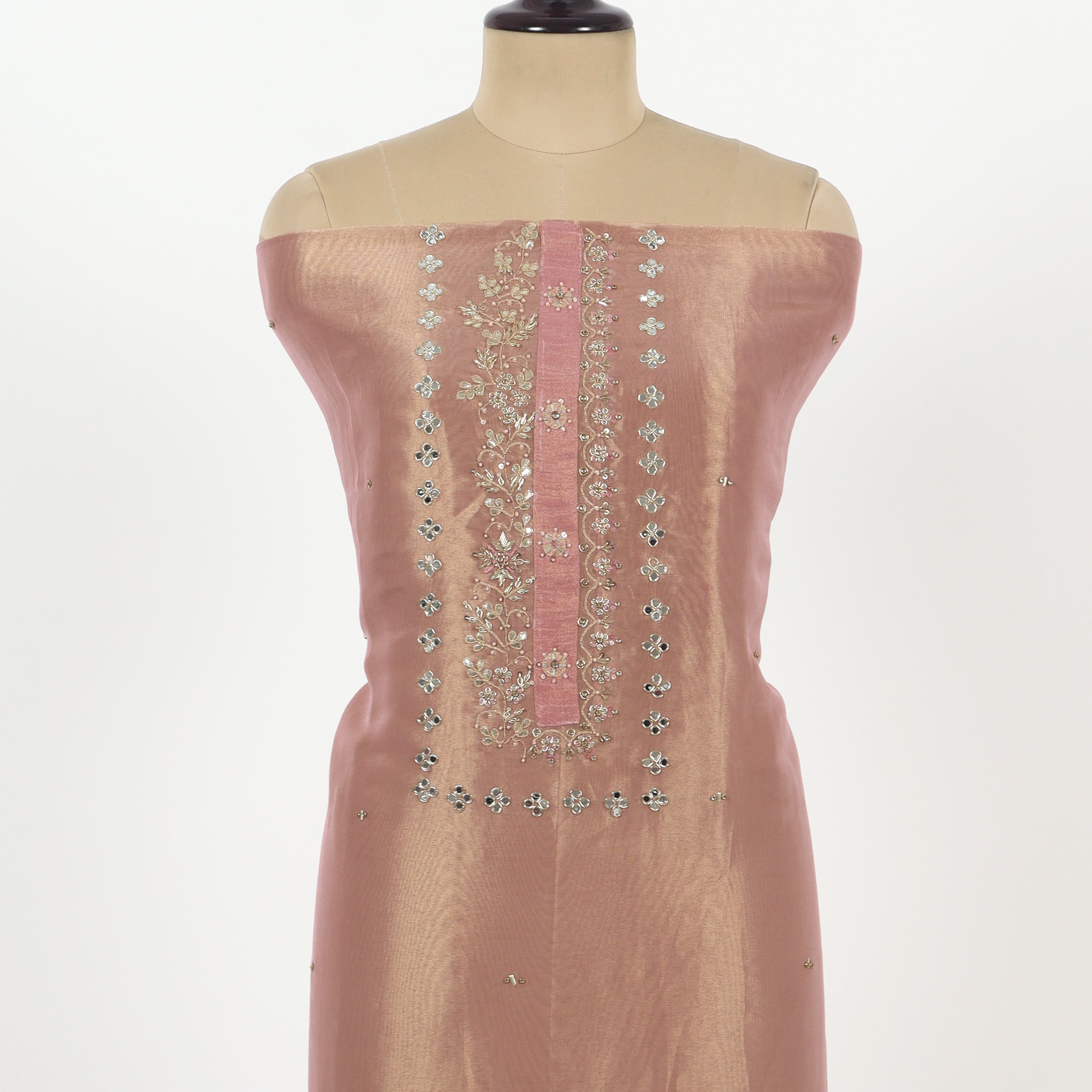Refresh availabilityElevate your wardrobe with this pastel pink unstitched tissue suit. Crafted from lightweight, breathable tissue fabric, it ensures comfort throughout the day while offering a delicate sheen for a subtle, refined look. Perfect for customization, this fabric allows you to tailor your outfit to match your style and fit preferences. Ideal for both casual and semi-formal occasions, it combines elegance with versatility for a timeless addition to your collection.
