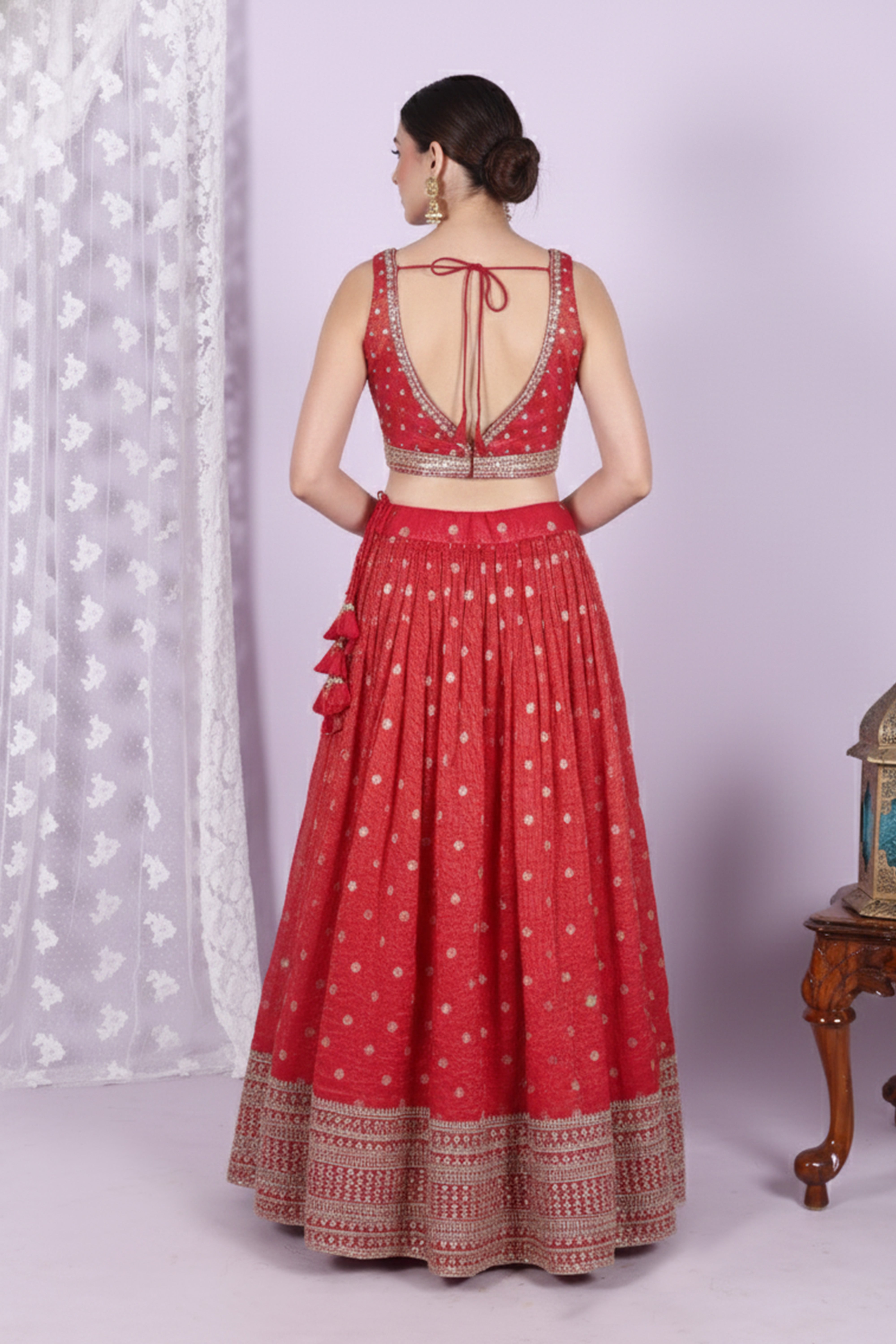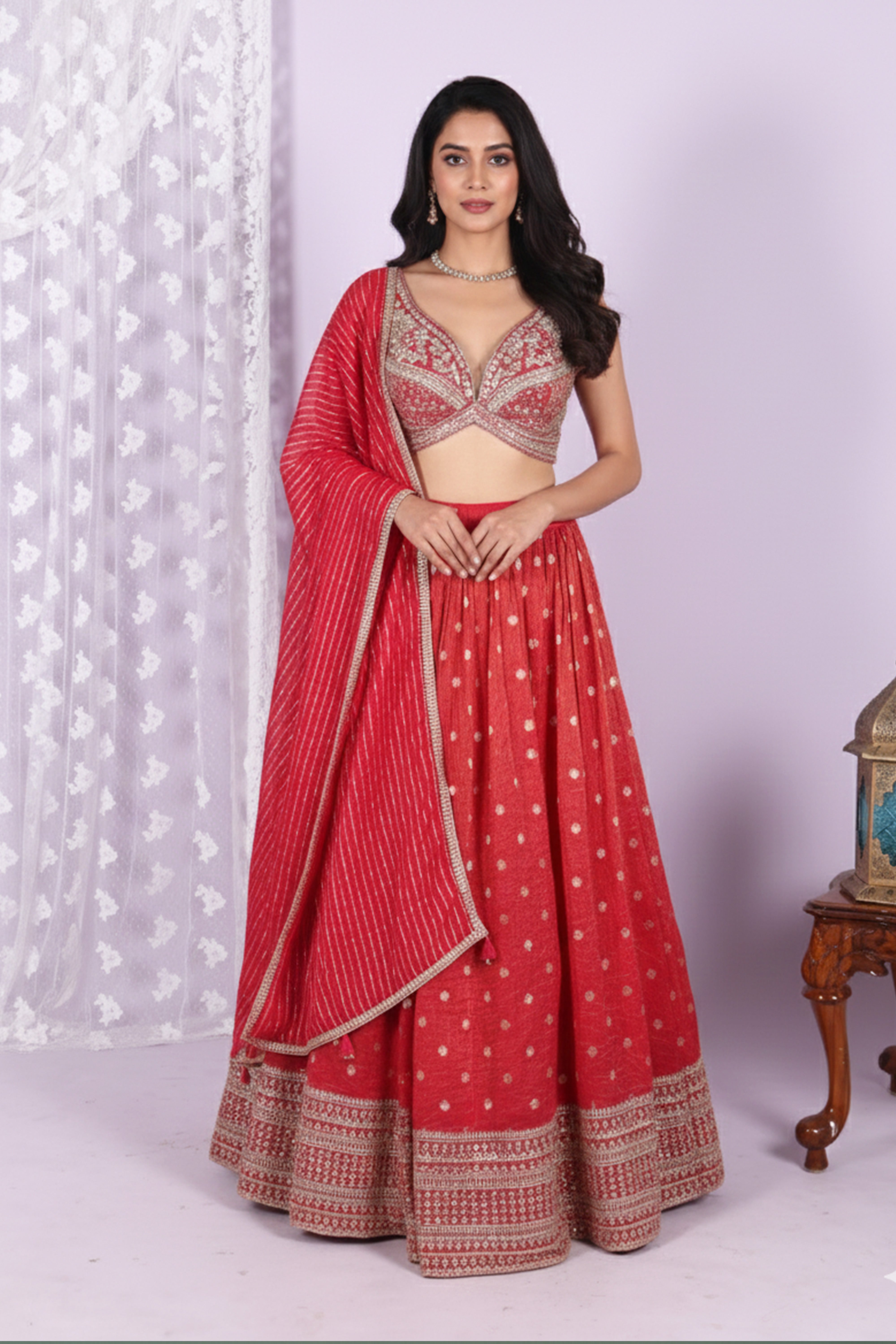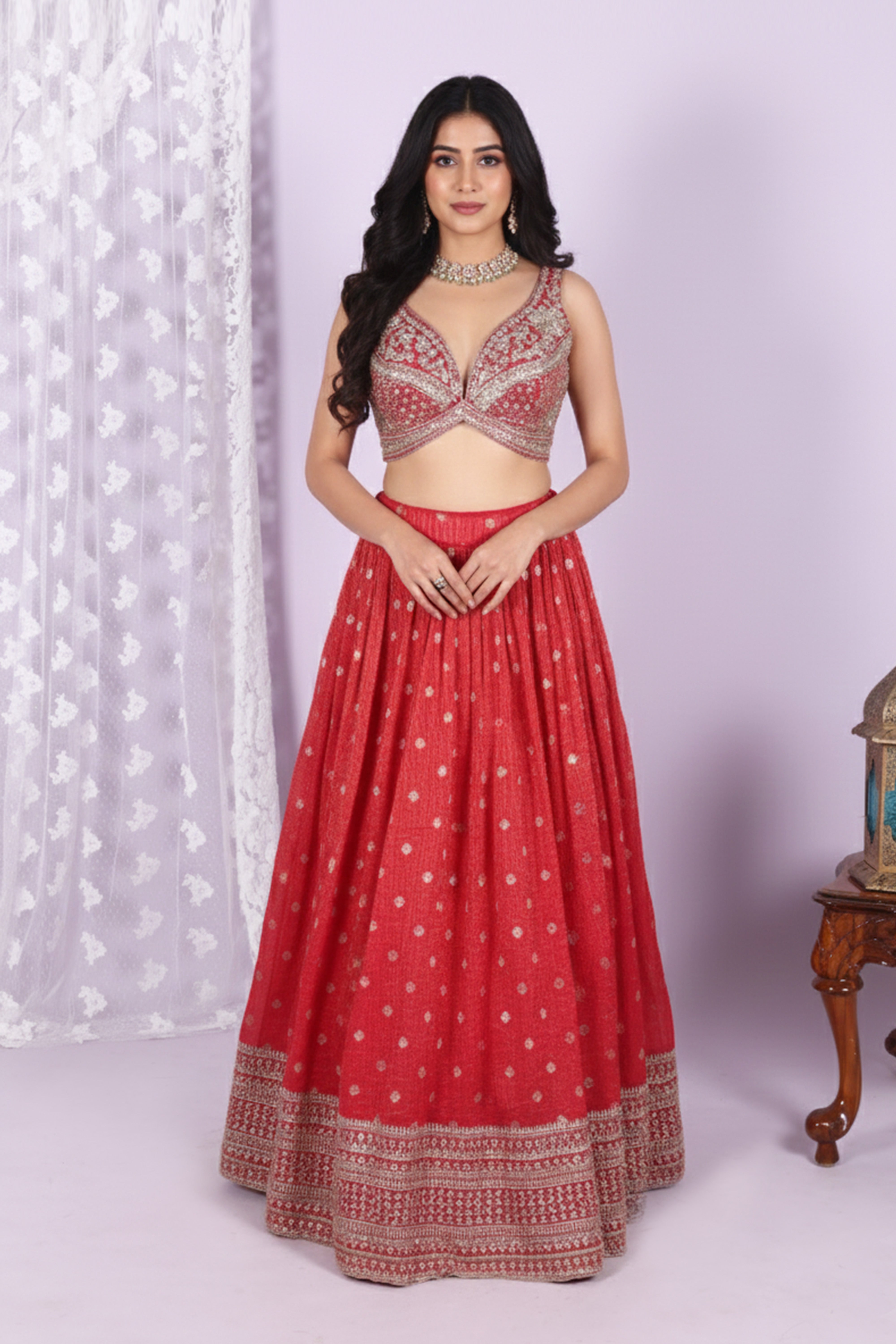 Refresh availabilityElevate your festive look with this stunning red embroidered lehenga choli set. The outfit features a beautifully crafted blouse with intricate embroidery, creating a rich and glamorous appeal. The deep neckline and detailed embellishments add a modern charm while maintaining a traditional elegance.
