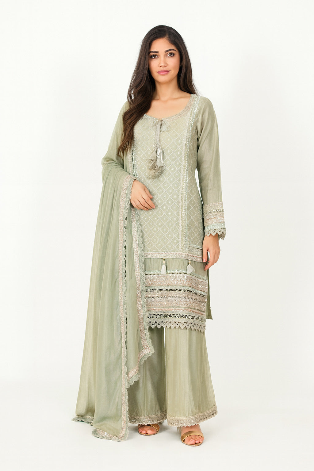 Refresh availabilityThis Sea Green Color Stitched Plazo Set offers a perfect blend of comfort and style, tailored with expert precision. The meticulous stitching enhances durability and adds a polished look, while the refreshing sea green shade brings a vibrant yet elegant touch. Designed for versatility, this set suits both casual and semi-formal occasions, delivering a flattering silhouette and sophisticated appeal.