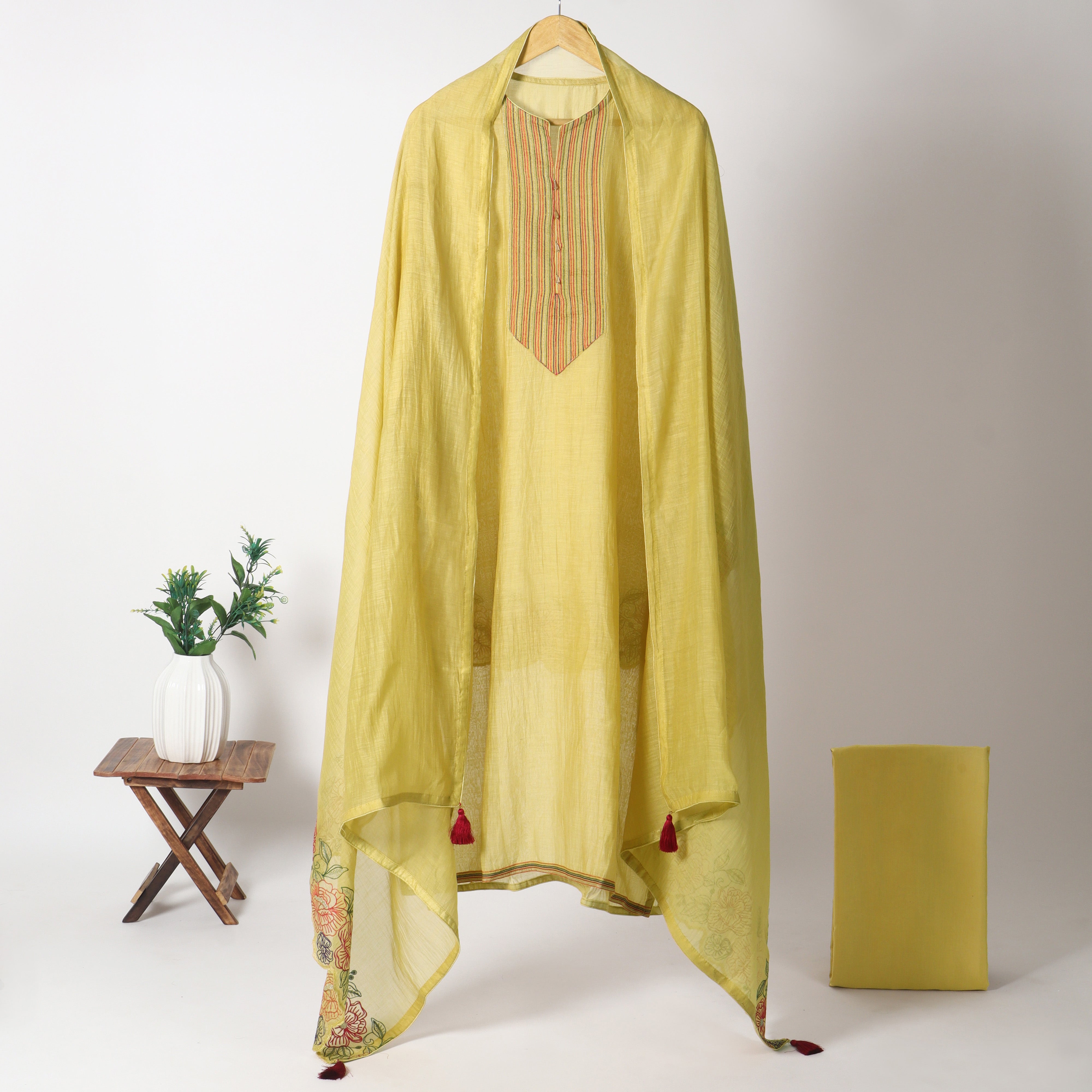 Refresh availabilityCrafted in luxurious Chanderi fabric, this semi-stitched suit blends traditional charm with modern versatility. Known for its soft texture and subtle sheen, Chanderi drapes gracefully, making it perfect for festive wear, weddings, and special occasions. The semi-stitched finish allows you to customize the outfit to your style and fit, ensuring an elegant yet comfortable look.