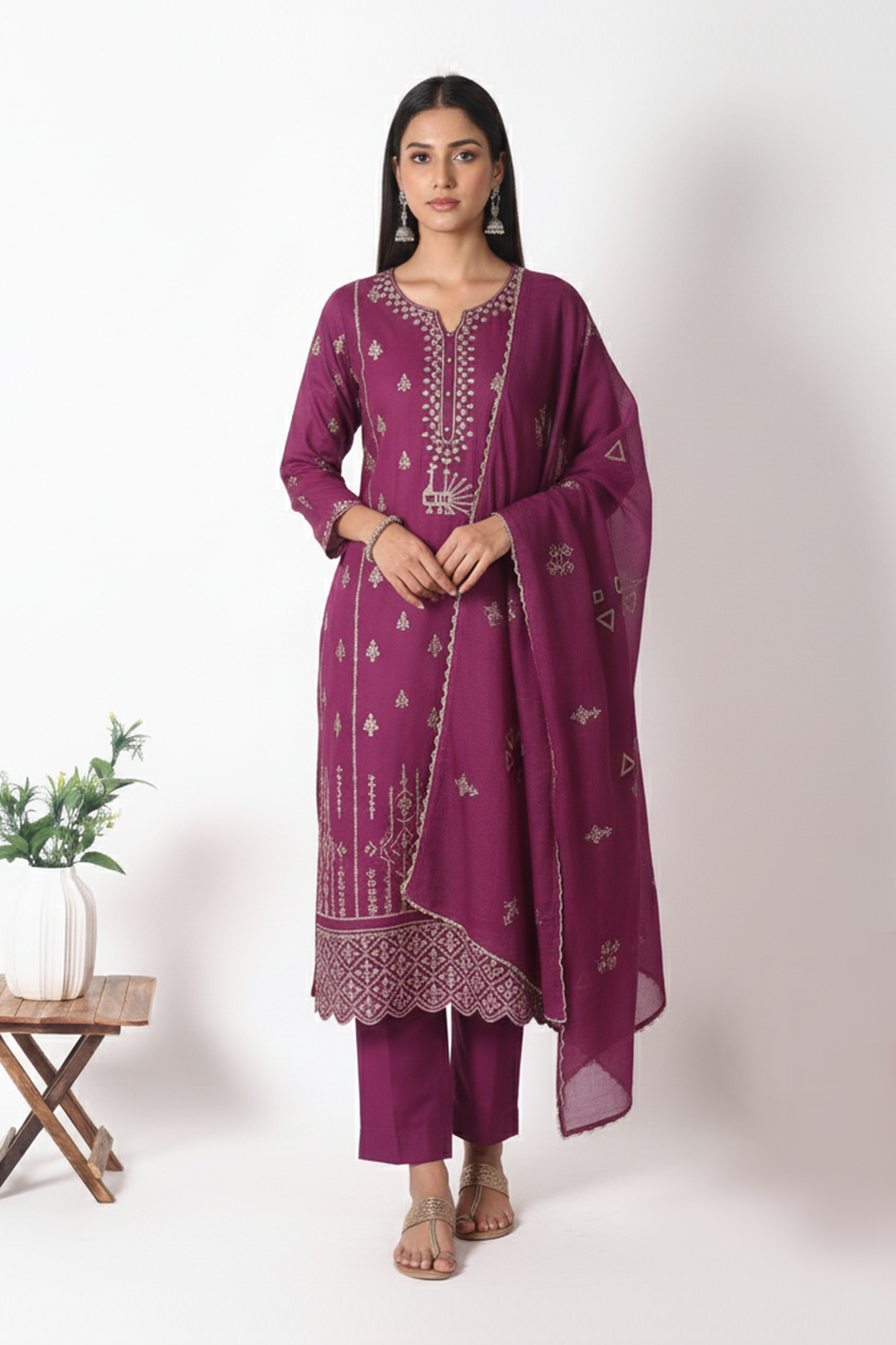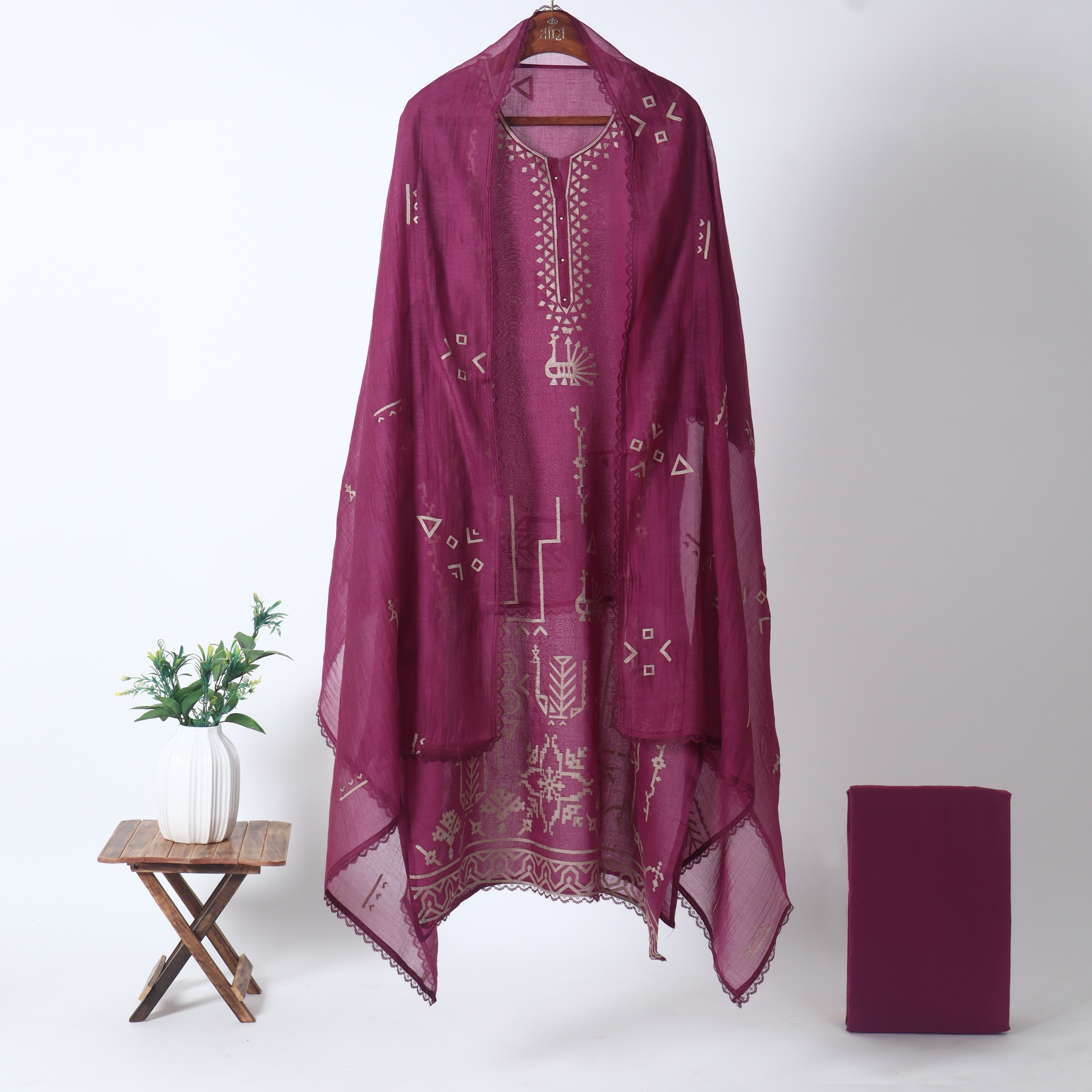 Refresh availabilityThis semi-stitched Chanderi suit embodies elegance and tradition with its lustrous fabric and intricate craftsmanship. Made from premium Chanderi material, it features delicate thread and zari embroidery that adds a refined charm. The semi-stitched design allows for easy tailoring to achieve a perfect fit. Accompanied by an embroidered dupatta and plain matching bottom fabric, this ensemble is perfect for festive occasions, wedding functions, and graceful daytime events.