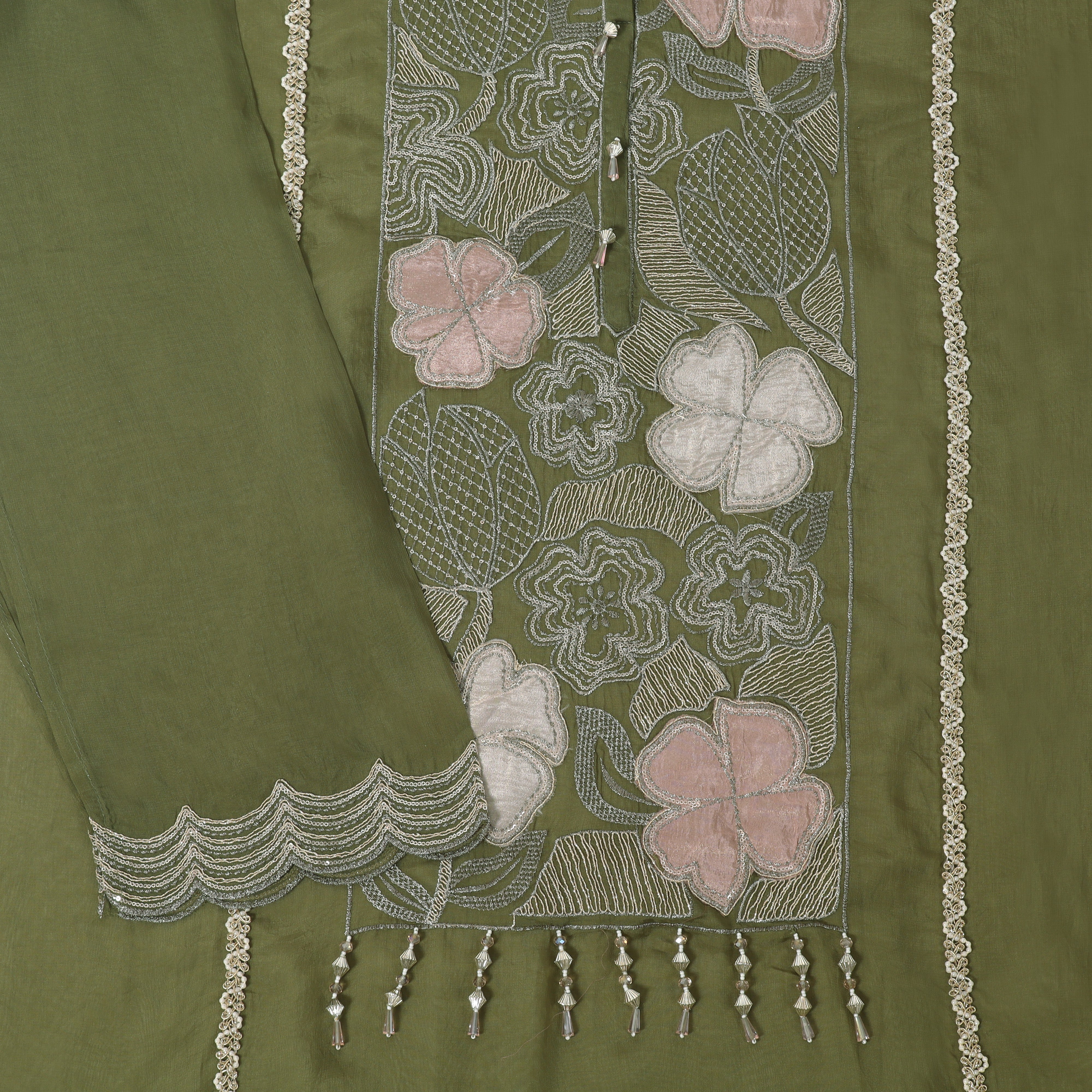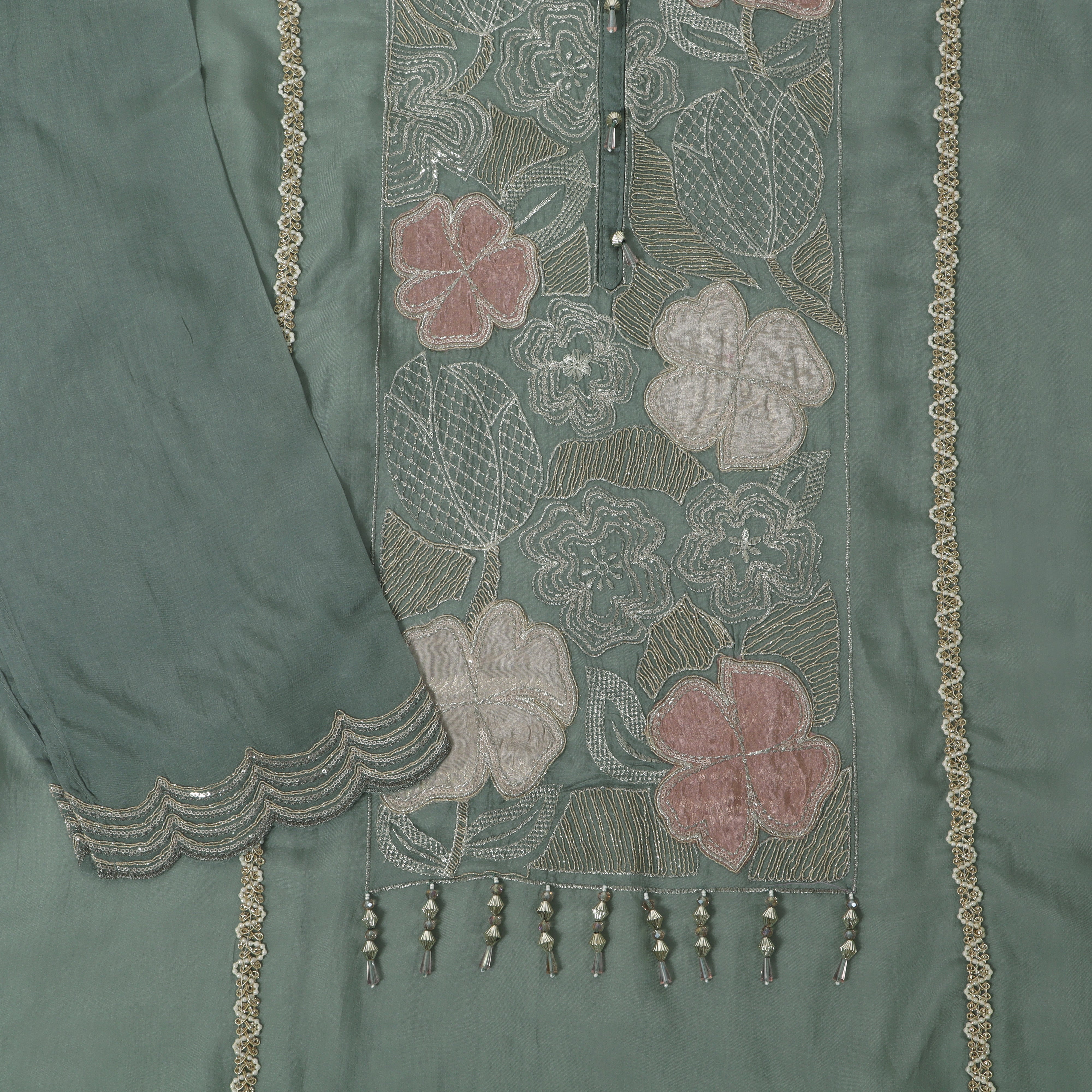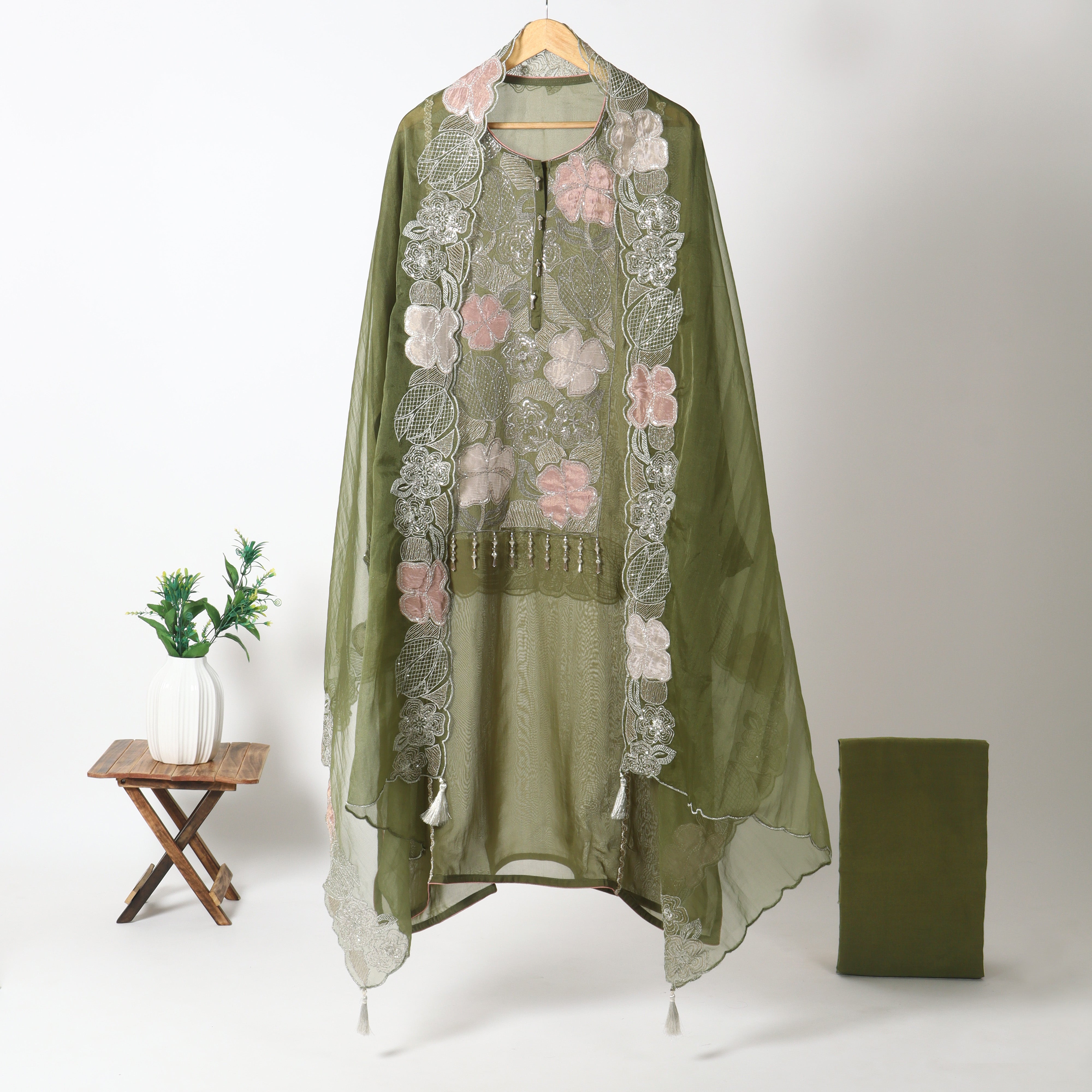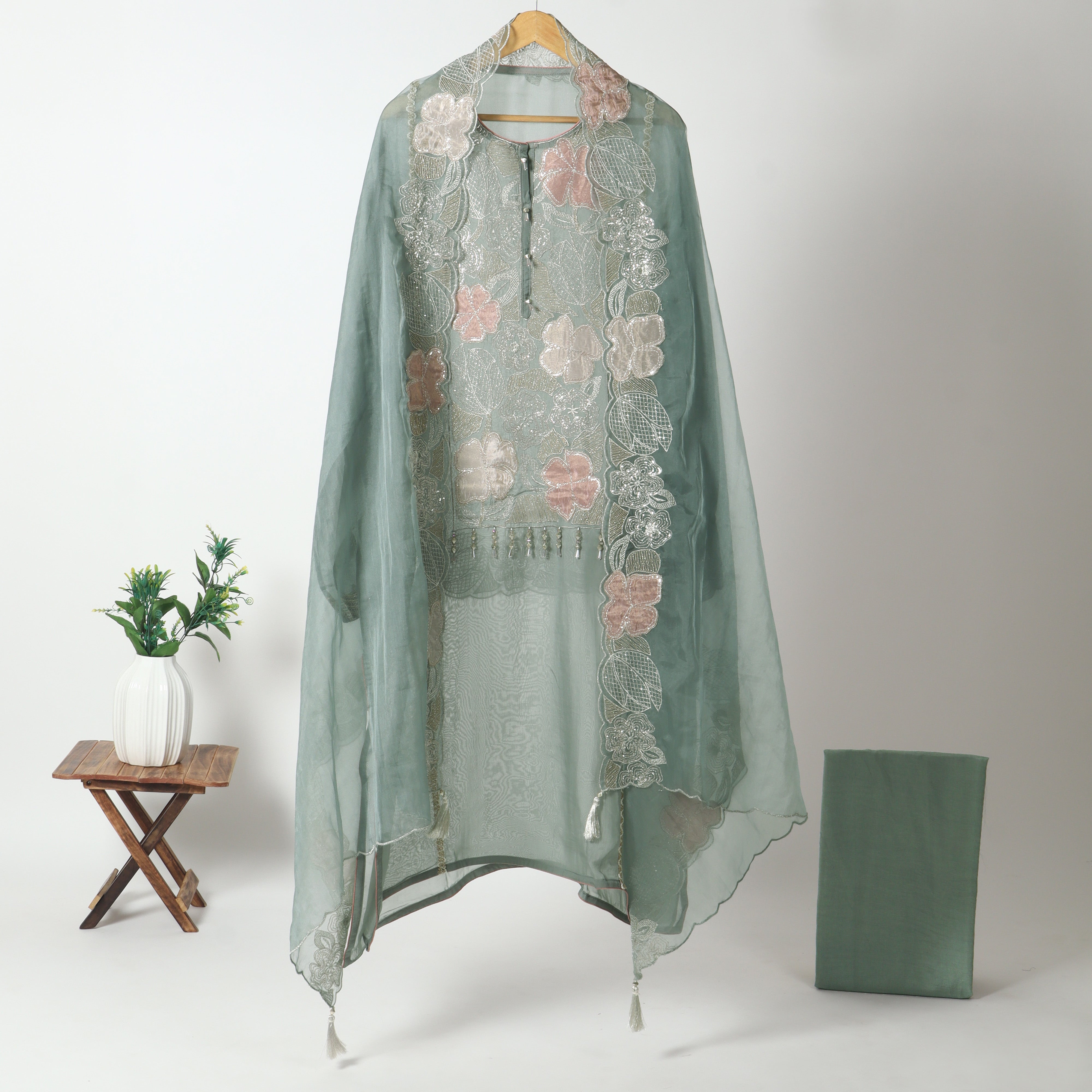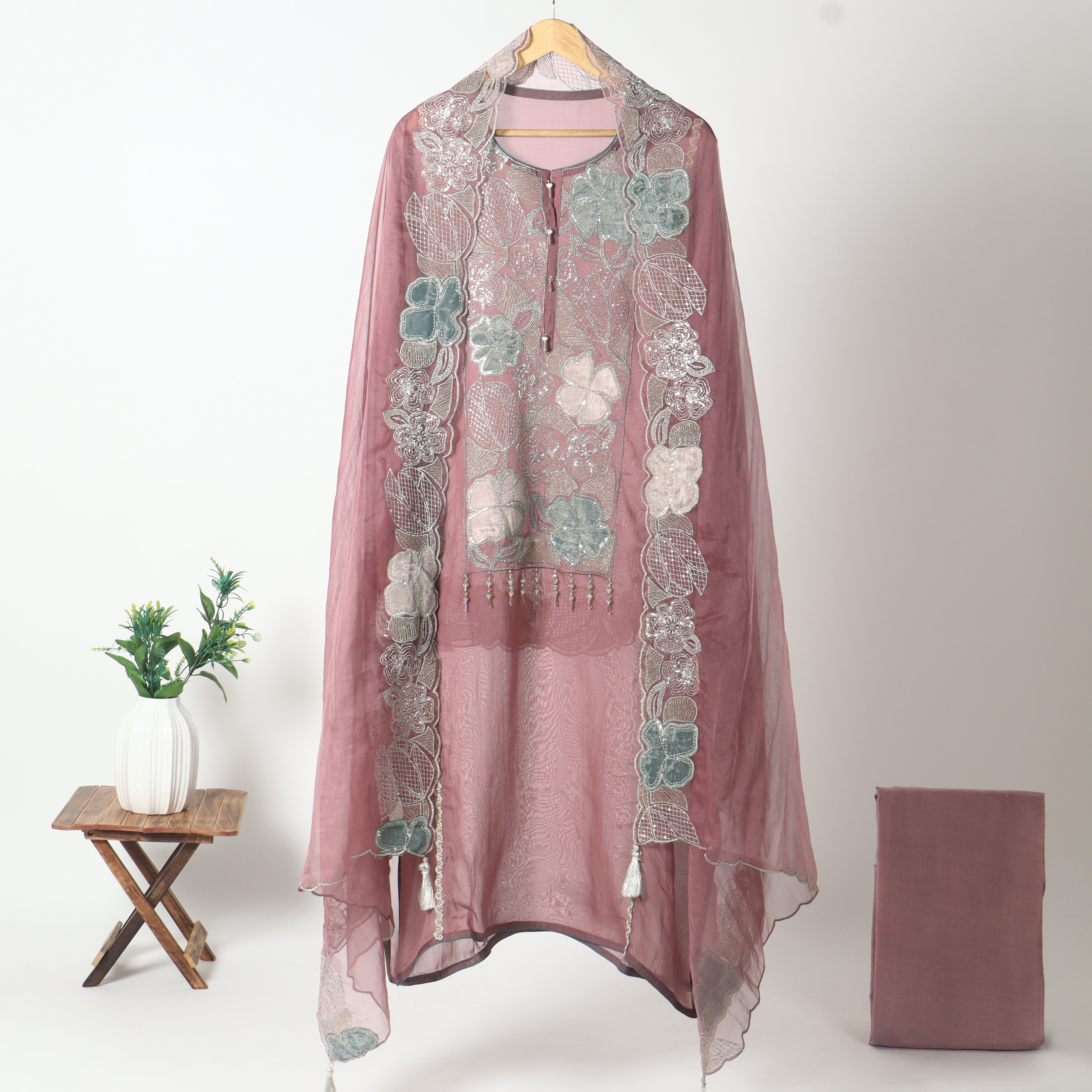 Refresh availabilityDelicate and timeless, this semi-stitched organza suit is crafted from lightweight fabric with a graceful sheer finish. Its subtle shine and airy drape bring an ethereal charm, perfect for festive gatherings, weddings, and elegant evenings. With a semi-stitched design, it offers the flexibility to style and tailor as per your preference, blending sophistication with comfort.
