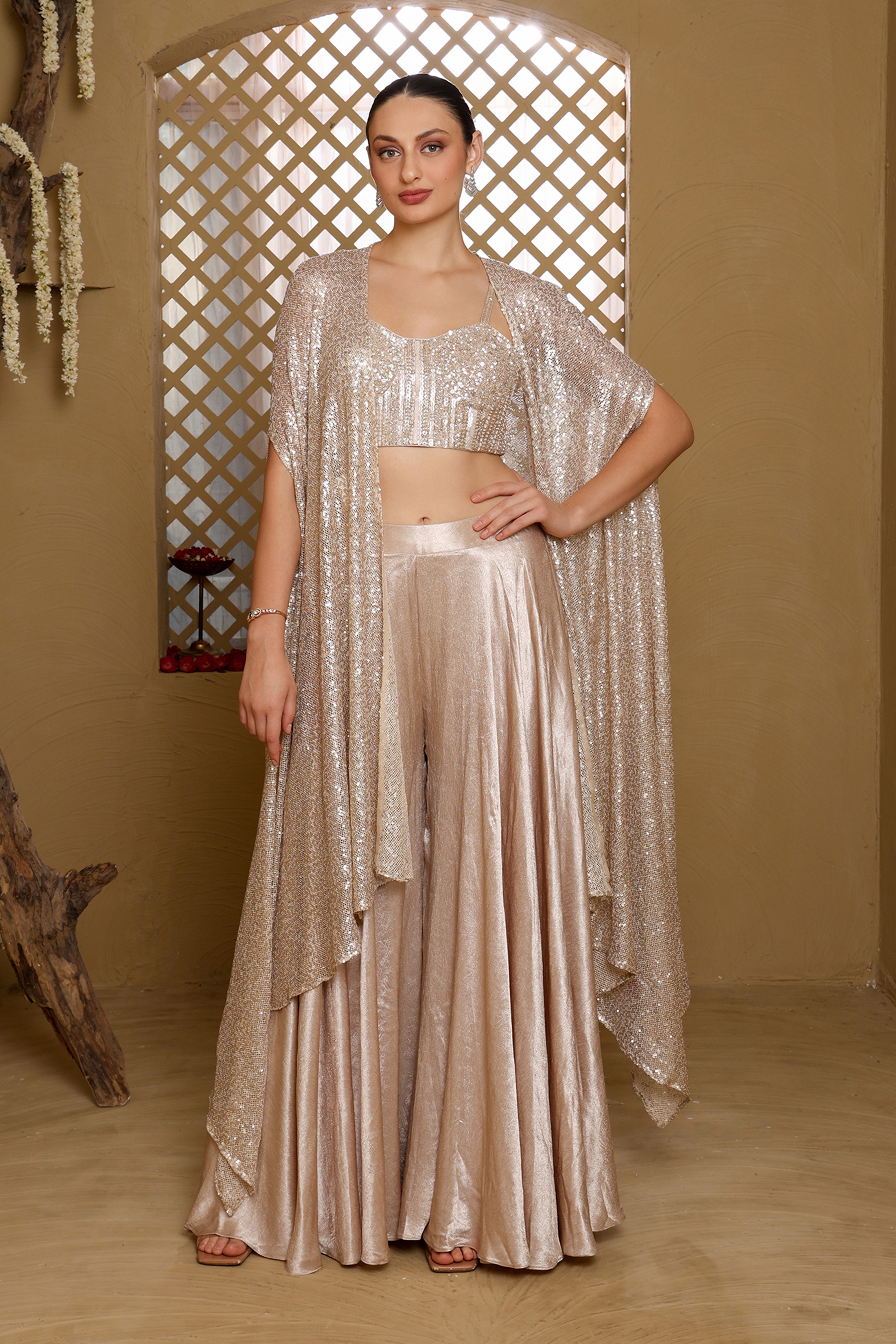 Refresh availabilityRadiate effortless charm in this blush-toned sharara set, a perfect fusion of glam and grace. The outfit features a flowy sharara that drapes luxuriously, paired with a dazzling sequined bustier that adds a modern sparkle to the look. A matching shimmer dupatta completes the ensemble, adding a soft, ethereal touch. Ideal for sangeet nights, receptions, or festive celebrations, this set is designed to make you shine with understated sophistication. Pair it with statement earrings and soft curls for a timeless look.
