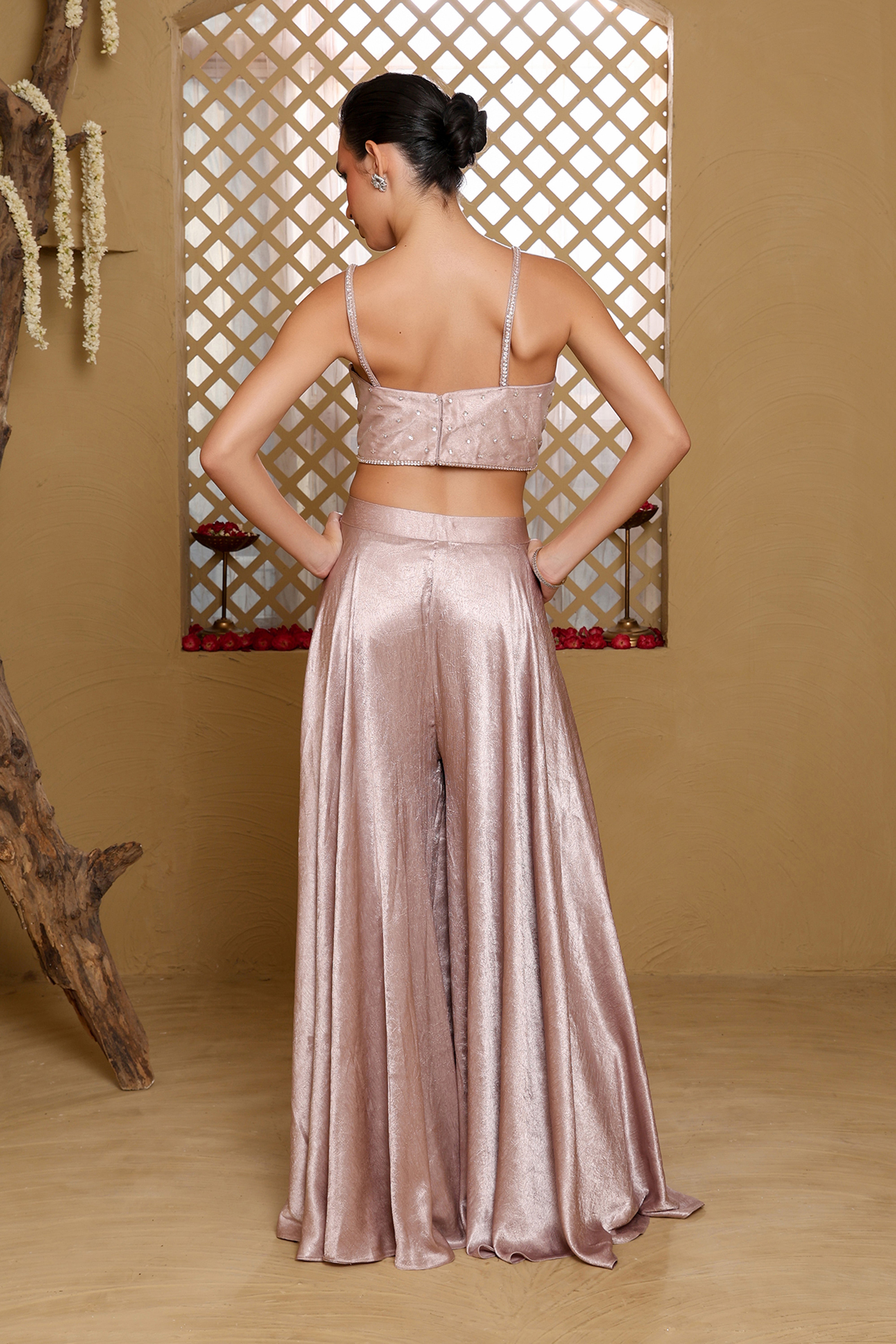 Refresh availabilityRadiate effortless charm in this blush-toned sharara set, a perfect fusion of glam and grace. The outfit features a flowy sharara that drapes luxuriously, paired with a dazzling sequined bustier that adds a modern sparkle to the look. A matching shimmer dupatta completes the ensemble, adding a soft, ethereal touch. Ideal for sangeet nights, receptions, or festive celebrations, this set is designed to make you shine with understated sophistication. Pair it with statement earrings and soft curls for a timeless look.