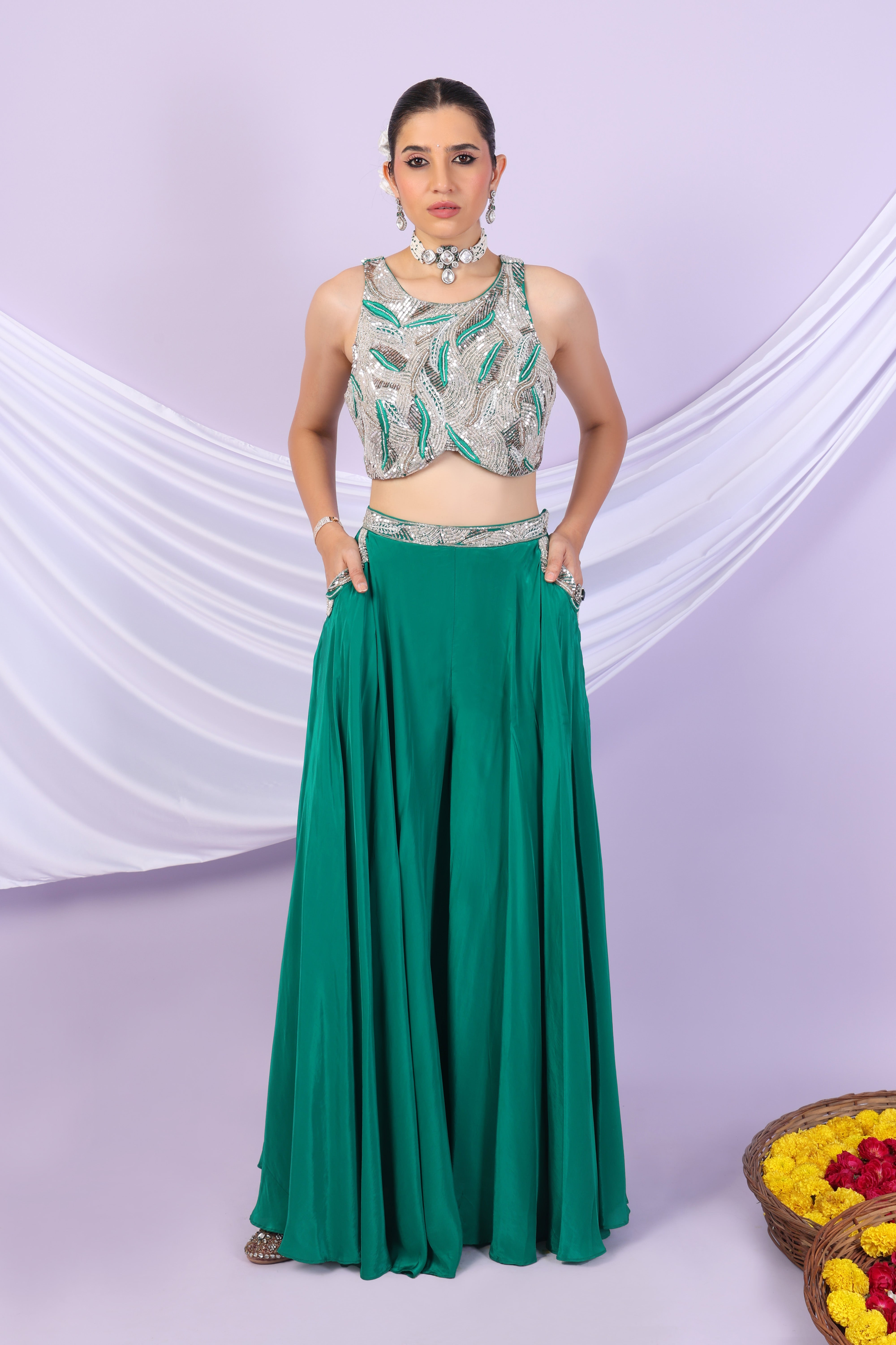 This crop top with gharara set is absolutely stunning! The Rama green color looks so royal and the detailing on the blouse is gorgeous. The fabric has a nice flow, making it perfect for sangeet or wedding functions. It’s super comfortable to wear yet looks very glamorous. Got so many compliments when I wore it. Worth every penny!