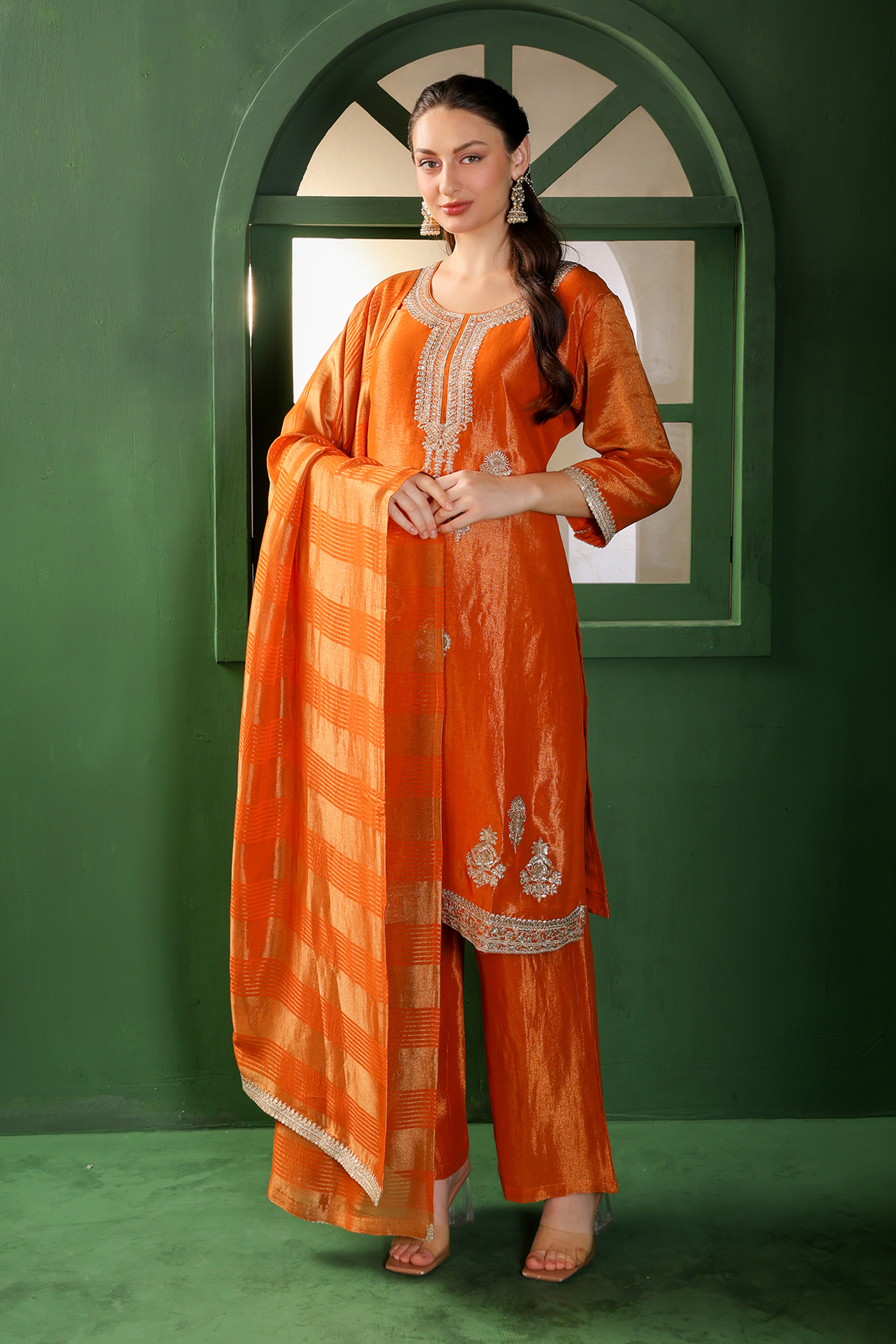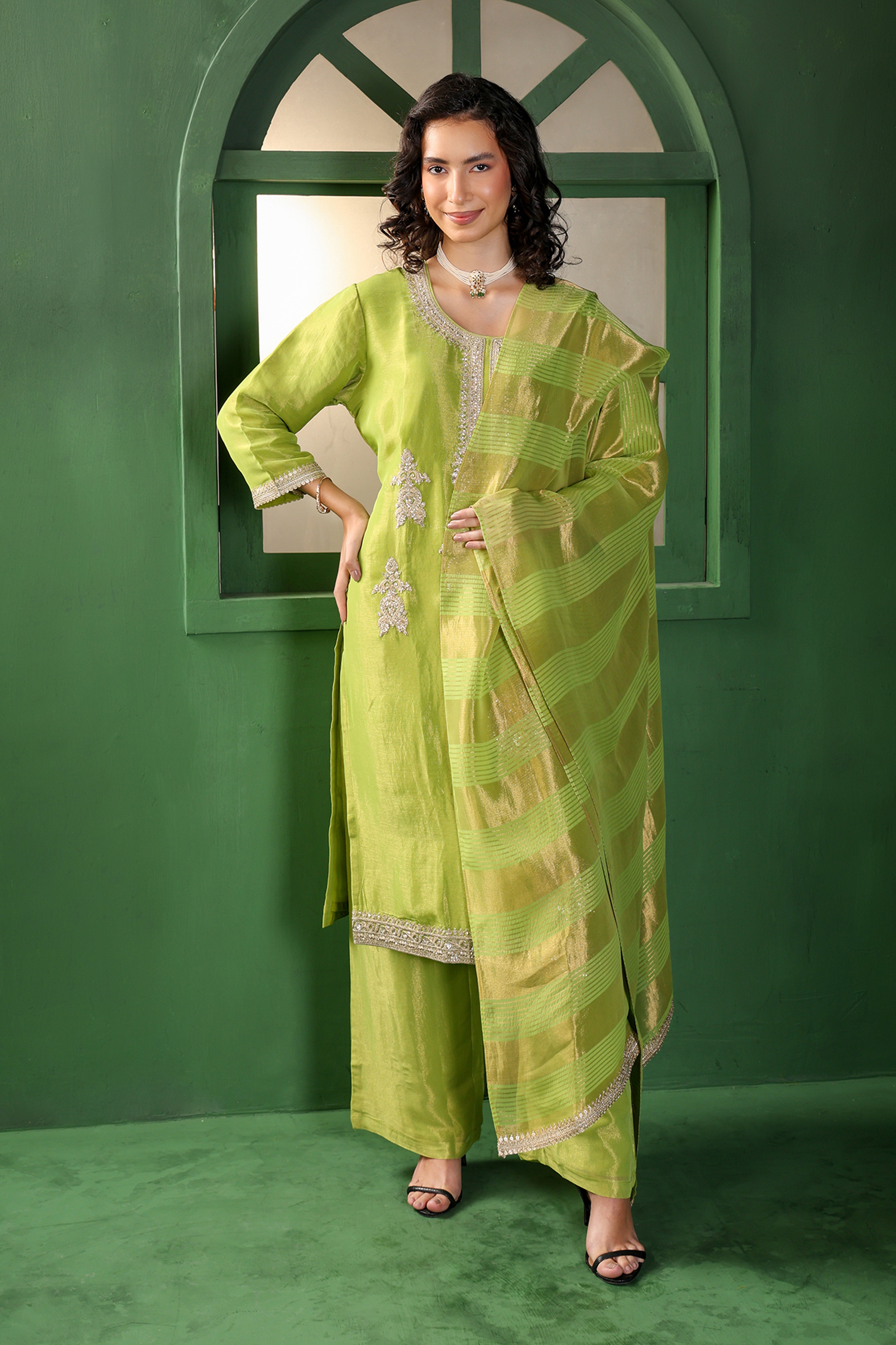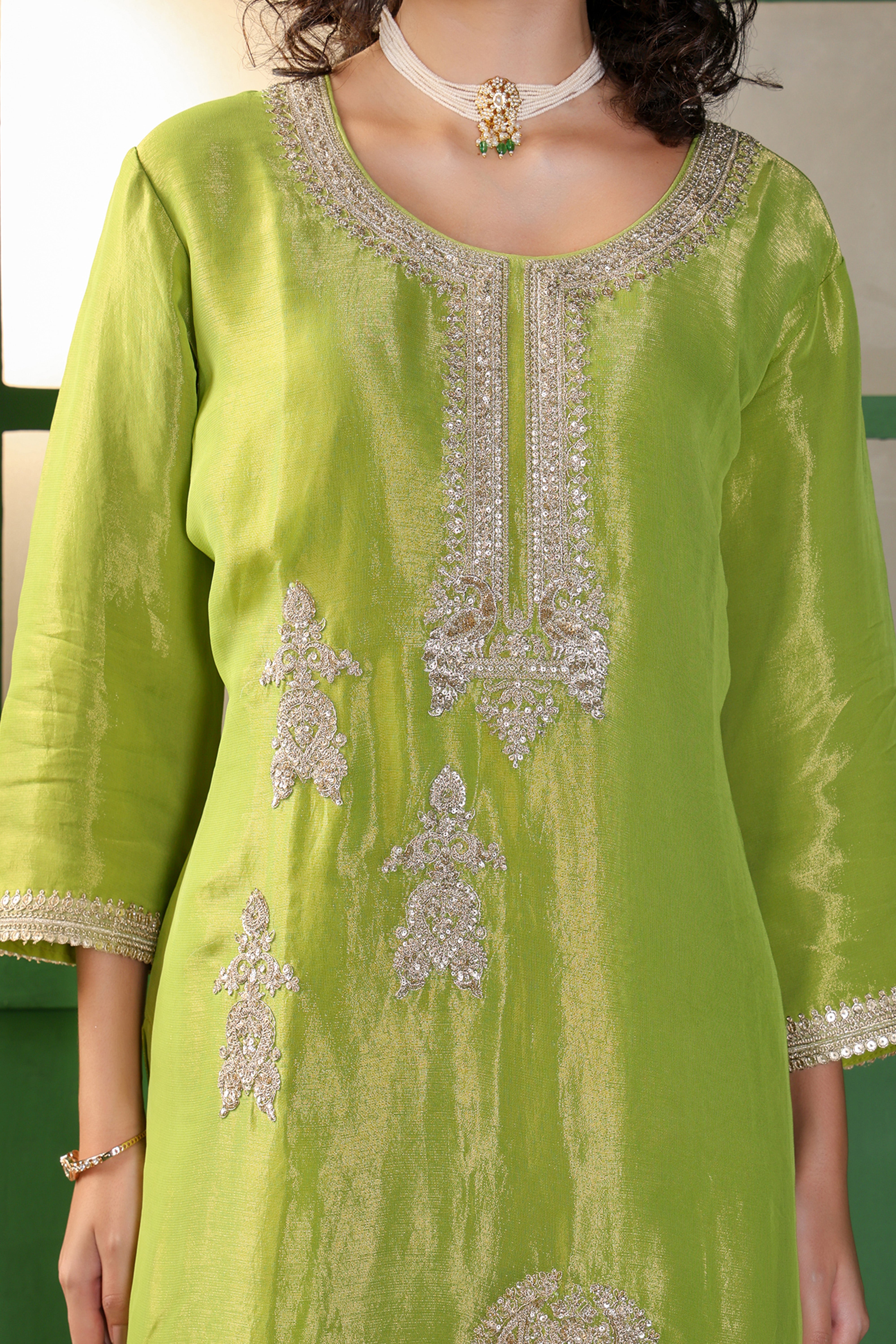 Step into refined elegance with this lime green silk kurta set, radiating understated luxury. The straight-cut kurta is adorned with delicate silver embroidery along the neckline and hem, paired beautifully with matching straight pants for a sleek silhouette. The highlight of the ensemble is the dupatta — featuring golden zari stripes that add a graceful sheen and festive charm. Perfect for daytime festivities, intimate celebrations, or elegant gatherings, this outfit strikes the ideal balance between subtle sophistication and timeless beauty.