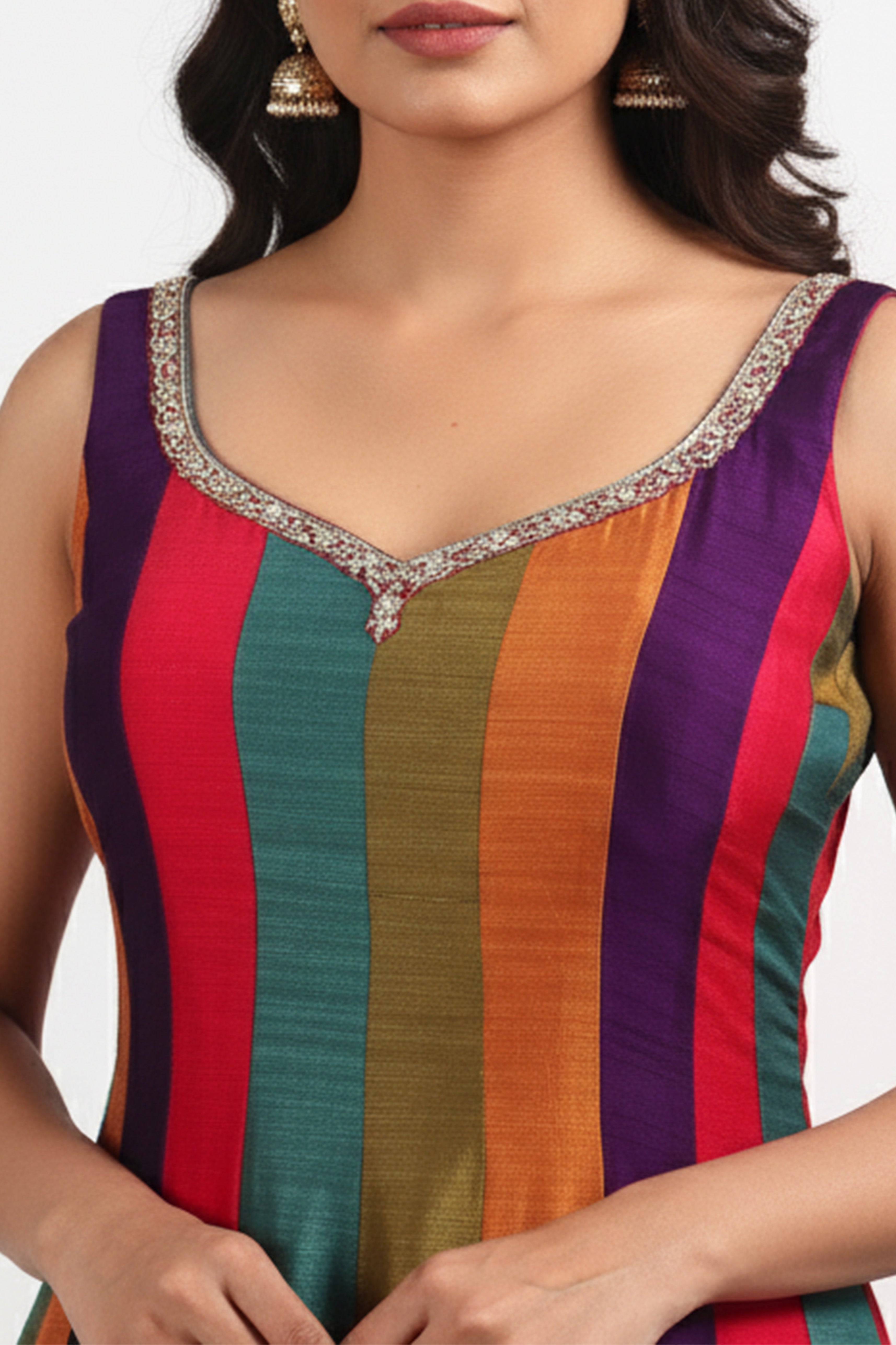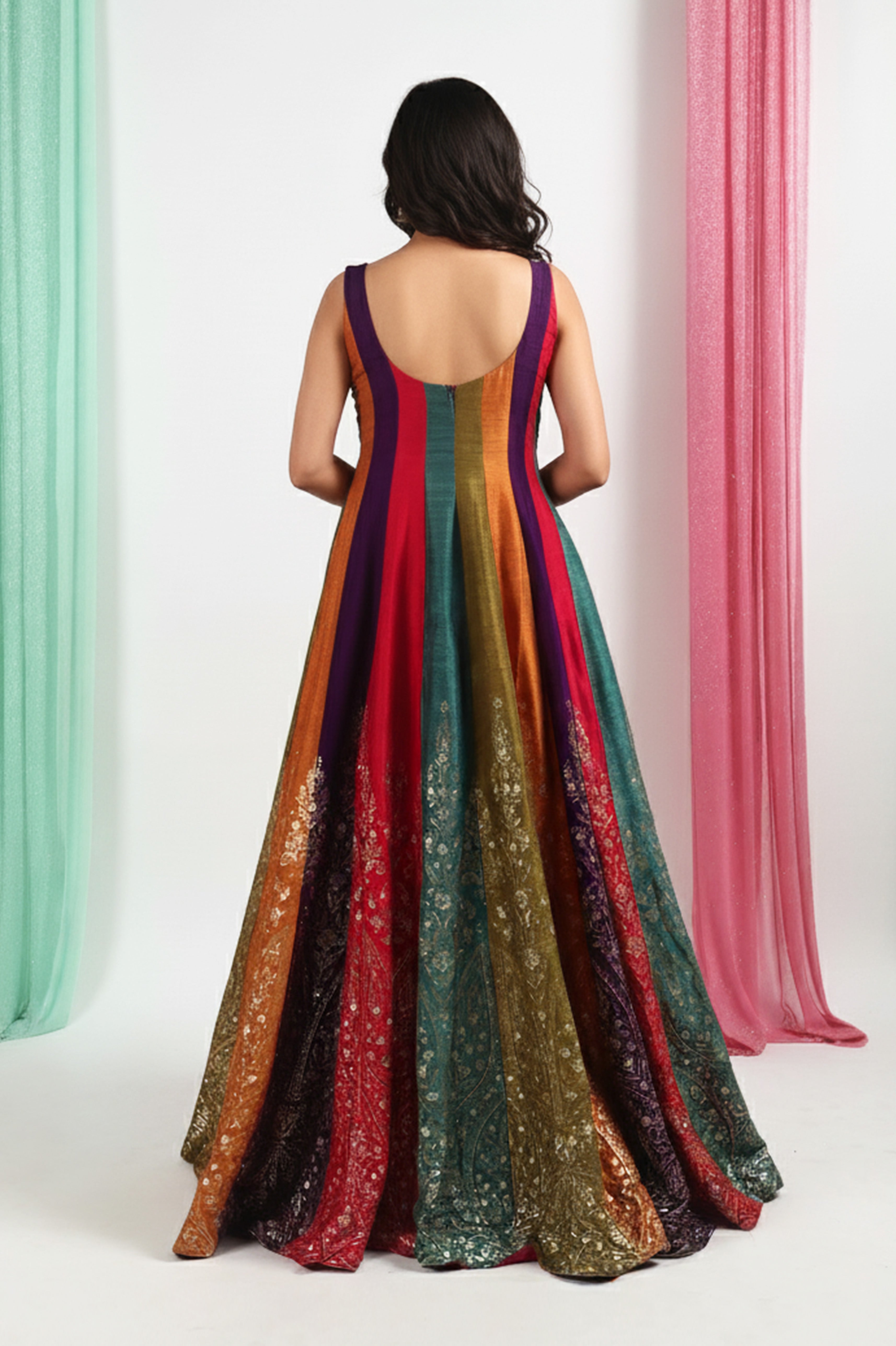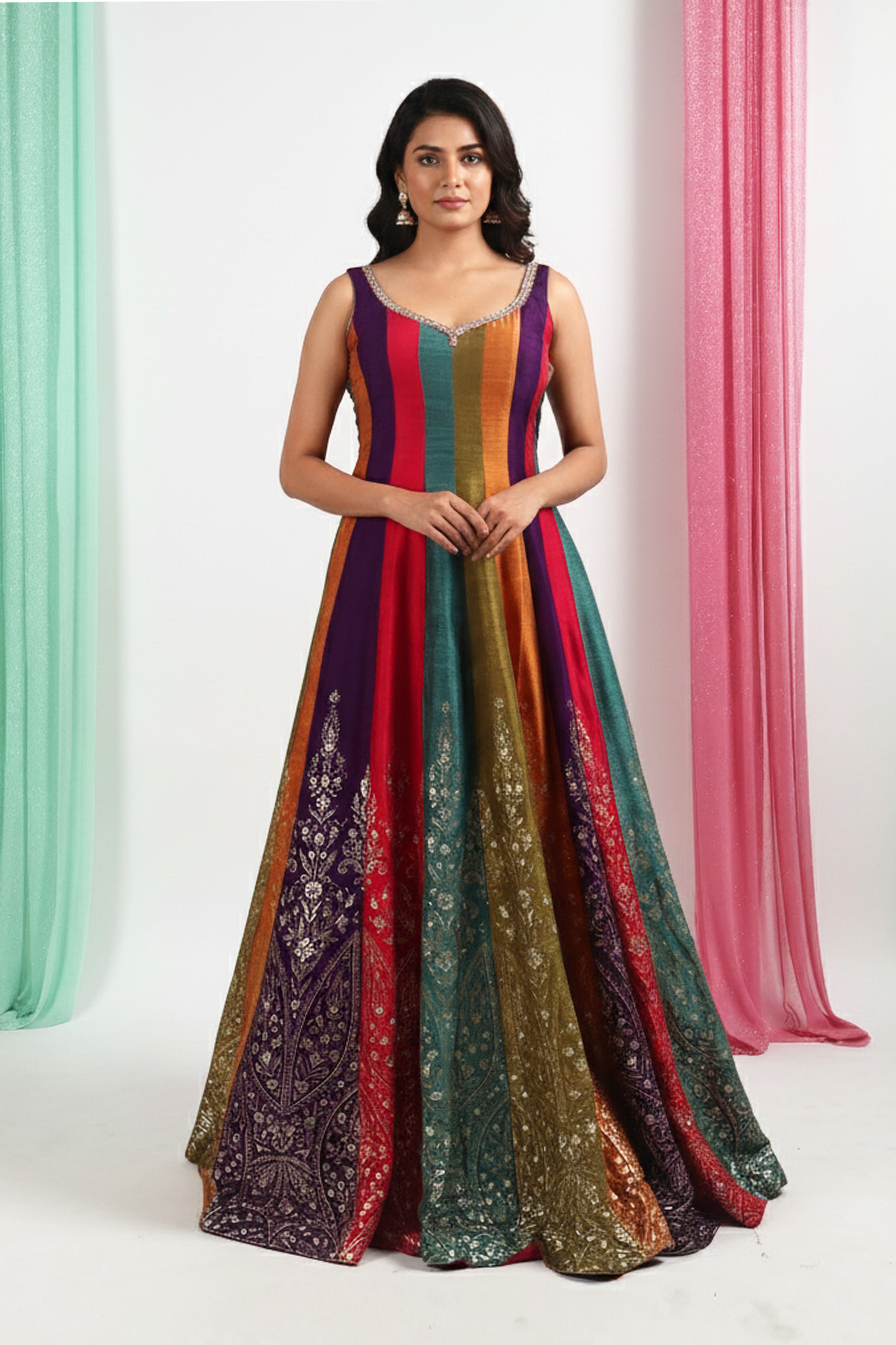 Refresh availabilityA vibrant and regal Anarkali set designed to make a statement at festive occasions. The outfit features rich vertical stripes in jewel tones — emerald green, deep purple, mustard, and rust — creating a stunning visual harmony. The flared skirt is adorned with intricate zari embroidery that adds a traditional charm. It is paired with a contrasting red dupatta embellished with delicate golden motifs and a detailed border, completing the look with elegance. Perfect for weddings, sangeet nights, and celebratory gatherings, this ensemble beautifully blends modern vibrance with ethnic grace.