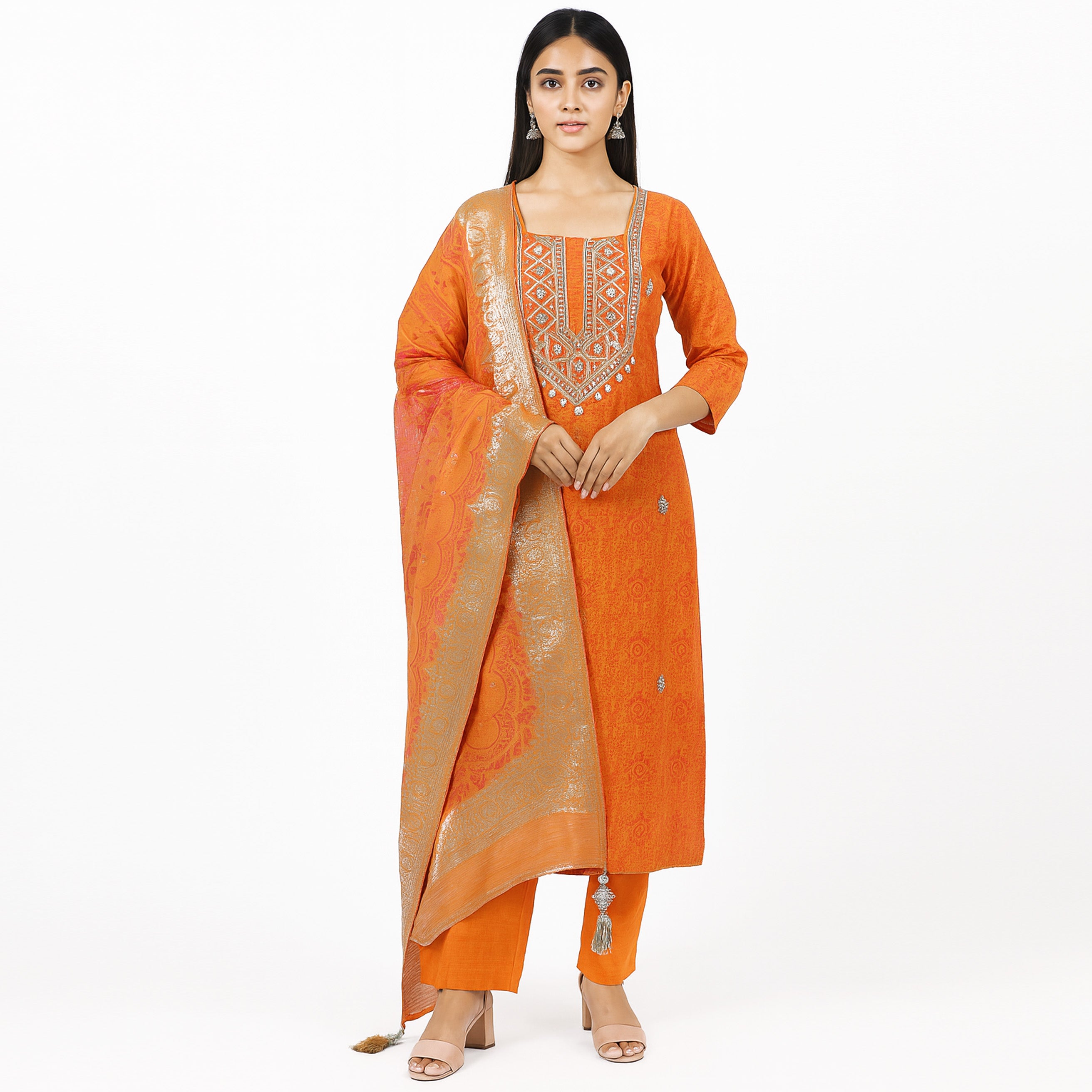 Refresh availabilityElevate your wardrobe with this Sunset Orange Unstitched Organza Suit, crafted for those who value elegance and versatility. The lightweight organza fabric offers a breathable, delicate texture that drapes beautifully. Ideal for customization, this unstitched suit lets you tailor a unique ensemble perfect for festive occasions or formal events. Its vibrant sunset orange hue adds warmth and sophistication to your style, ensuring a standout look with every wear.