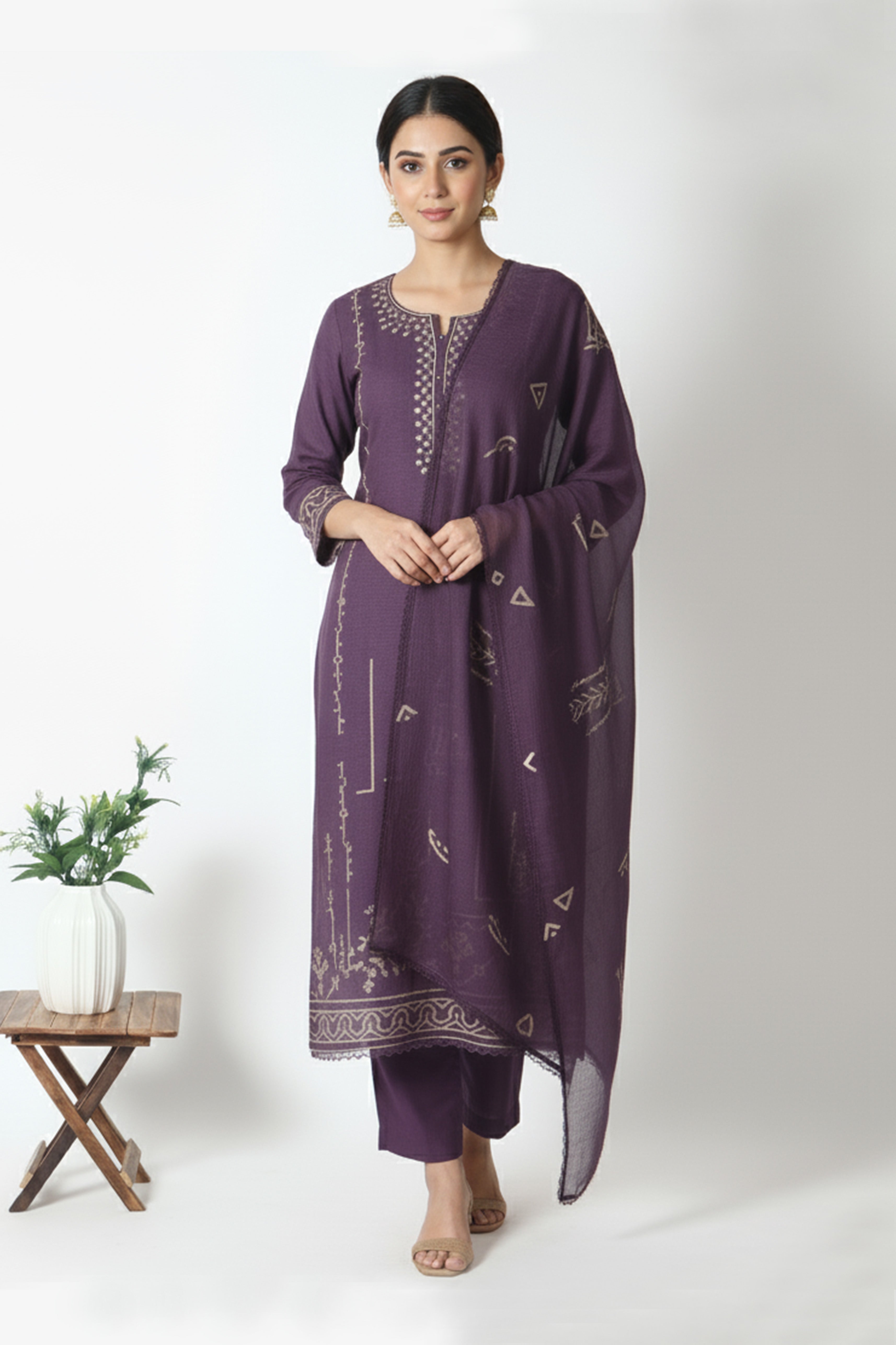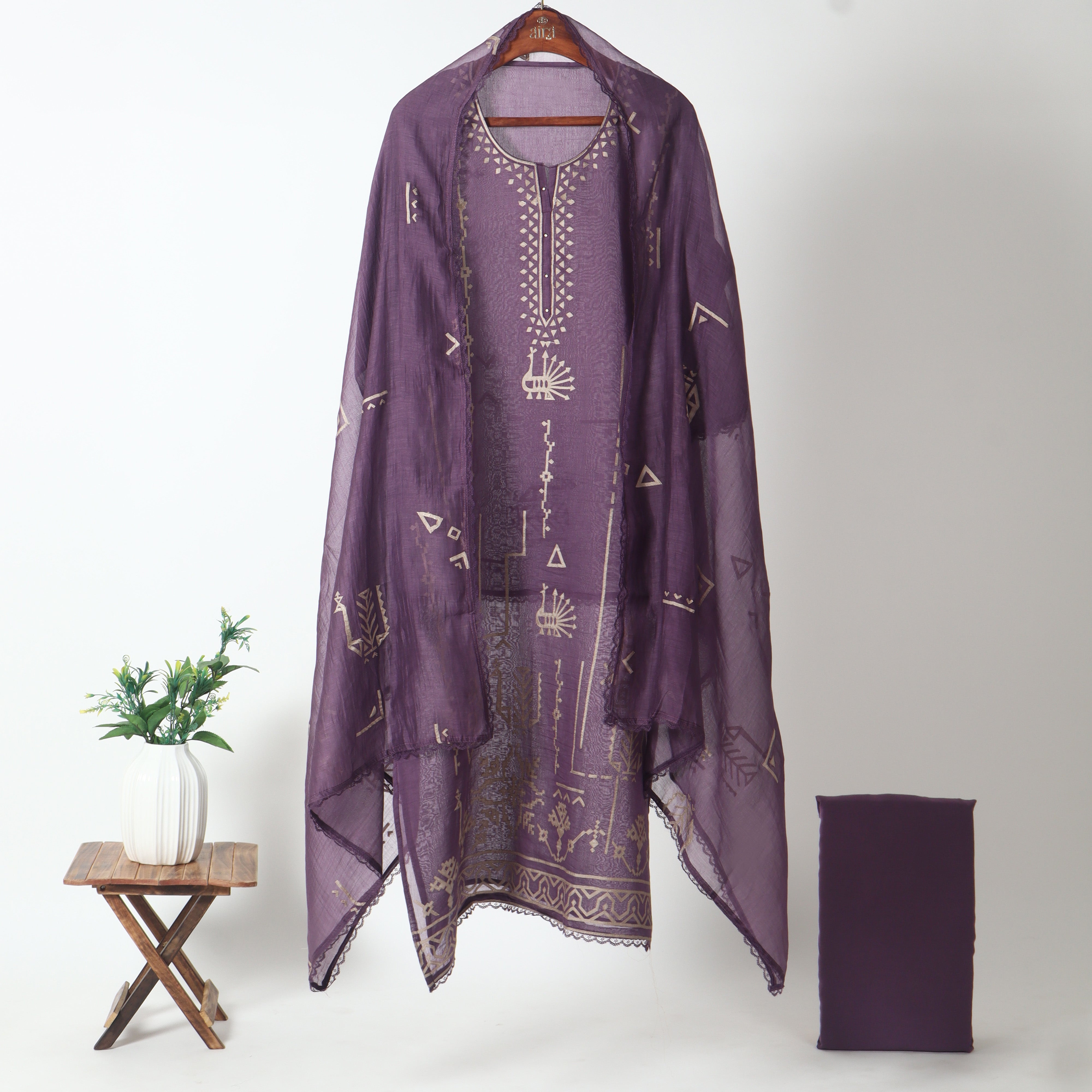 Refresh availabilityThis semi-stitched Chanderi suit exudes refined elegance with its soft plum tone and intricate thread embroidery. Crafted from premium Chanderi fabric, it features a beautifully detailed neckline and border that elevate its graceful appeal. The semi-stitched design allows easy customization for a perfect fit. Paired with a coordinated embroidered dupatta and plain bottom fabric, this ensemble is ideal for festive occasions, celebrations, and elegant daytime events.