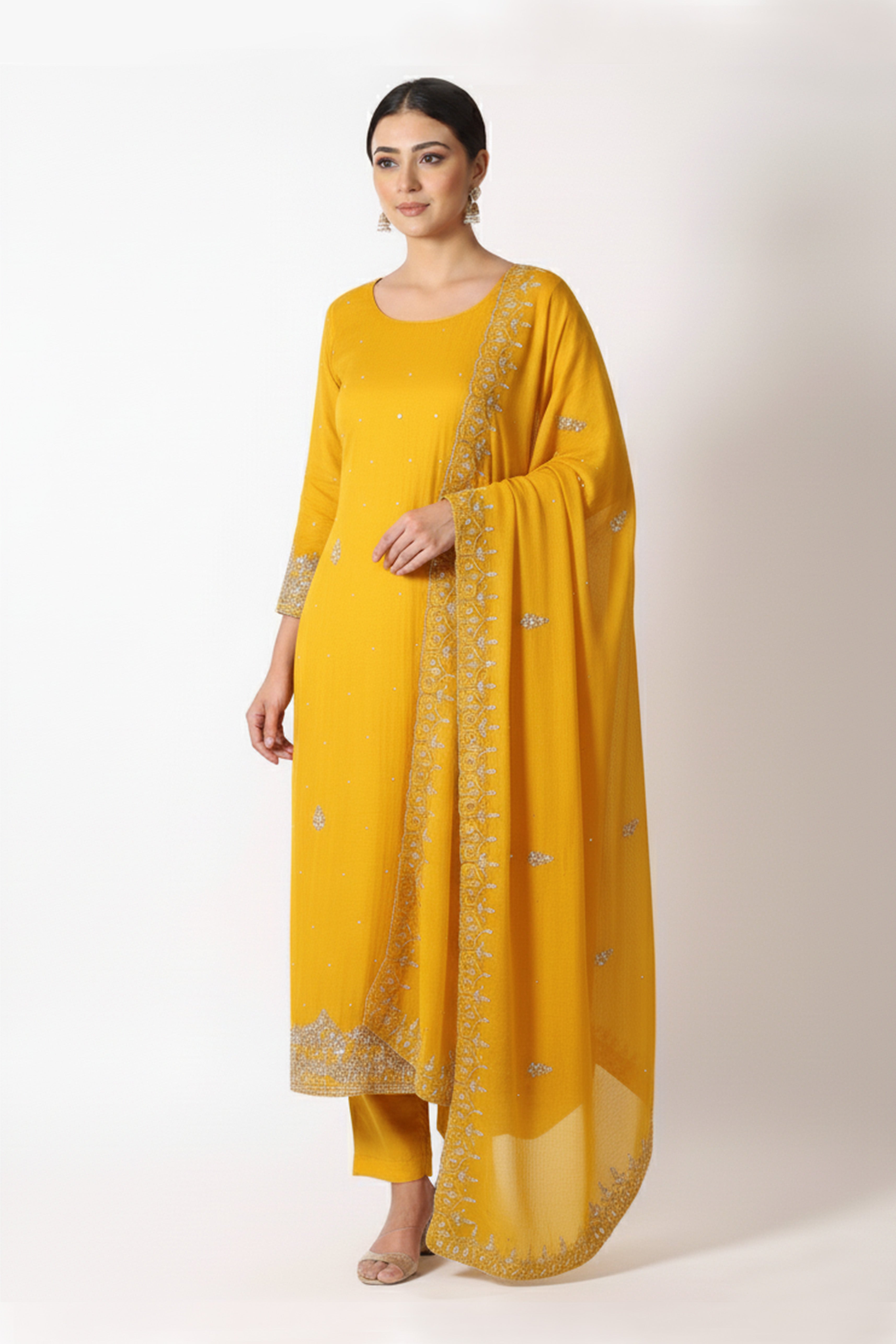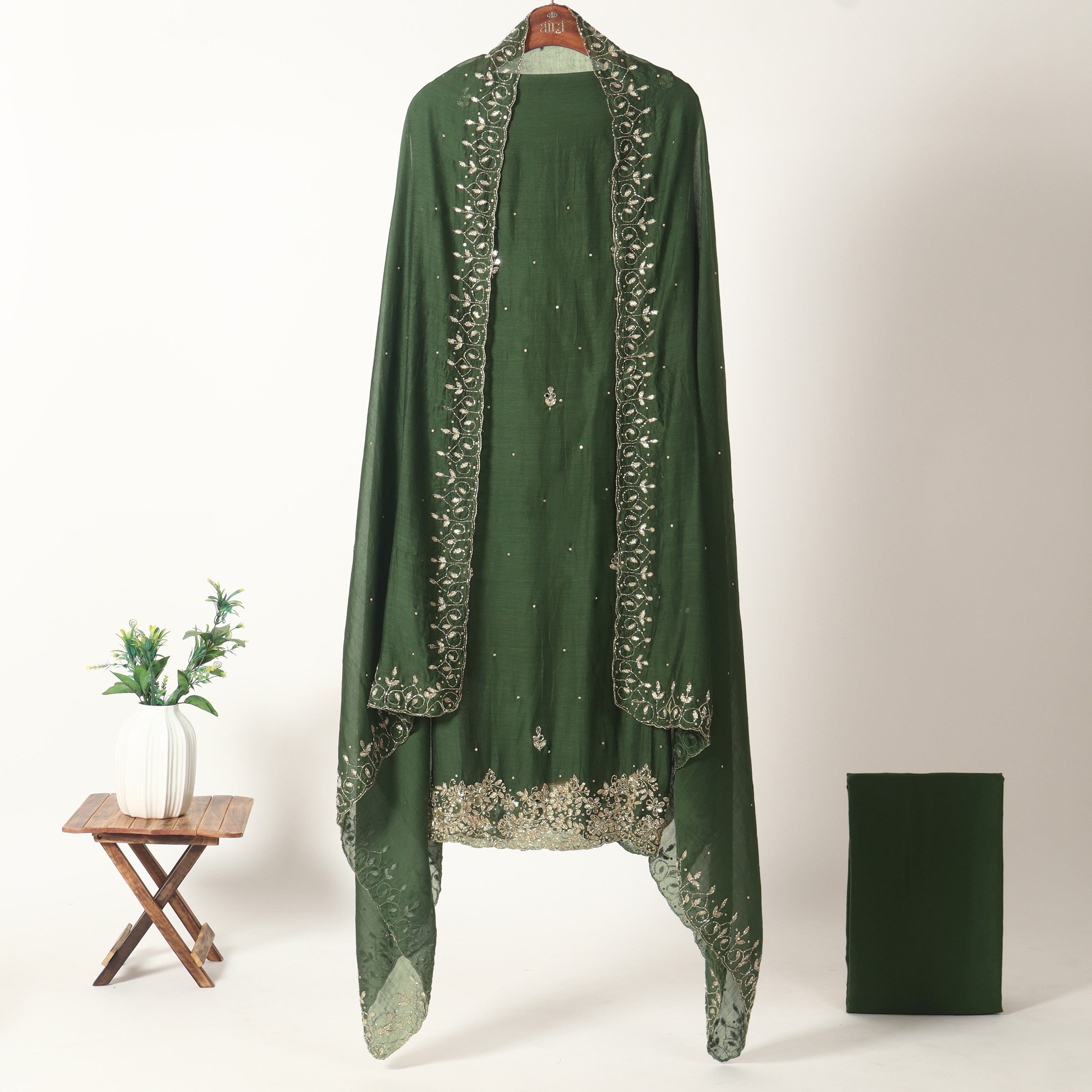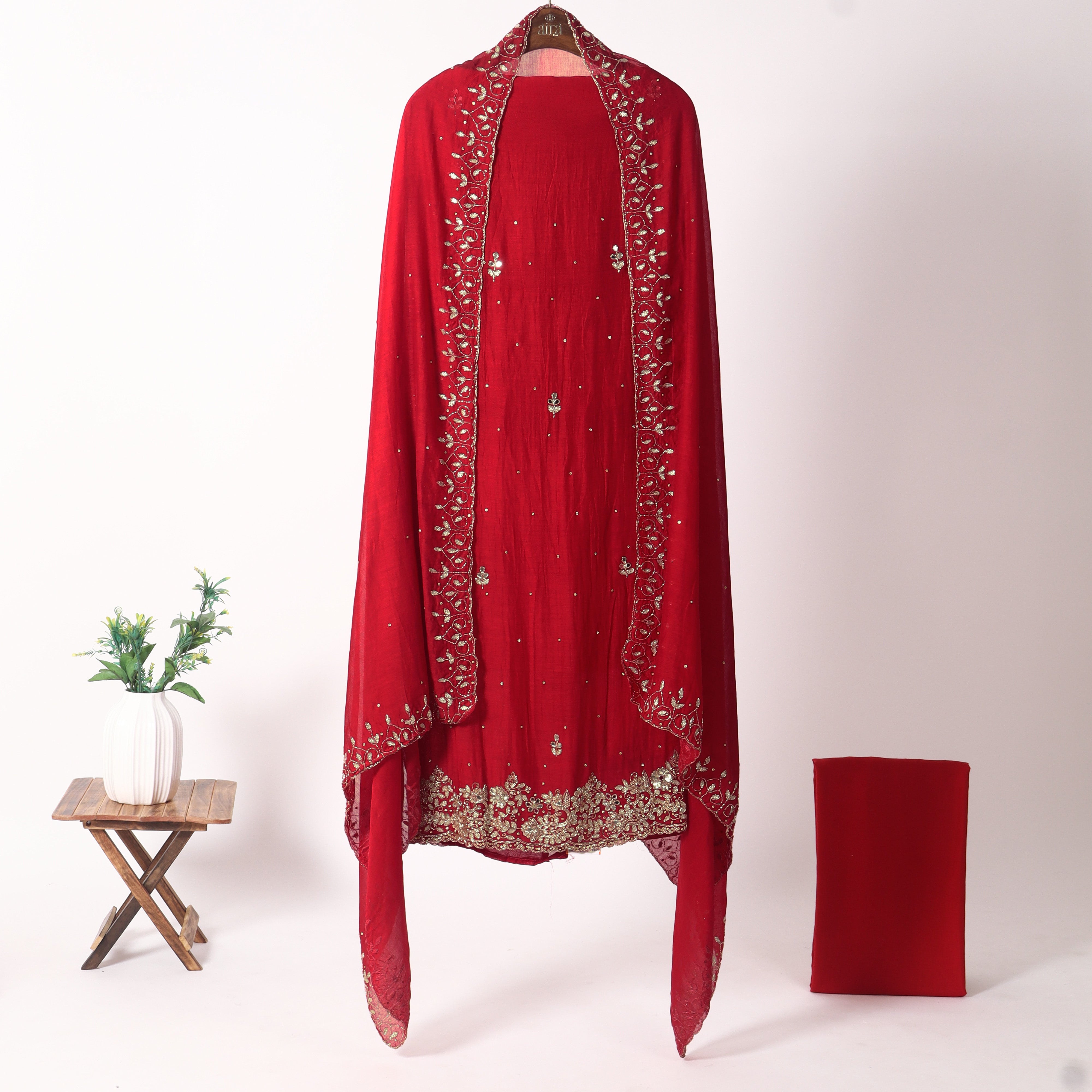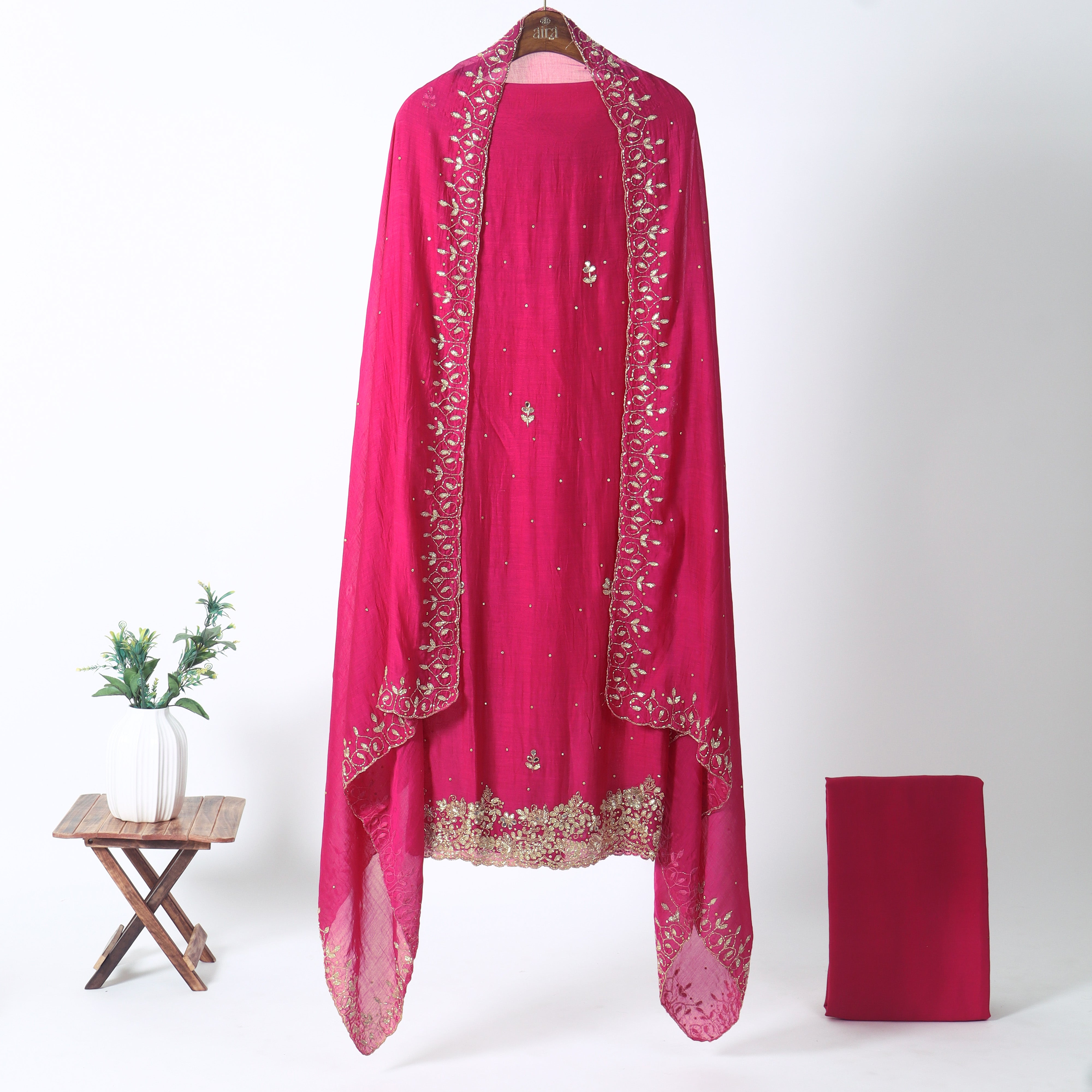 Refresh availabilityEmbrace timeless elegance with this unstitched Chanderi suit, crafted from a rich blend of silk and cotton for a soft yet lustrous feel. The fabric features a subtle sheen and lightweight texture, perfect for festive occasions or daytime celebrations. Its classic weave and intricate detailing lend a traditional charm, making it ideal for stitching into elegant suits, kurtas, or ethnic ensembles that exude sophistication and grace.