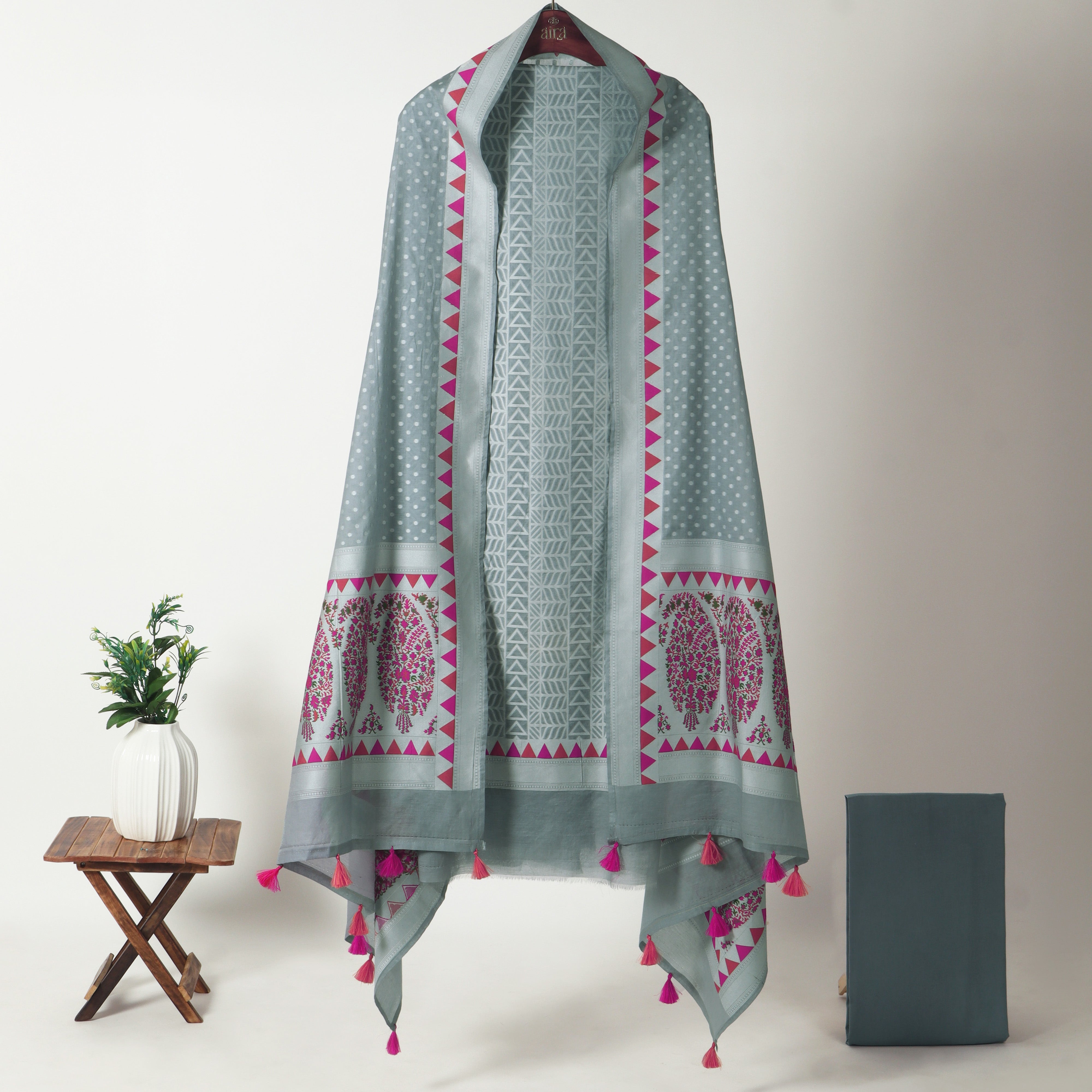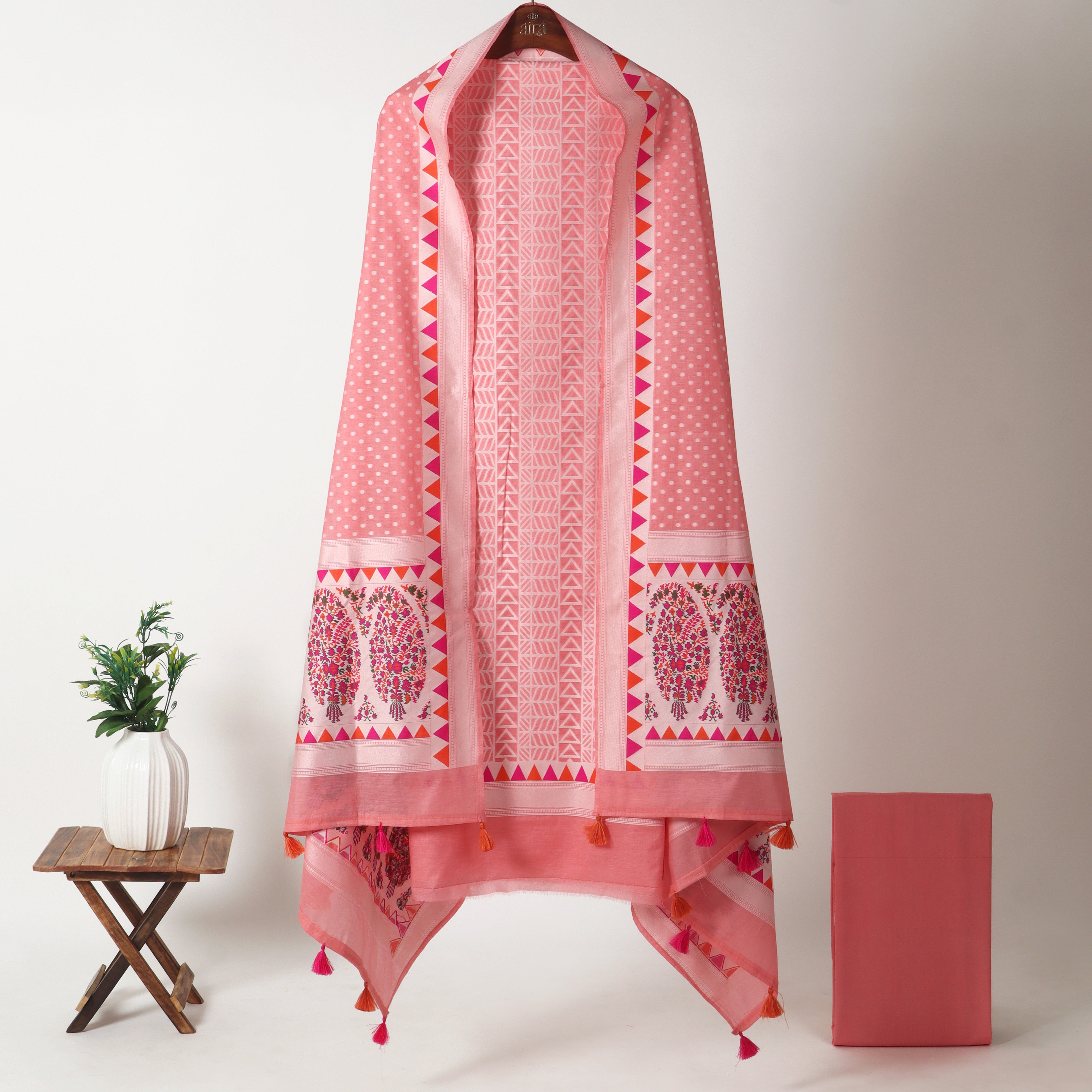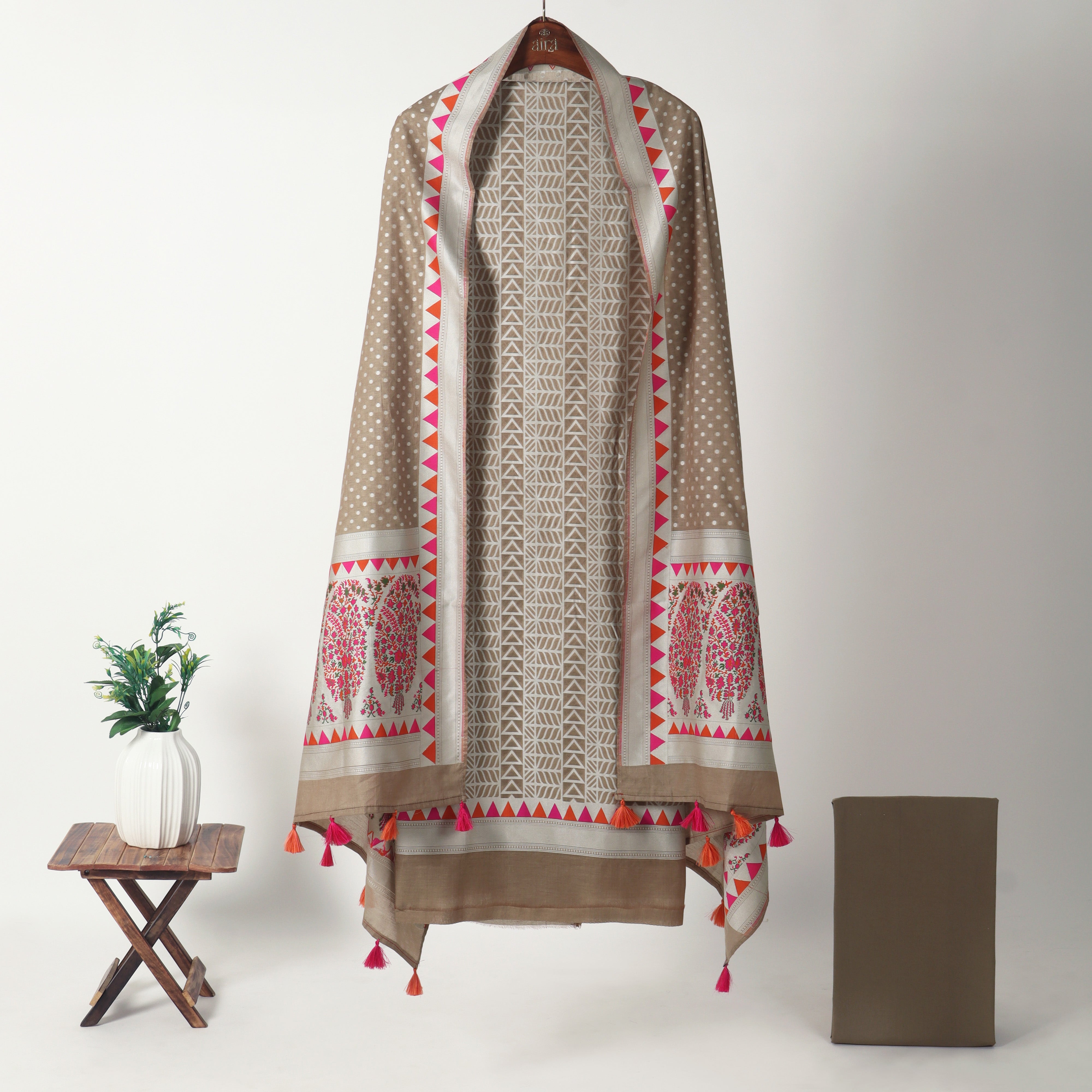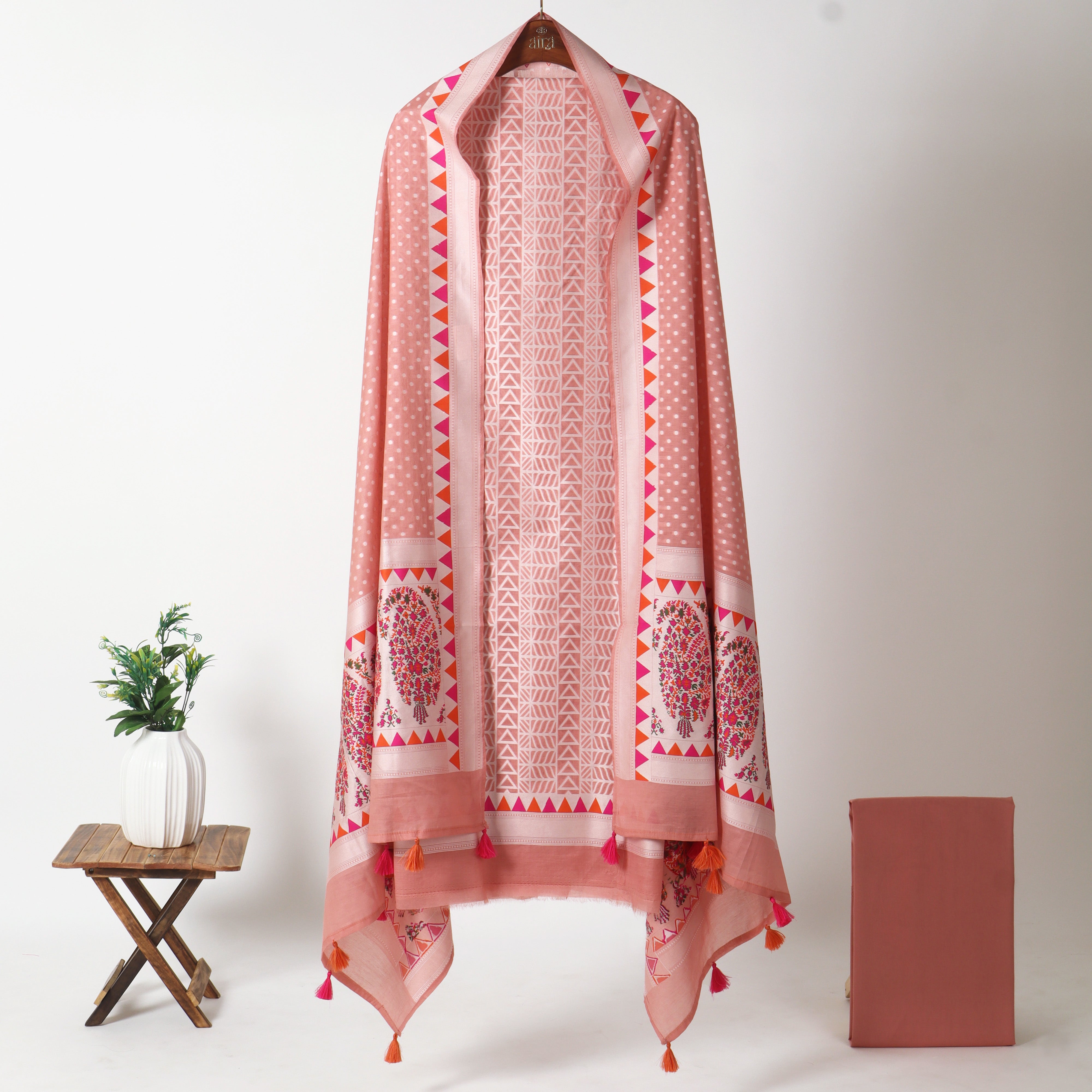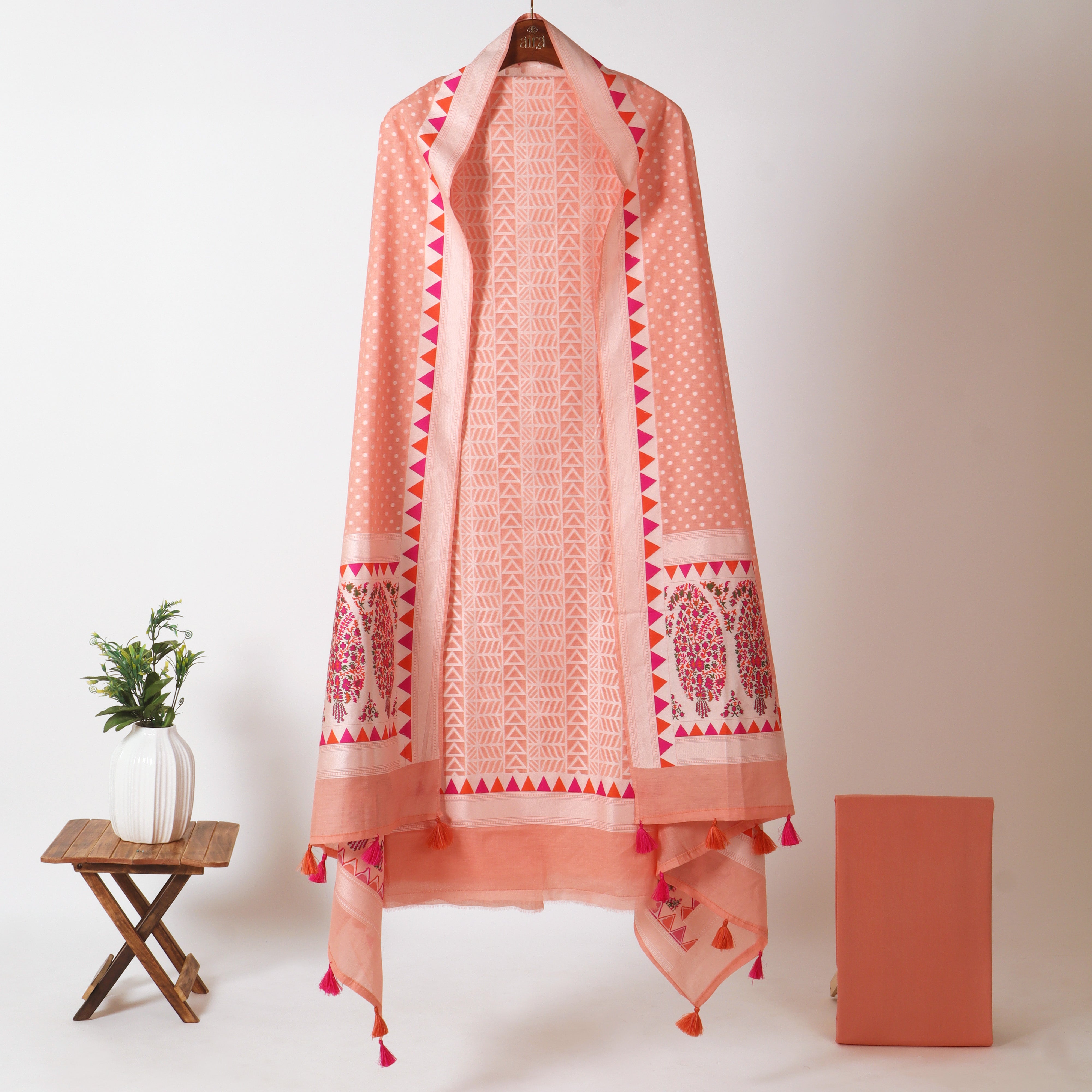 Refresh availabilityExperience the charm of tradition and elegance with this Unstitched Chanderi Suit, beautifully woven from luxurious Chanderi fabric known for its lightweight texture and subtle sheen. The kurta fabric features delicate embroidery and intricate zari or threadwork, reflecting timeless craftsmanship and cultural richness.