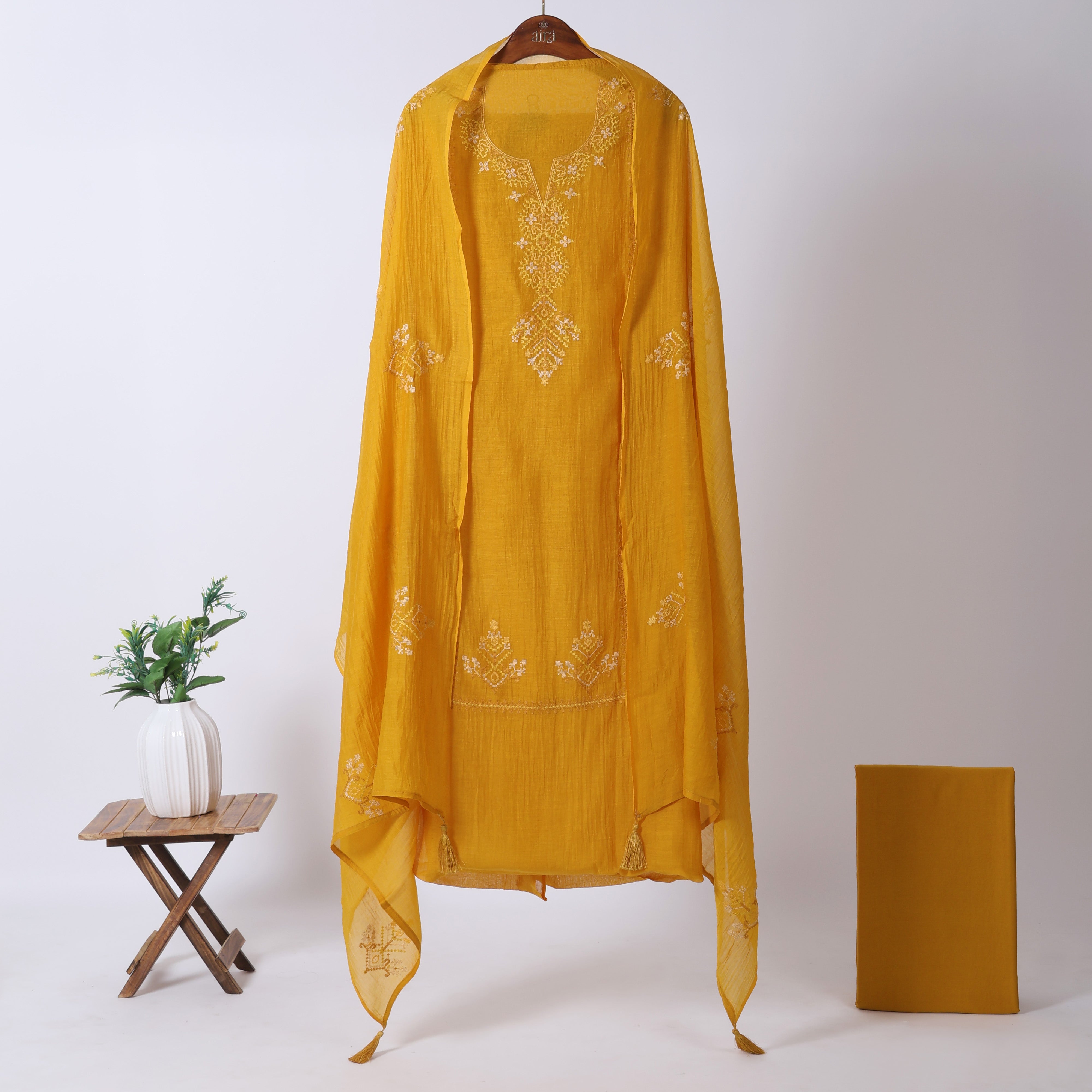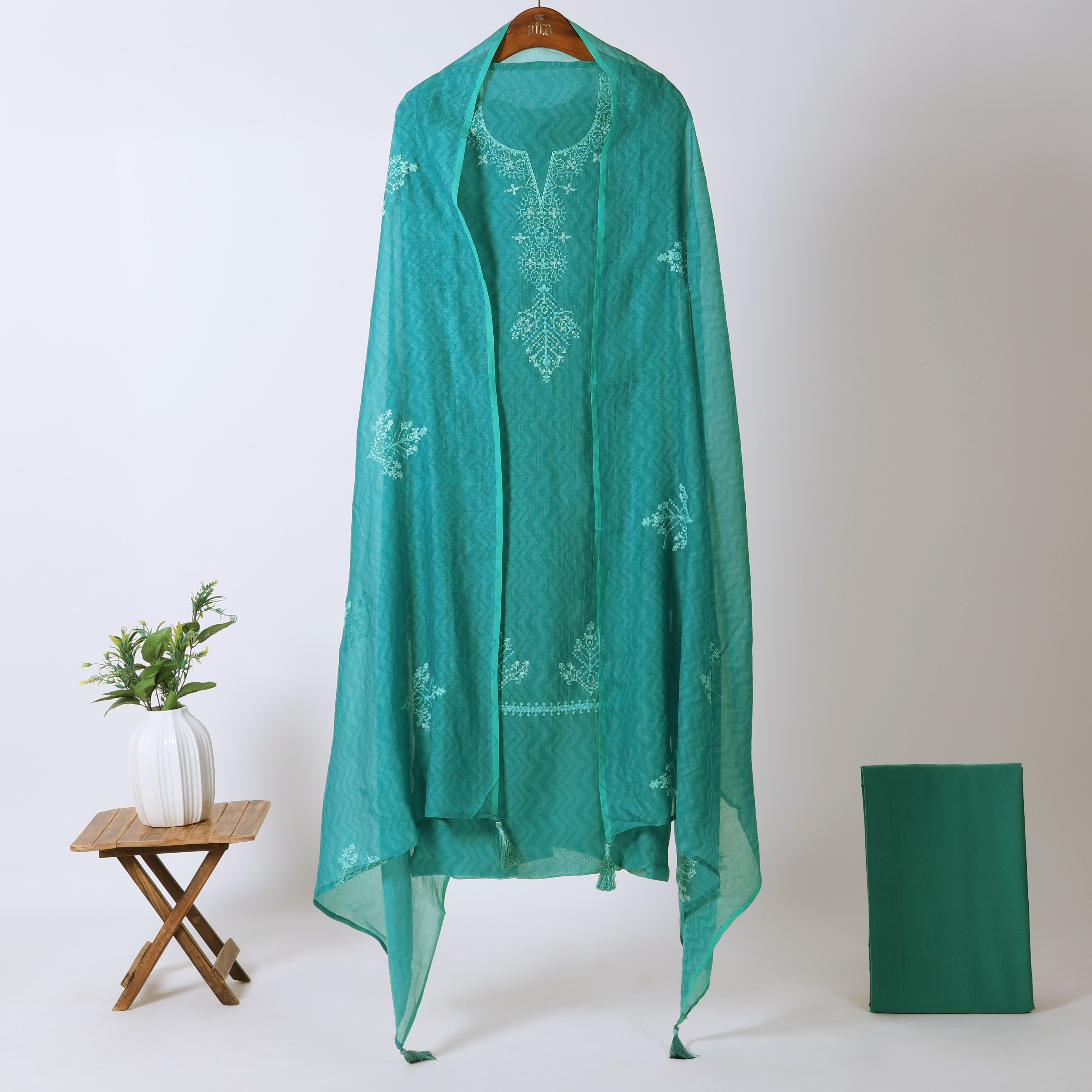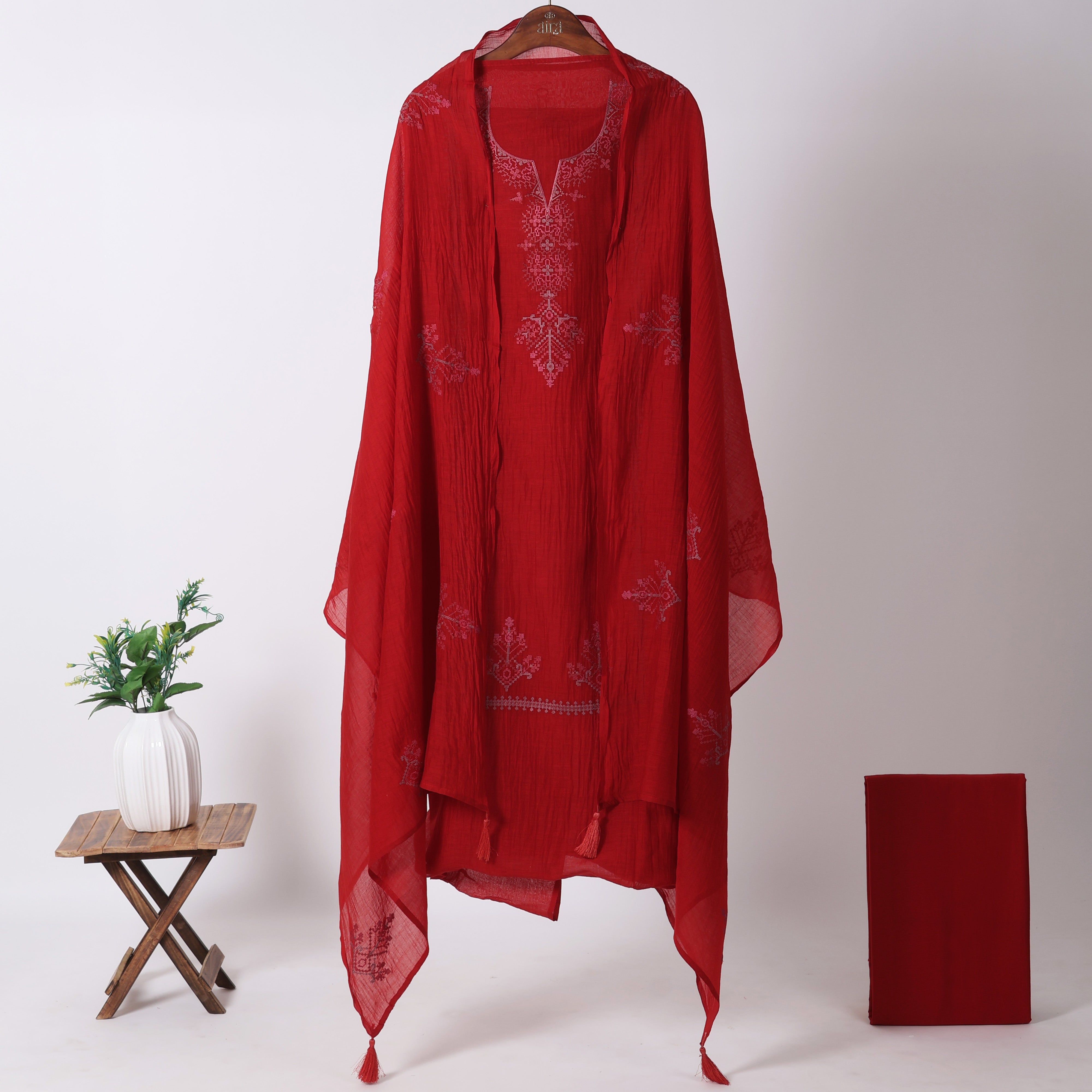 Accompanied by a coordinated dupatta featuring delicate borders or motifs and a matching bottom fabric, this suit allows you to personalize the fit and silhouette as per your style. Perfect for festive occasions, cultural gatherings, or elegant day events, it embodies refined sophistication and classic charm.