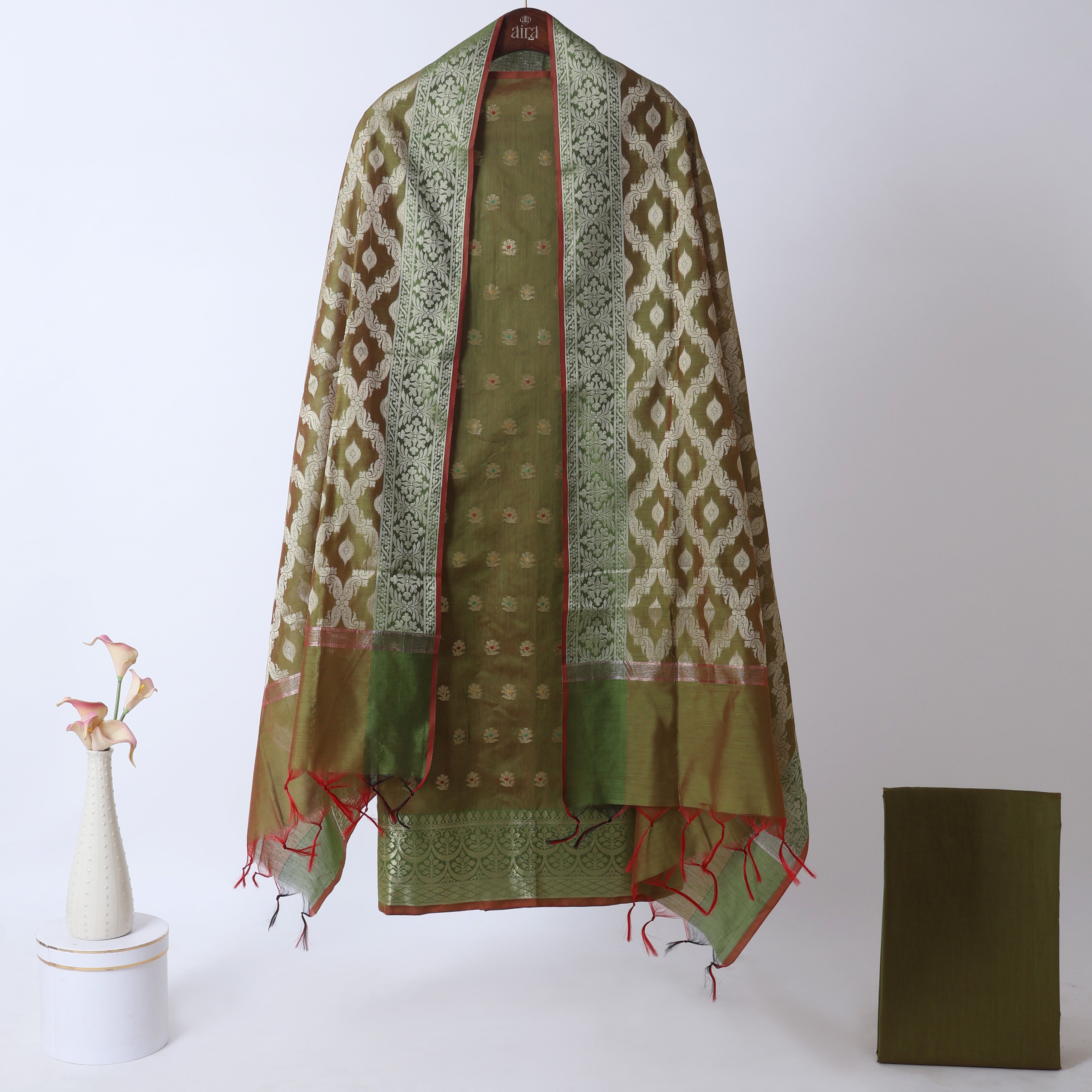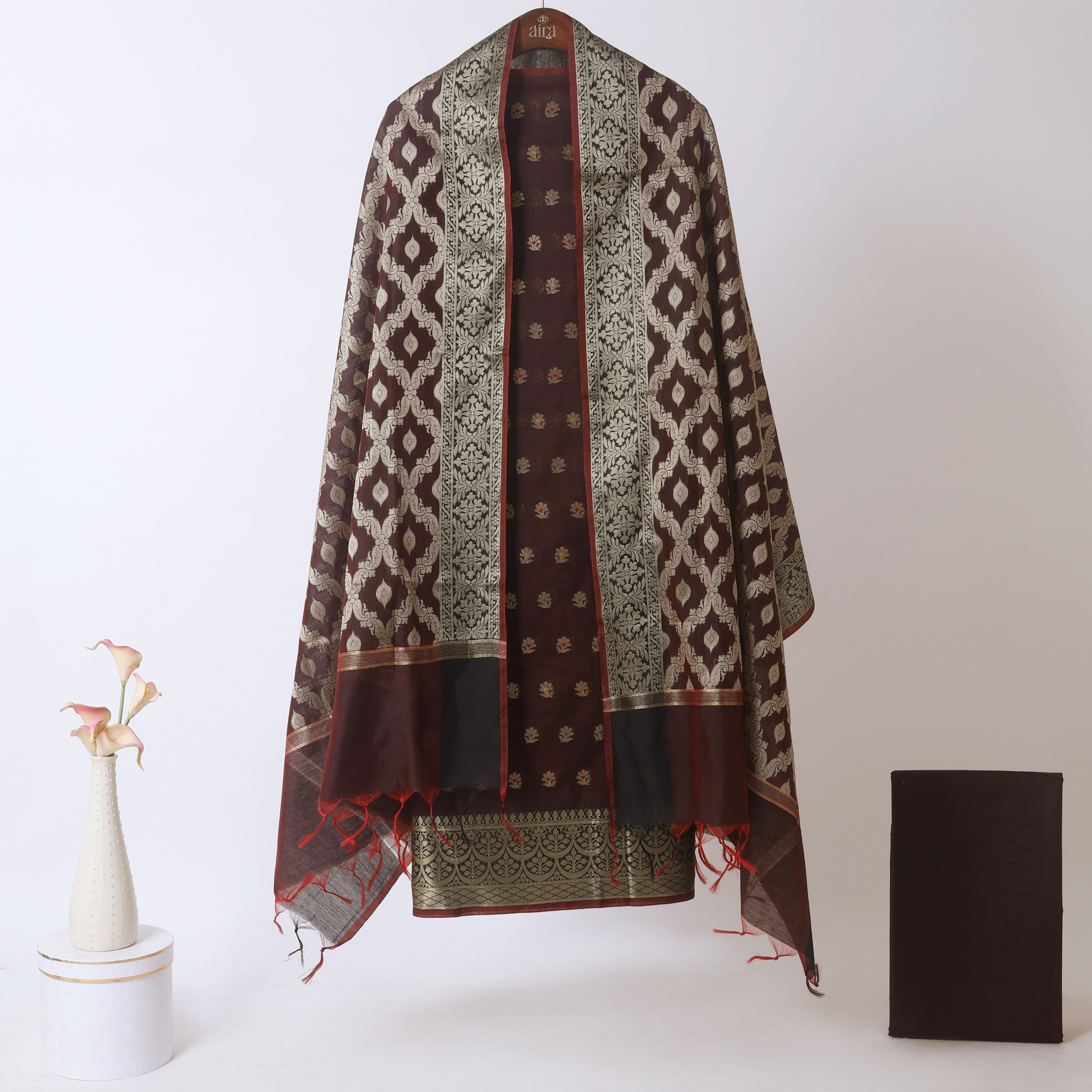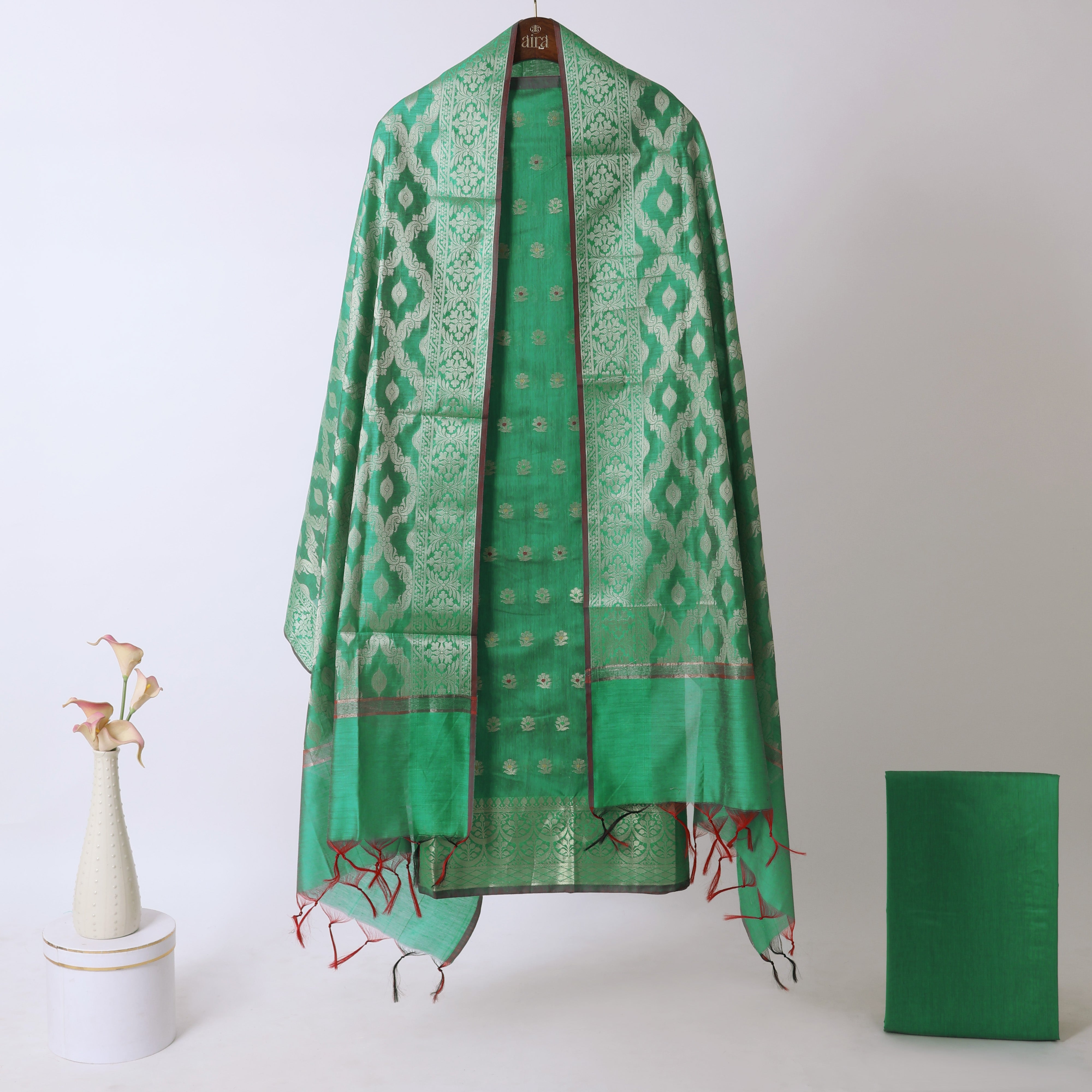 Refresh availabilityA timeless blend of tradition and elegance, this Unstitched Chanderi Suit is crafted from luxurious Chanderi fabric known for its lightweight texture and subtle sheen. The fabric drapes beautifully, offering both comfort and sophistication. Ideal for festive wear and special occasions, it can be tailored to your desired style — from classic silhouettes to contemporary designs. Perfect for those who appreciate refined grace and effortless charm.