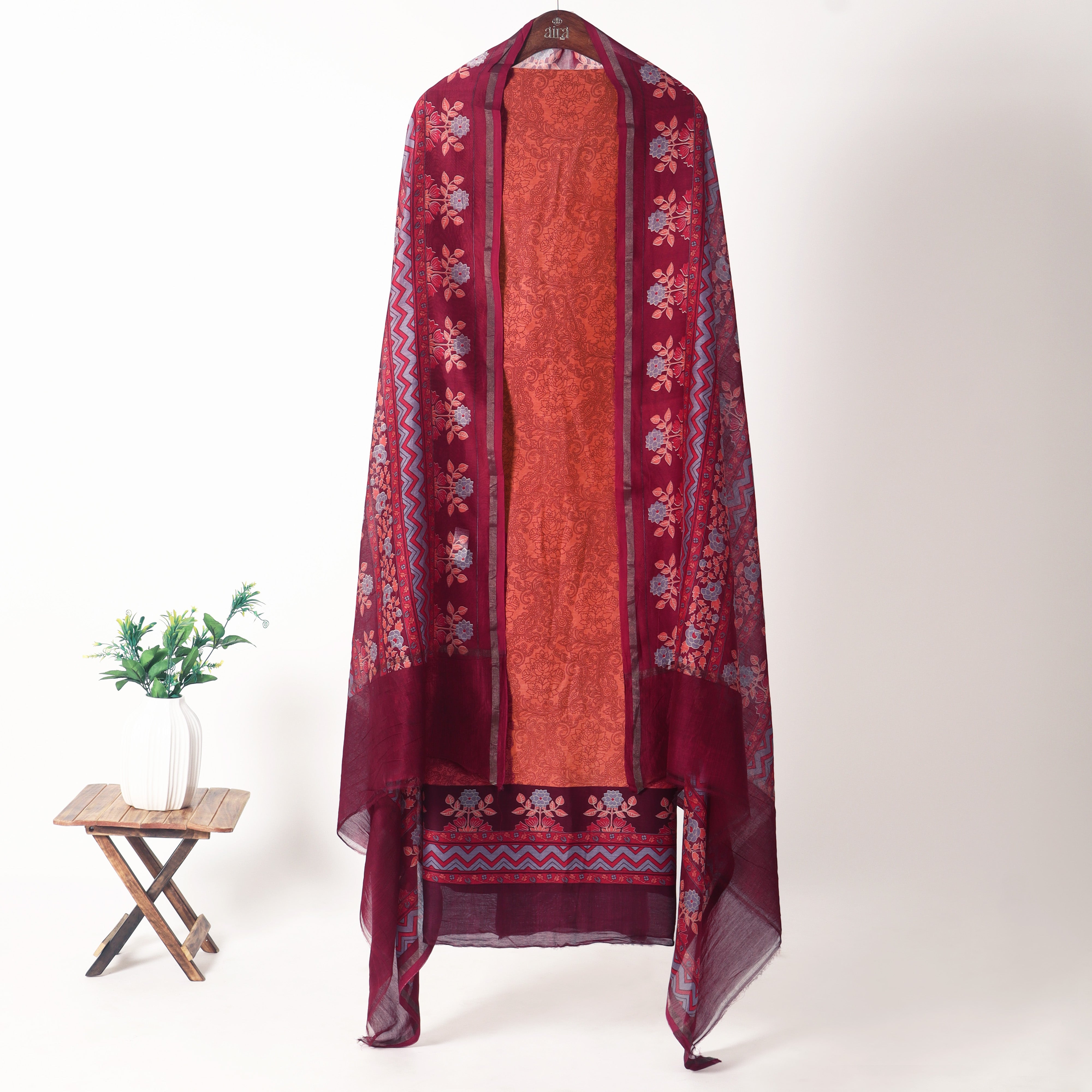 Refresh availabilityDiscover refined elegance with our Unstitched Chanderi Suit, crafted from lightweight fabric that offers a soft shine and graceful drape. Comfortable to wear and easy to tailor, this set includes a matching bottom and dupatta, making it perfect for festive and traditional occasions.