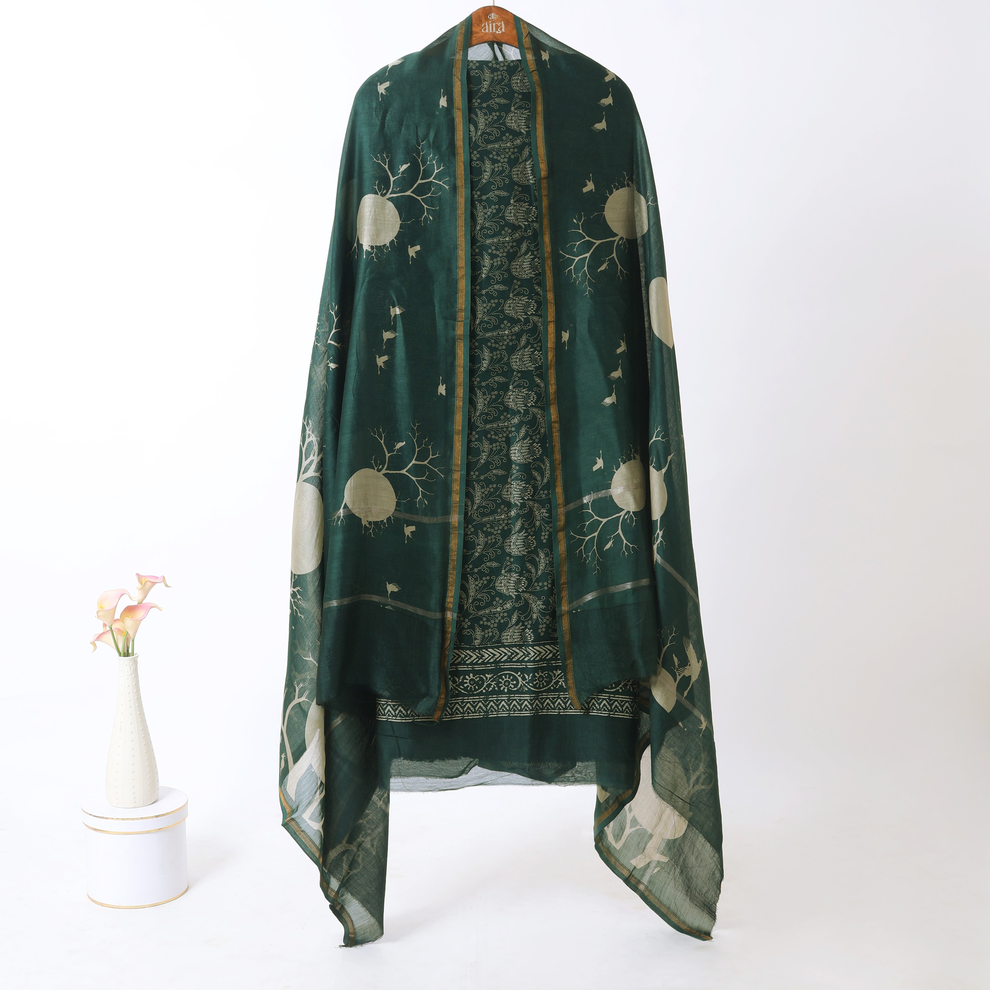 Refresh availabilityCrafted from the timeless elegance of Chanderi, this suit features a soft, lightweight texture with a graceful sheer finish. The fabric drapes beautifully and carries a subtle, natural sheen that adds sophistication to every look. Designed for comfort and charm, it's ideal for festive gatherings, family functions, or everyday ethnic grace. Style it with delicate accessories for a refined and effortless statement.